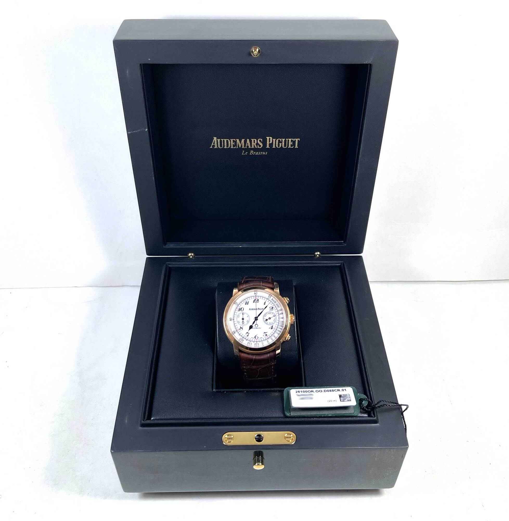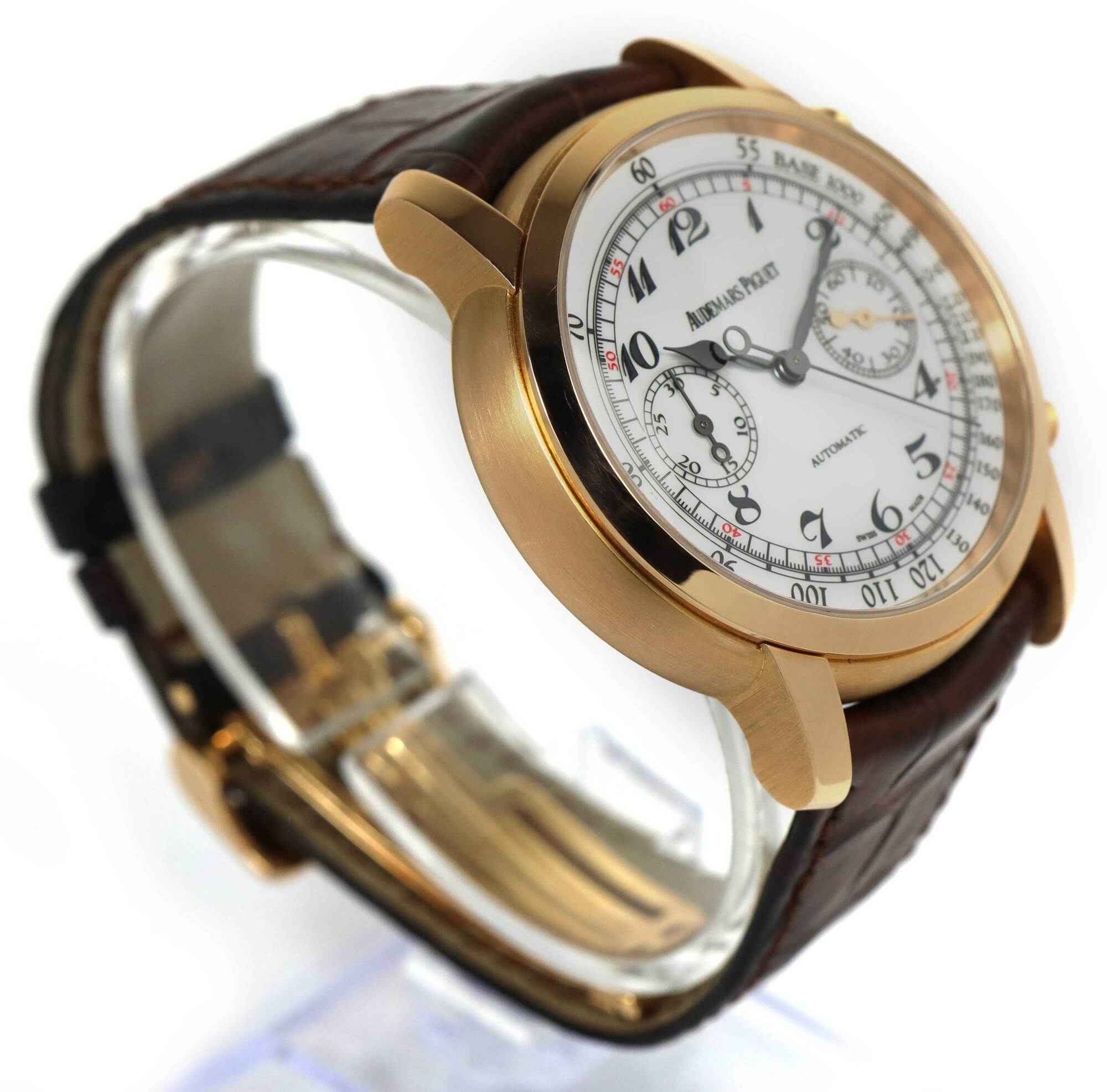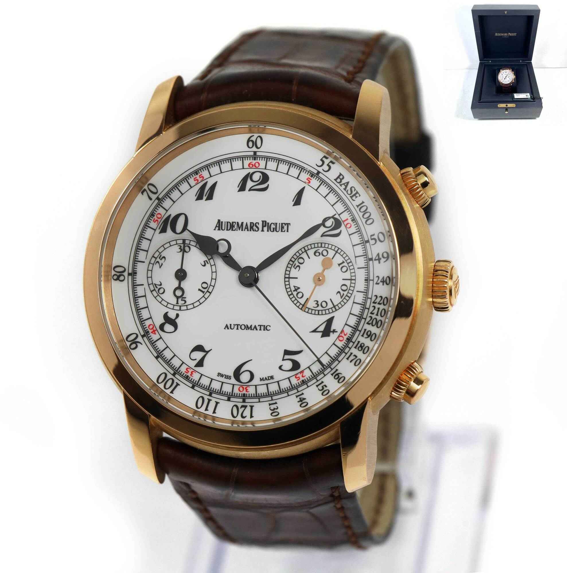 Read Morethis audemars piguet is in excellent condition and comes with its box and hang tang only as shown in the pictures attached. This watch features a 41mm 18k rose gold case that surrounds a white dial and comes on a brown alligator strap with an 18k rose gold deployant clasp. The watch functions include hours, minutes, small seconds and chronograph. This watch is in stock and available to ship immediately!