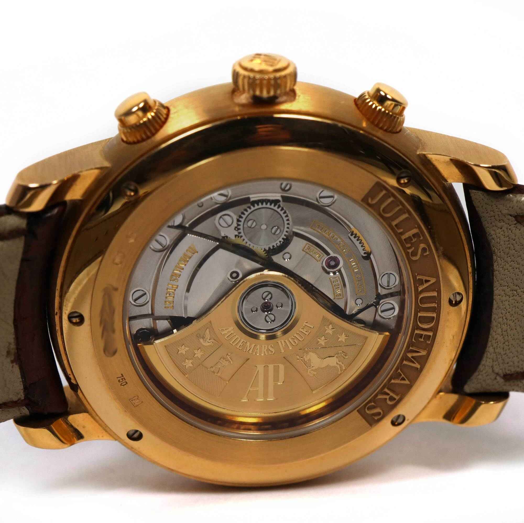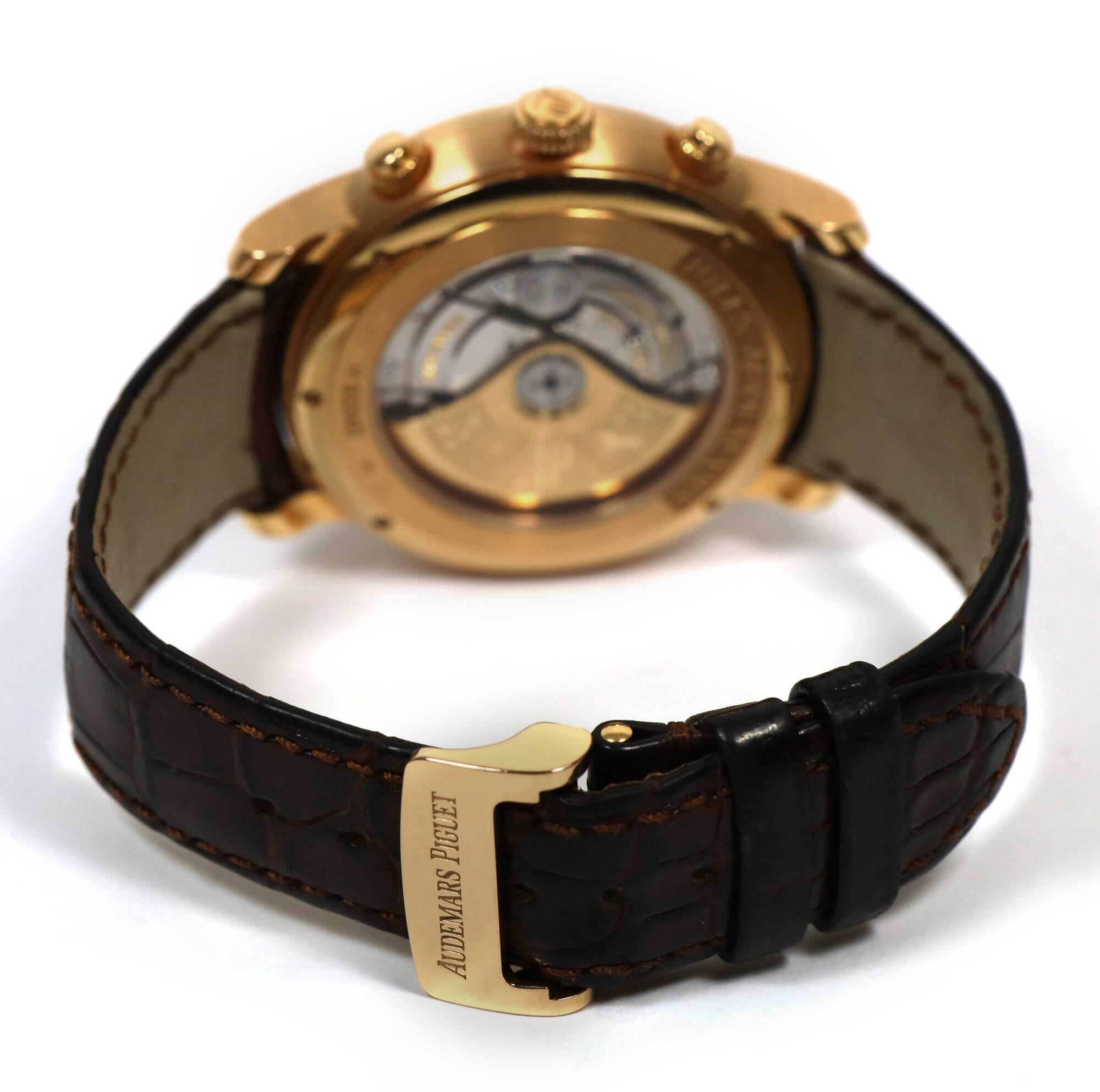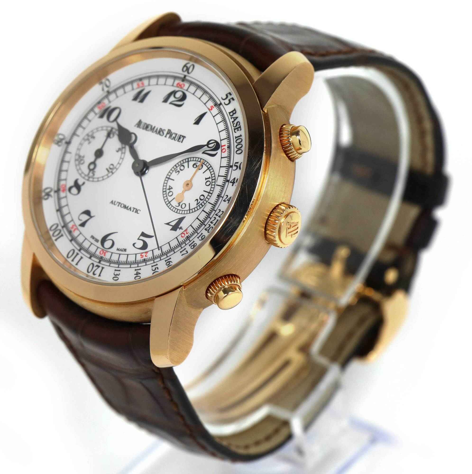 Read Morethis audemars piguet is in excellent condition and comes with its box and hang tang only as shown in the pictures attached. This watch features a 41mm 18k rose gold case that surrounds a white dial and comes on a brown alligator strap with an 18k rose gold deployant clasp. The watch functions include hours, minutes, small seconds and chronograph. This watch is in stock and available to ship immediately!