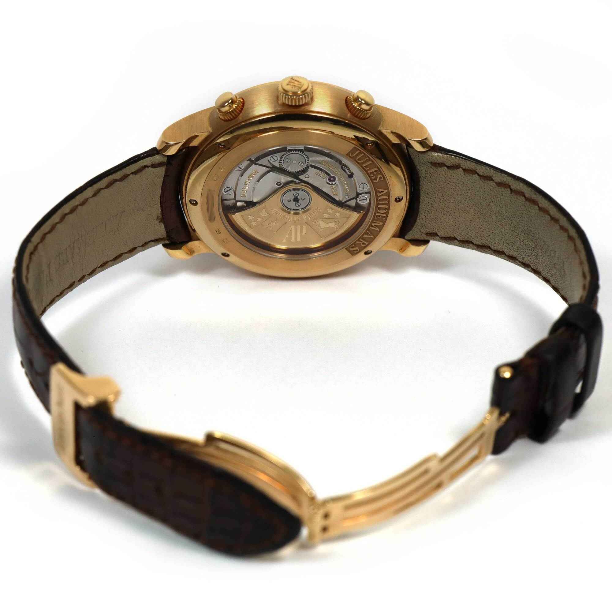 THIS AUDEMARS PIGUET IS IN EXCELLENT CONDITION AND COMES WITH ITS BOX AND HANG TANG ONLY AS SHOWN IN THE PICTURES ATTACHED. THIS WATCH FEATURES A 41MM 18K ROSE GOLD CASE THAT SURROUNDS A WHITE DIAL AND COMES ON A BROWN ALLIGATOR STRAP WITH AN 18K ROSE GOLD ...