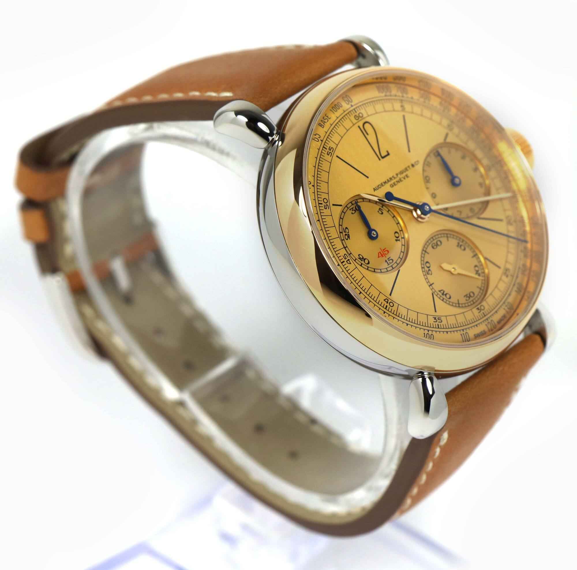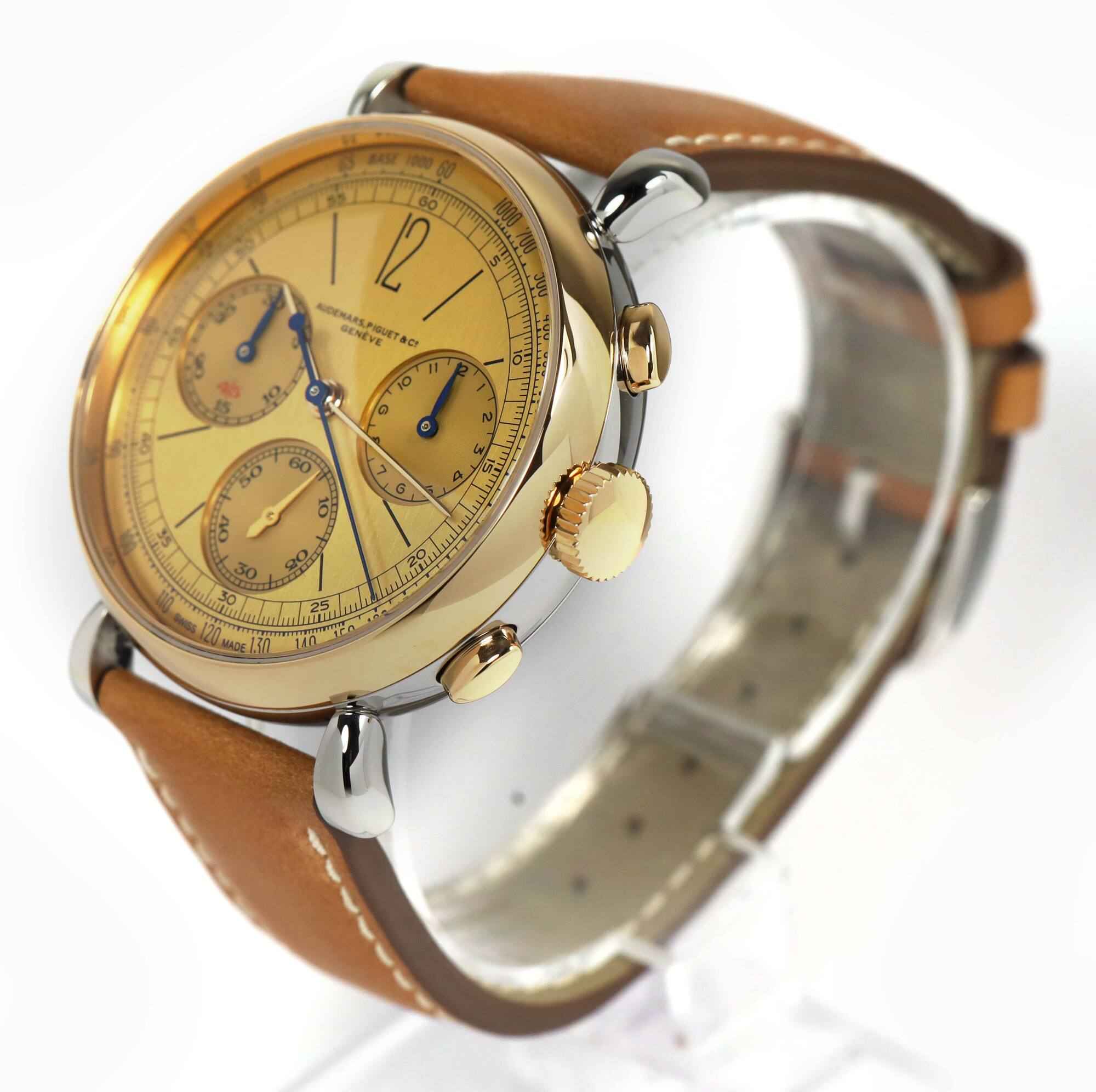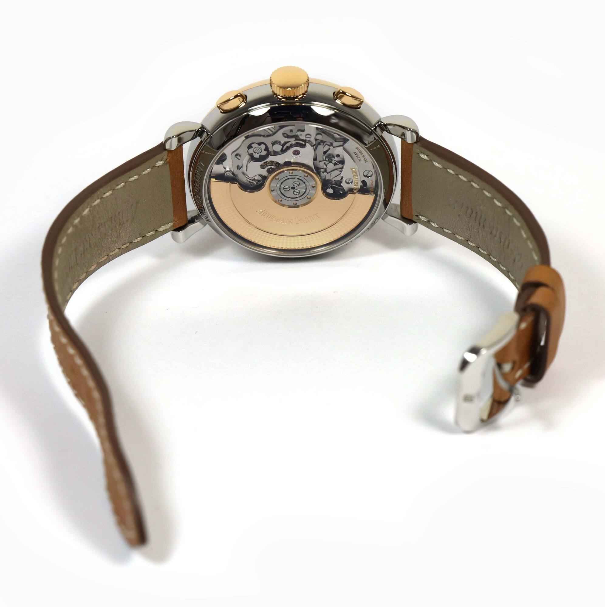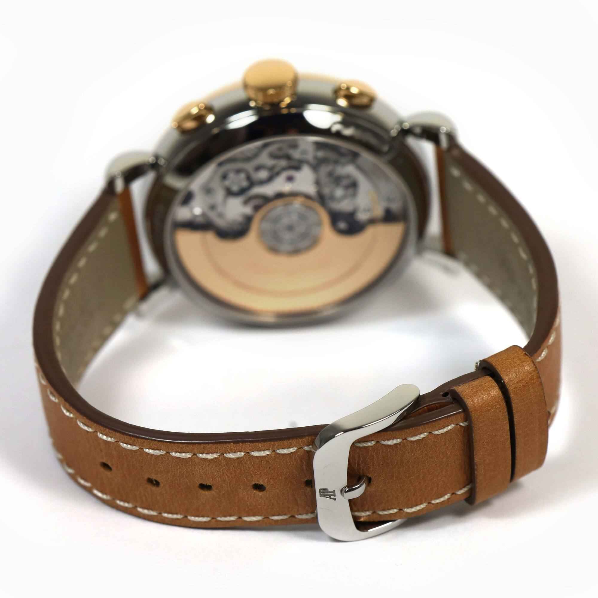 THIS AUDEMARS PIGUET IS UNWORN AND COMES WITH ITS BOX, BOOKLETS, AND ONE ADDITIONAL LEATHER STRAP AS SHOWN IN THE PICTURES. THIS WATCH FEATURES A 40MM STAINLESS STEEL CASE WITH AN 18K ROSE GOLD BEZEL SURROUNDING A YELLOW GOLD-TONED DIAL ON A LIGHT BROWN LEA...
