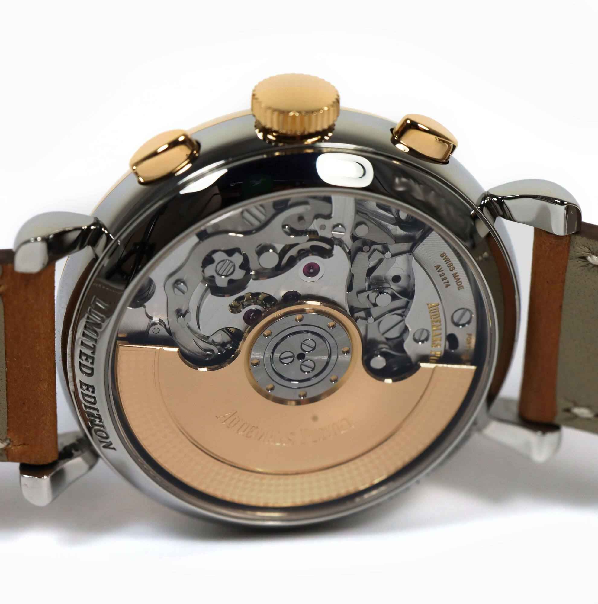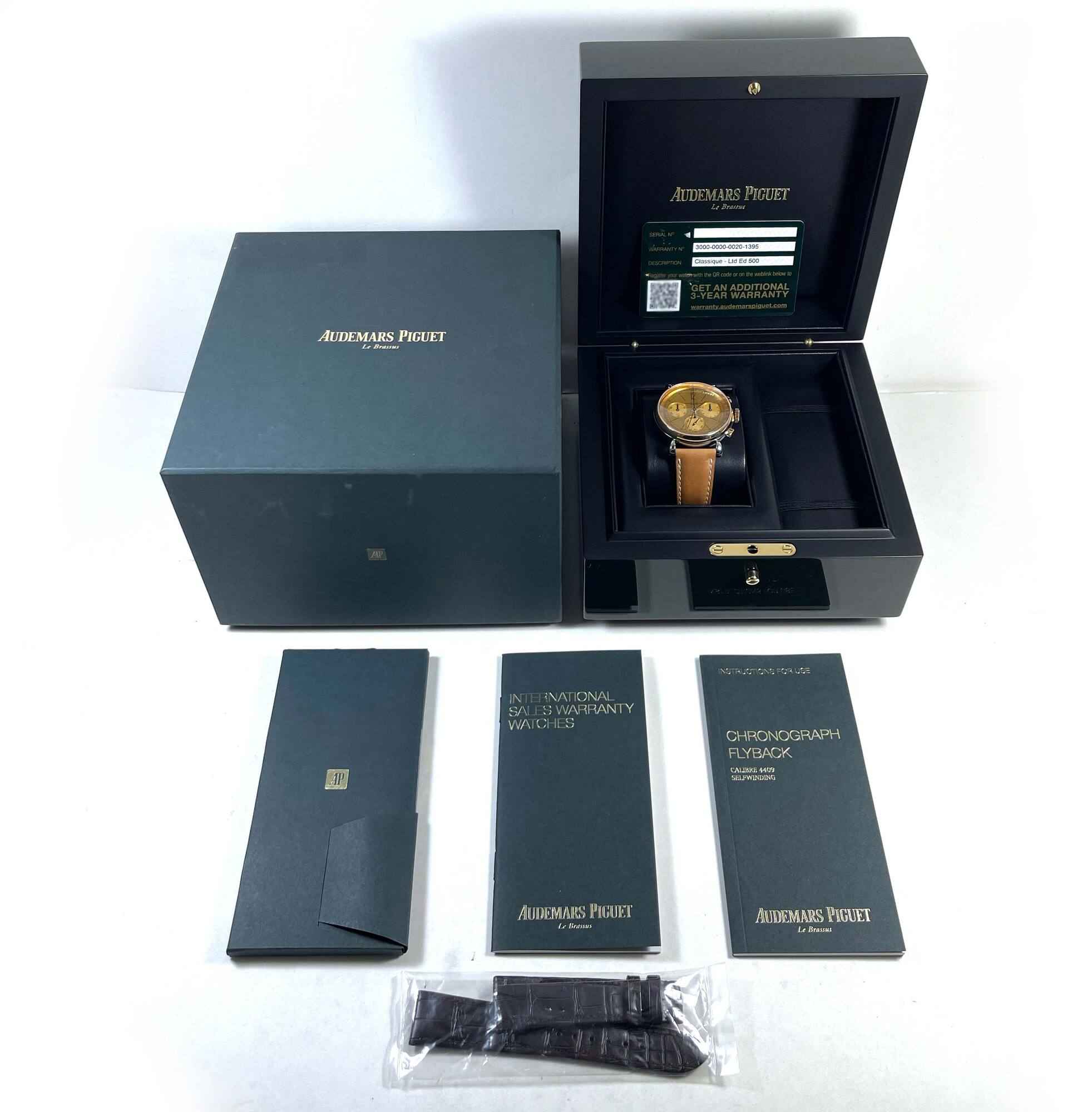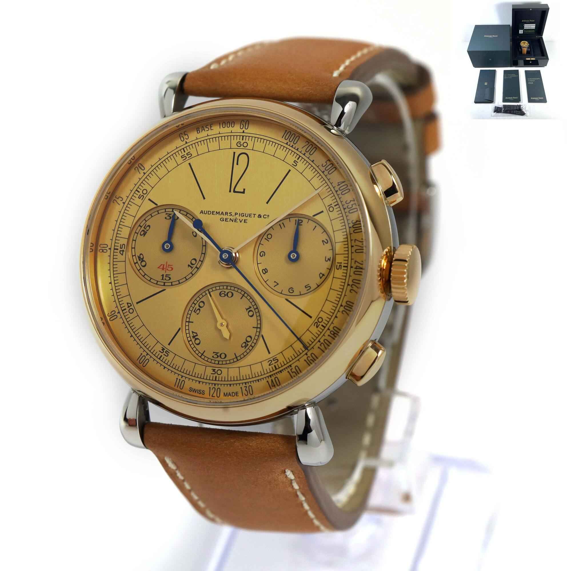 Read Morethis audemars piguet is unworn and comes with its box, booklets, and one additional leather strap as shown in the pictures. This watch features a 40mm stainless steel case with an 18k rose gold bezel surrounding a yellow gold-toned dial on a light brown leather strap with a stainless steel tang buckle. The watch functions include hours, minutes, small seconds, chronograph and tachymeter. This watch is in stock and available to ship immediately!