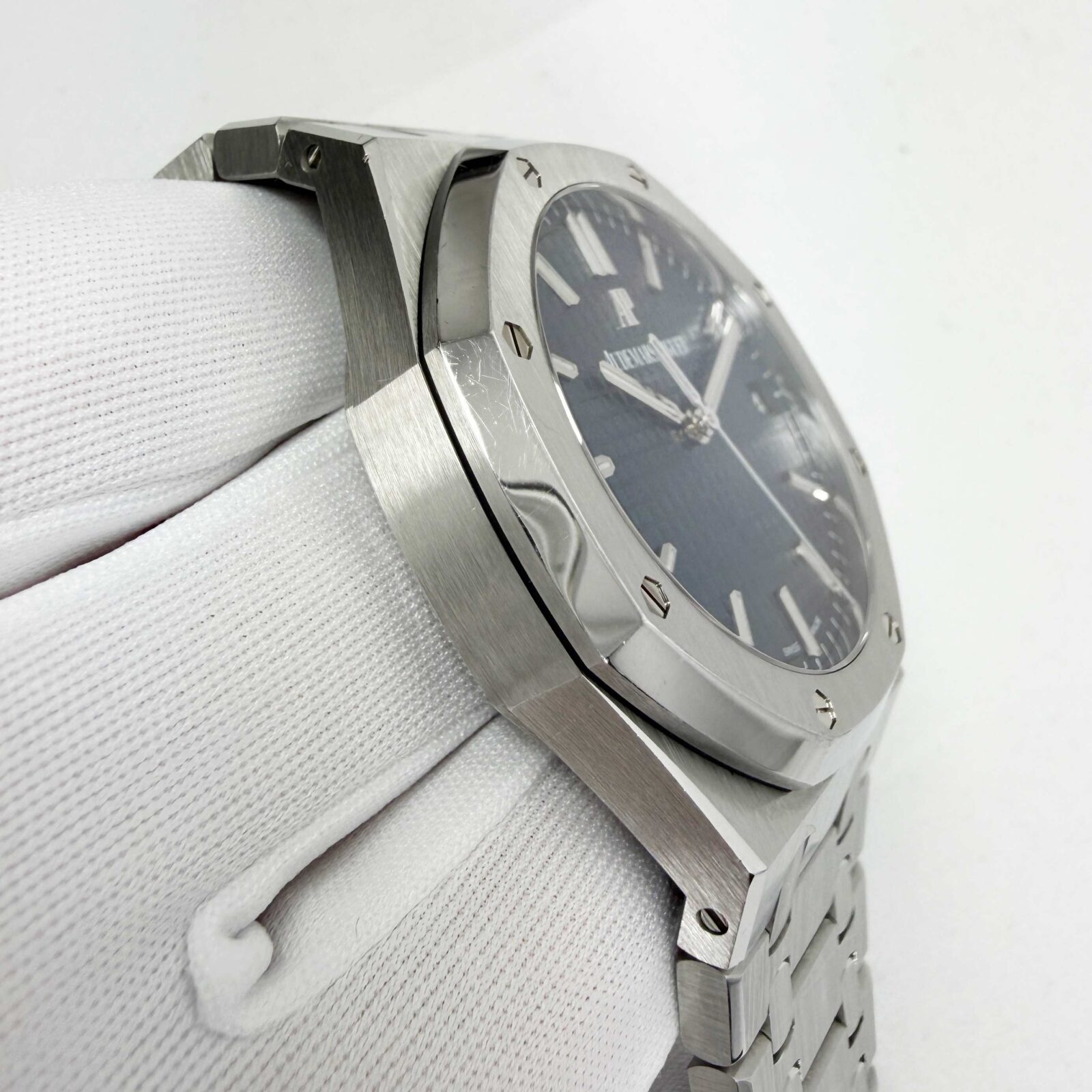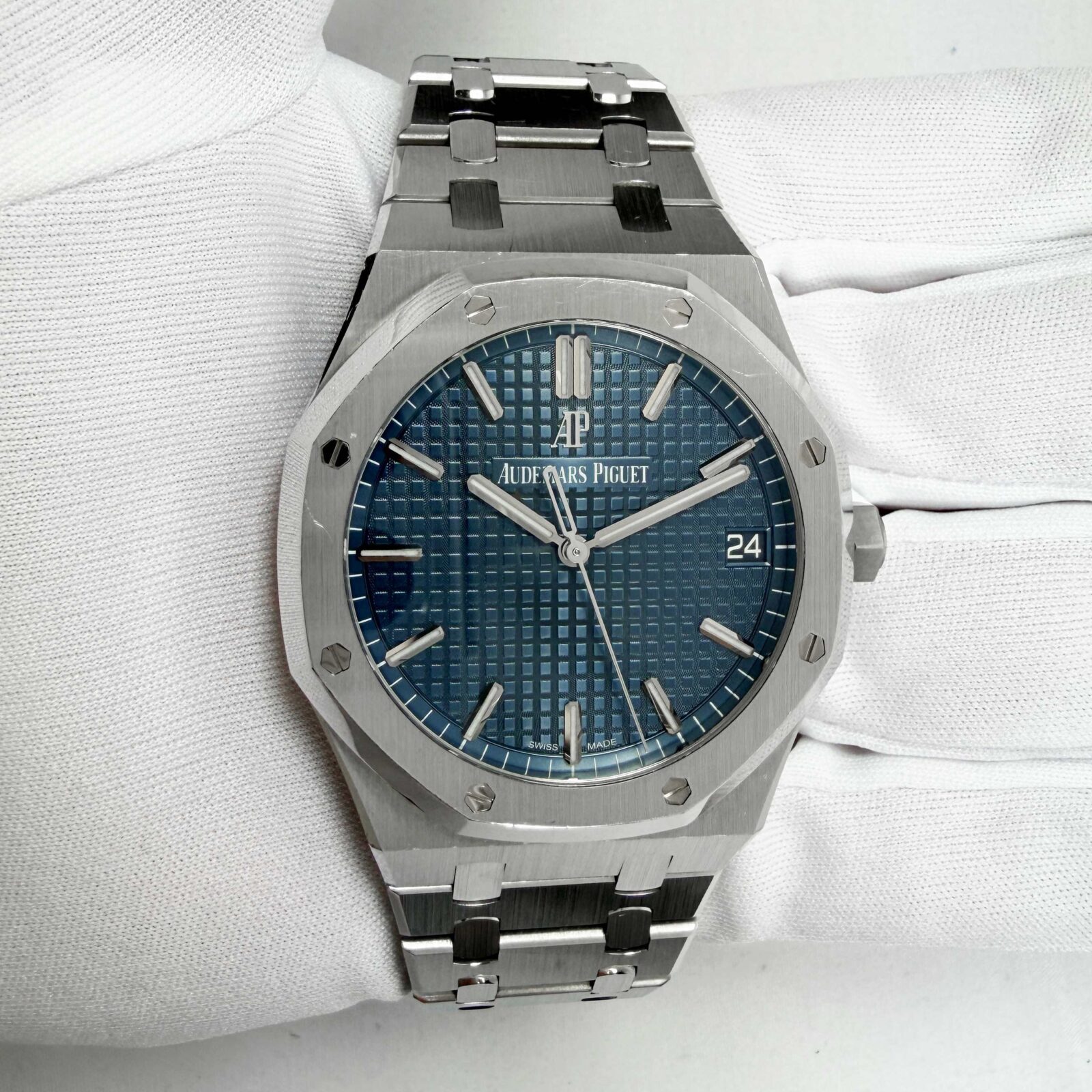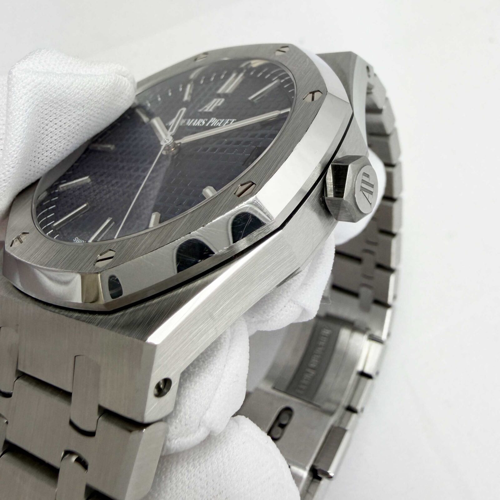This Audemars Piguet watch is unpolished and comes with its box, booklets, hangtag, extra link, and warranty card. The photos shown are of the exact watch being sold and accurately represent its condition. This watch is in stock and ready to ship immediately!