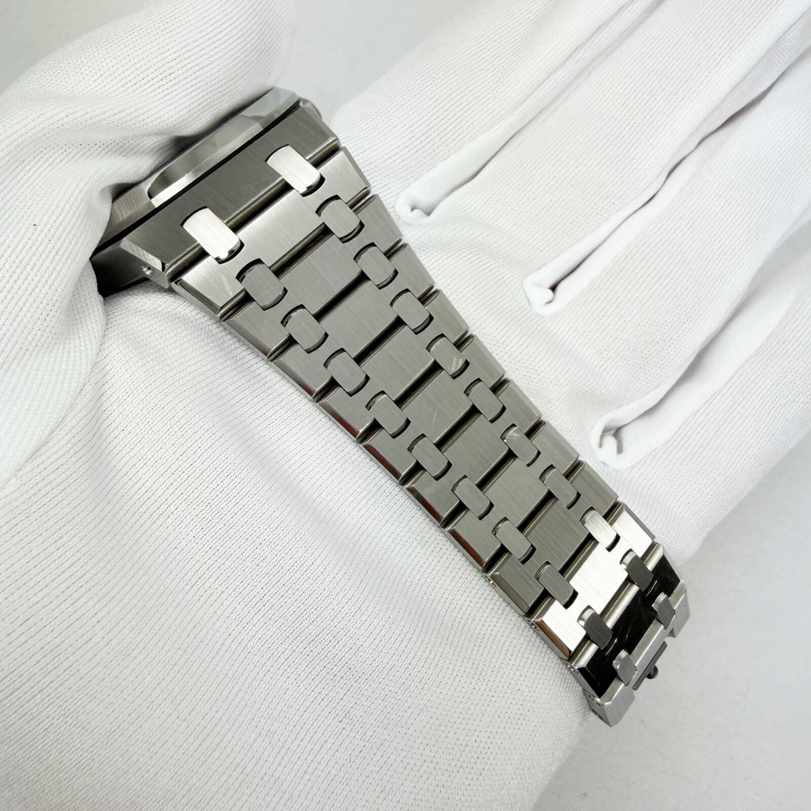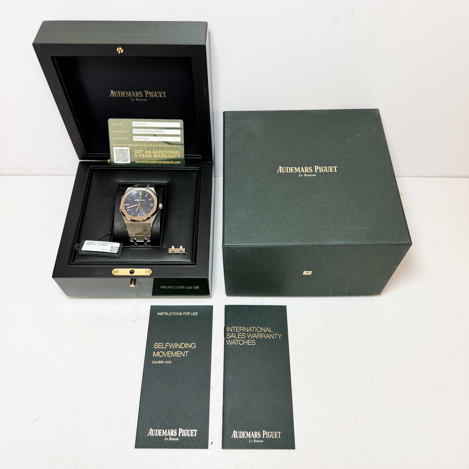 this audemars piguet watch is unpolished and comes with its box, booklets, hangtag, extra link, and warranty card. The photos shown are of the exact watch being sold and accurately represent its condition. This watch is in stock and ready to ship immediately!