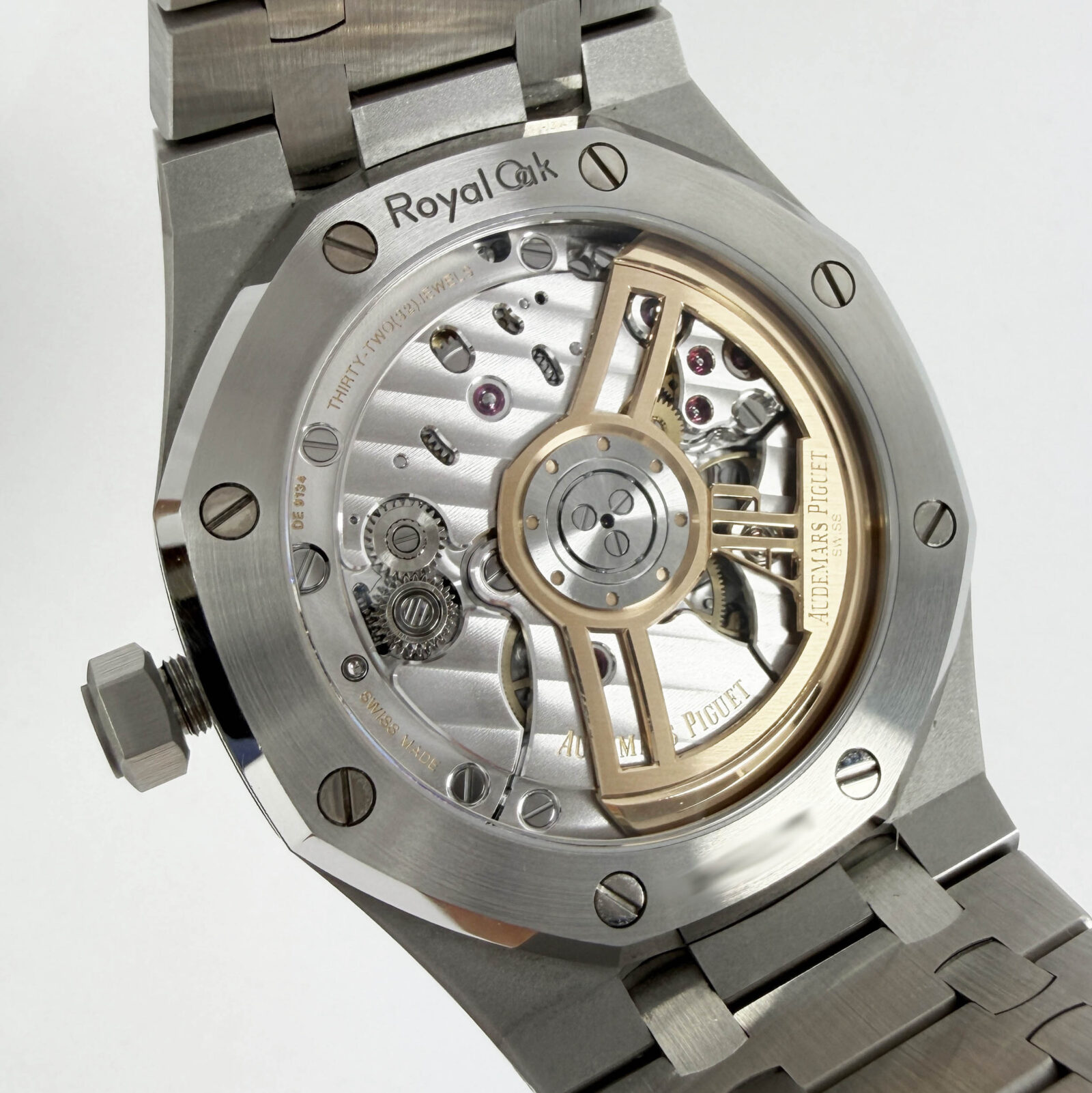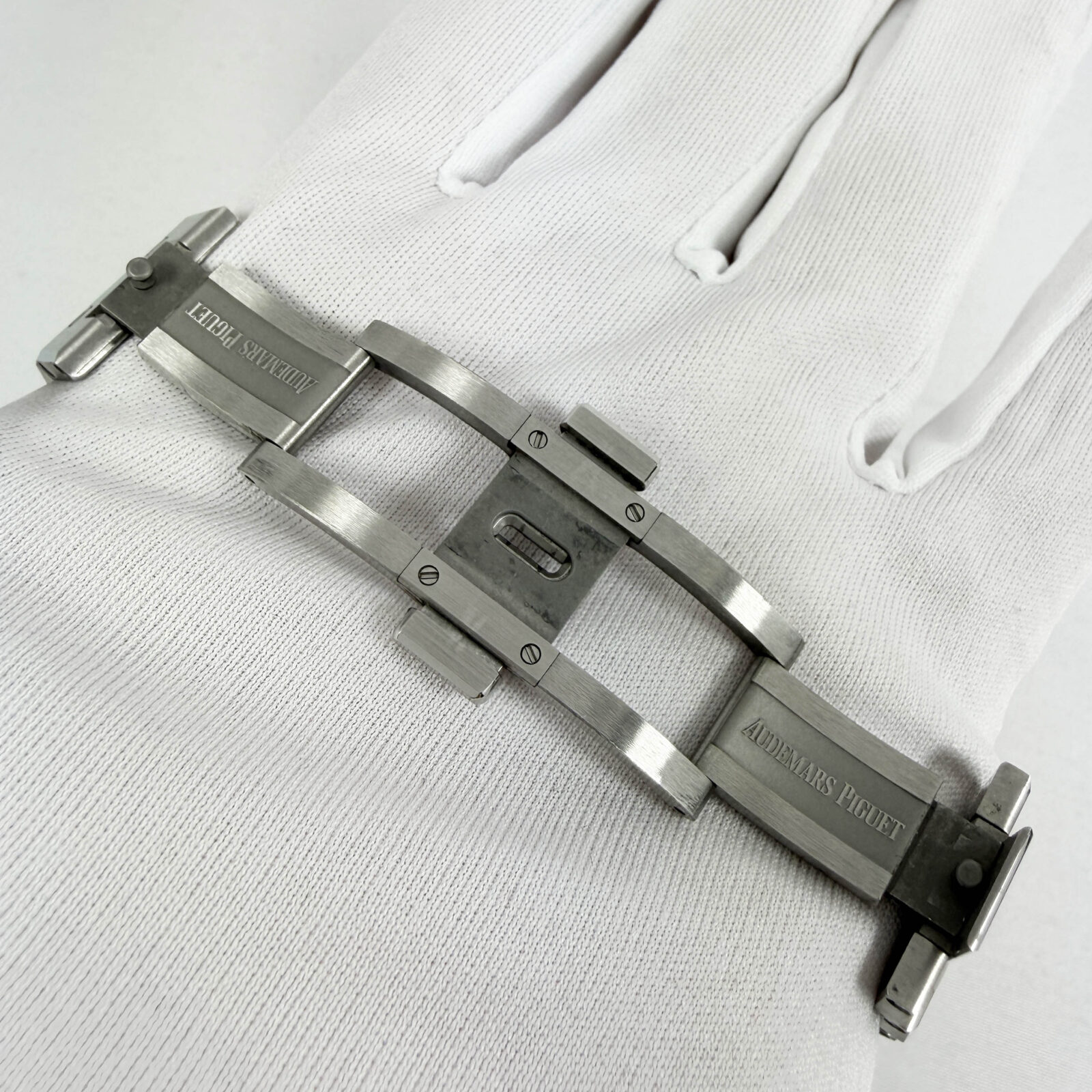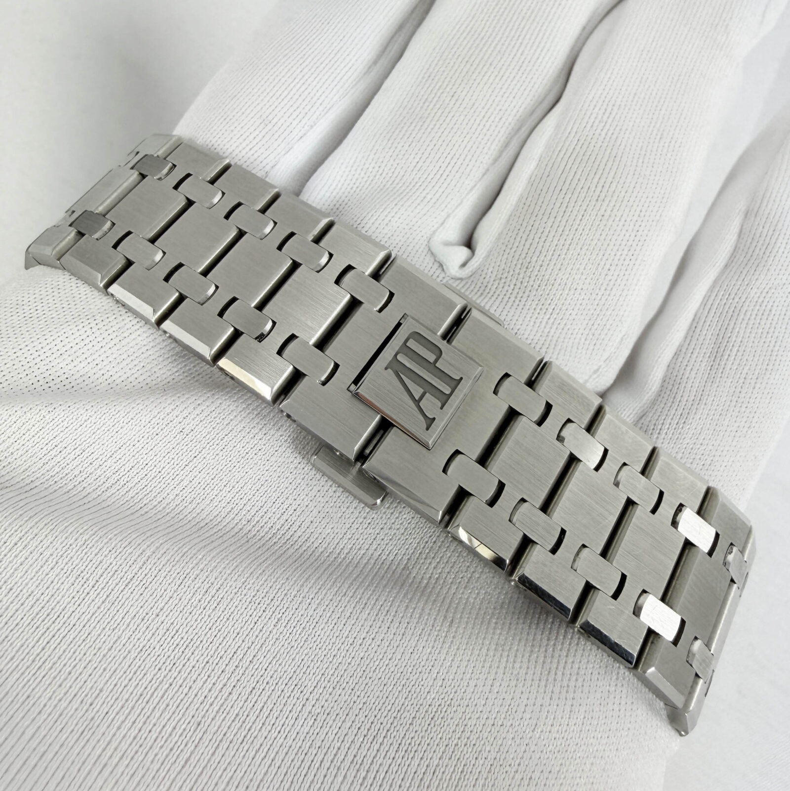 This Audemars Piguet Royal Oak watch comes with its box and warranty card. The photos shown are of the exact watch being sold and accurately represent its condition. This watch is in stock and ready to ship immediately!