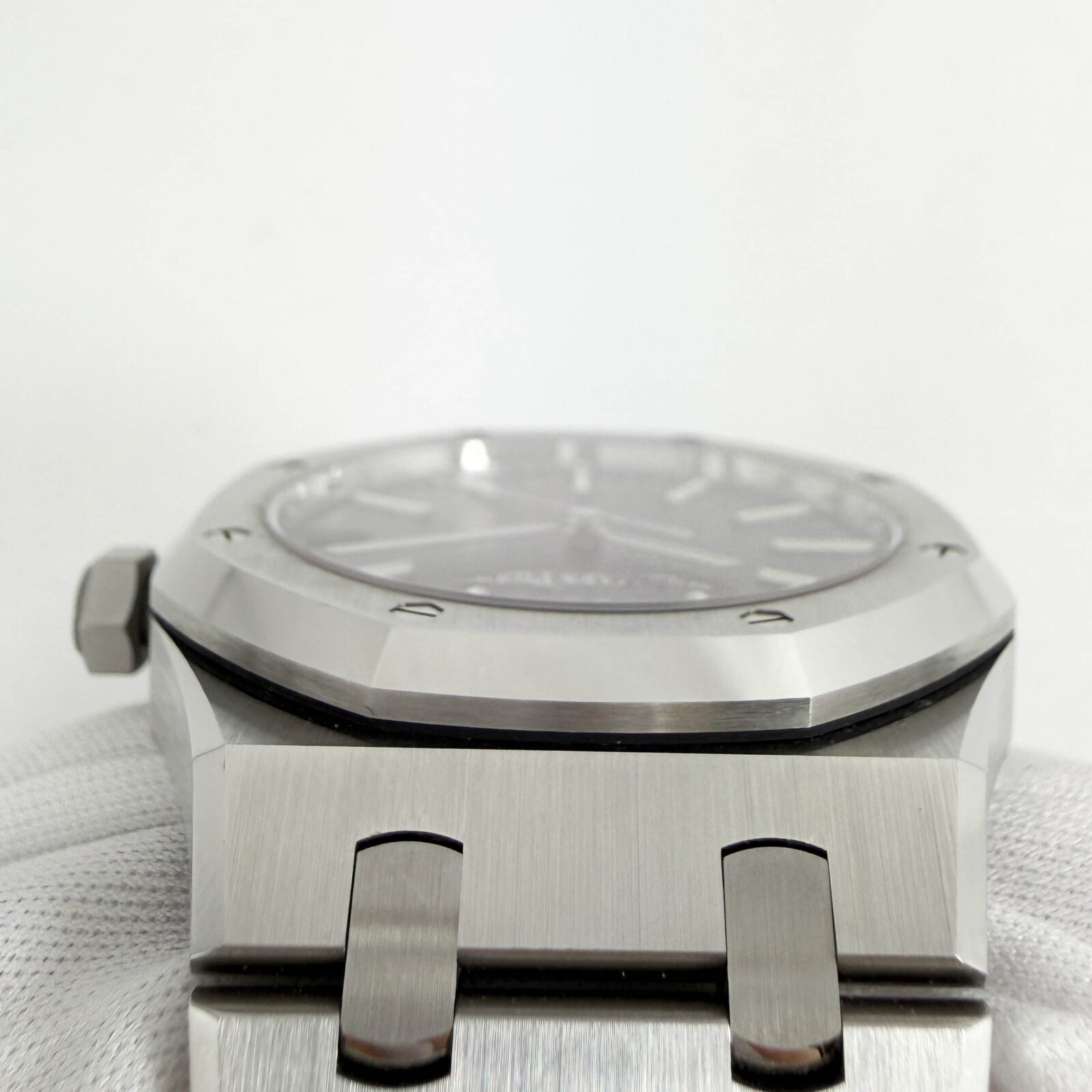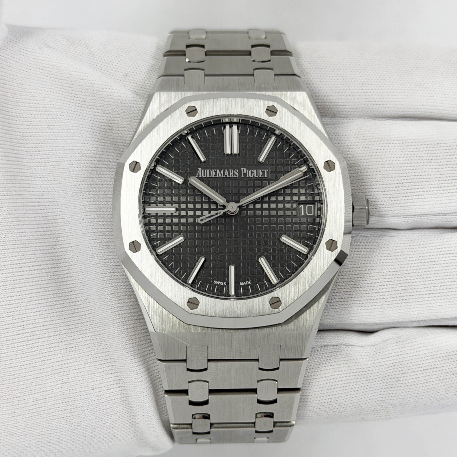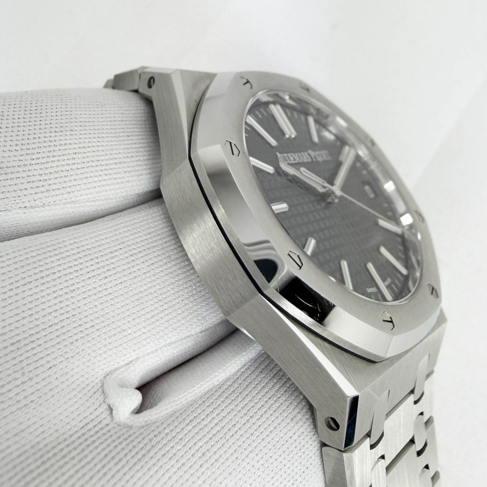 This Audemars Piguet Royal Oak watch comes with its box and warranty card. The photos shown are of the exact watch being sold and accurately represent its condition. This watch is in stock and ready to ship immediately!