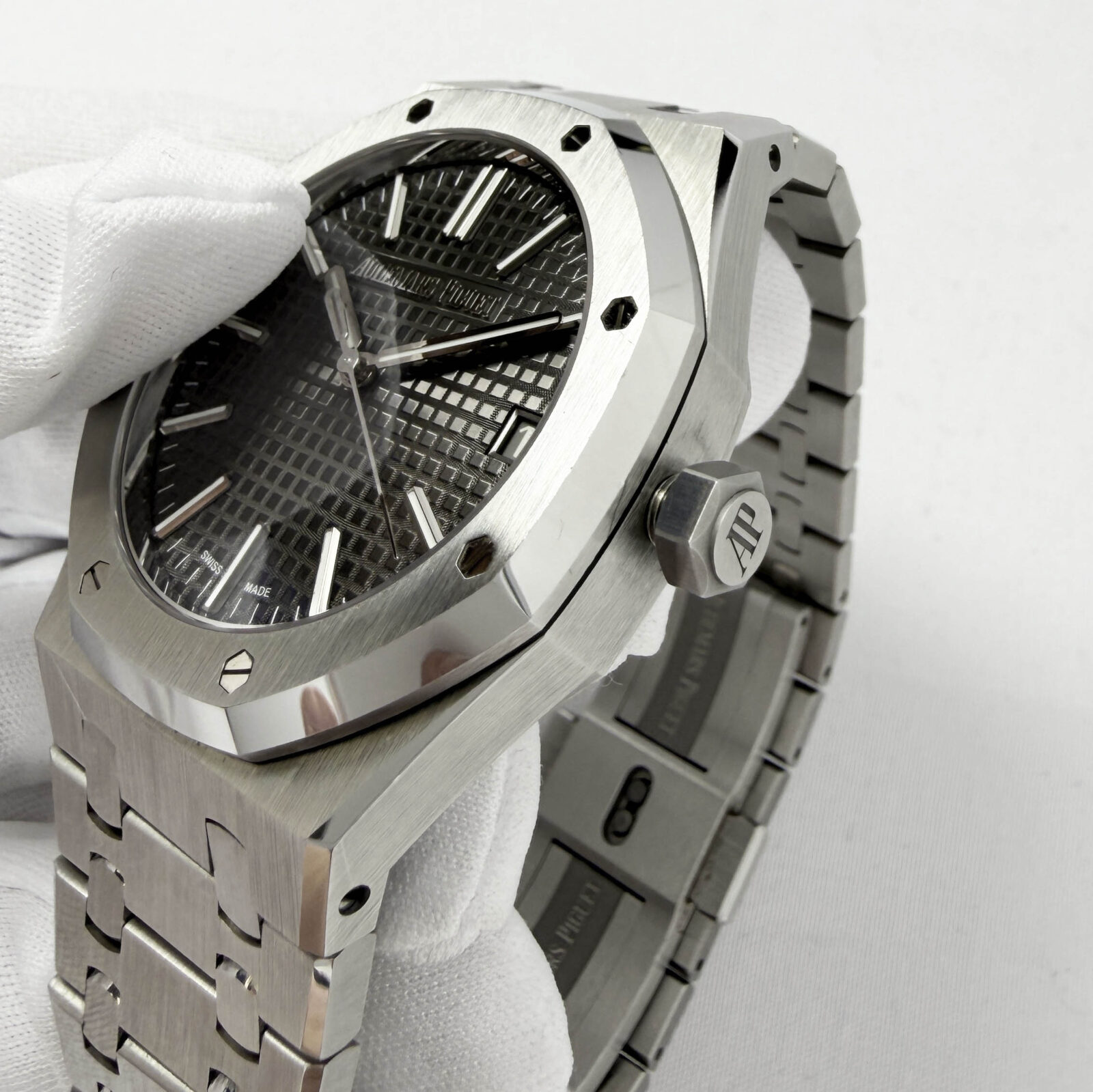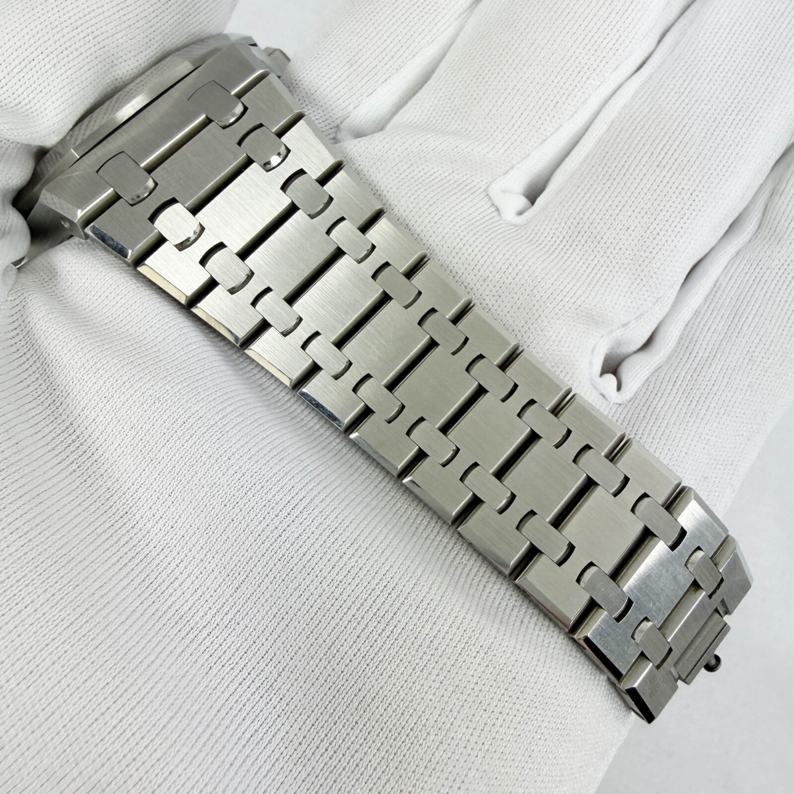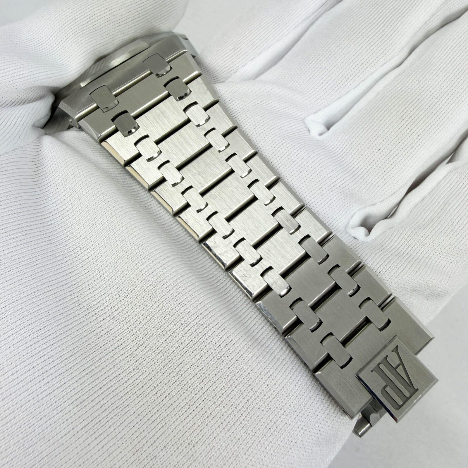 this audemars piguet royal oak watch comes with its box and warranty card. The photos shown are of the exact watch being sold and accurately represent its condition. This watch is in stock and ready to ship immediately!