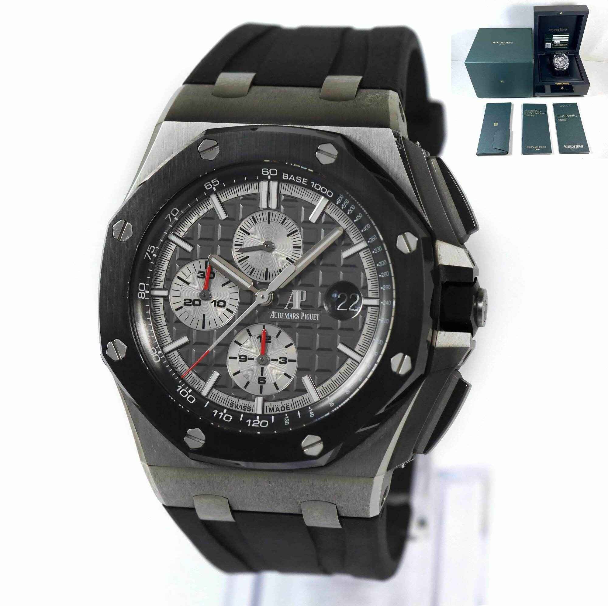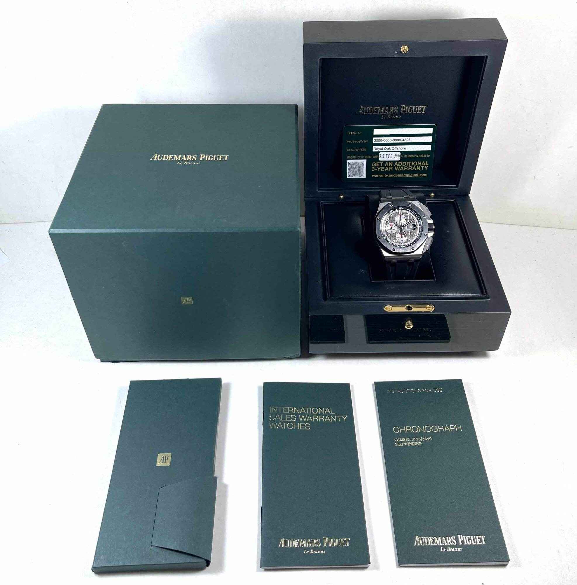 THIS AUDEMARS PIGUET IS IN EXCELLENT CONDITION AND COMES WITH ITS BOX, BOOKLETS, AND WARRANTY CARD DATED FEBRUARY 23RD, 2018 AS SHOWN IN THE PICTURES ATTACHED. THIS WATCH IS IN STOCK AND AVAILABLE TO SHIP IMMEDIATELY!