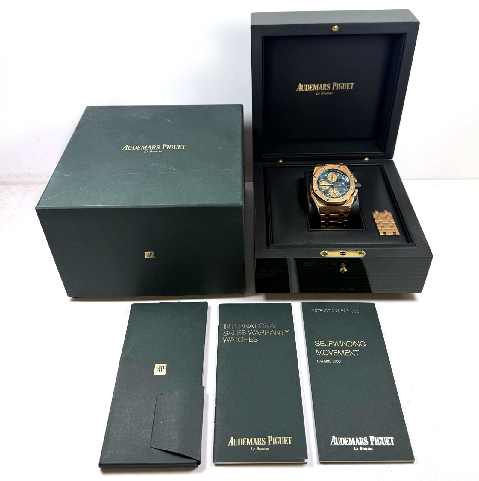 this audemars piguet watch is in excellent overall condition and comes with its box, spare links, and booklets only as shown in the pictures attached. This watch is in stock and available to ship immediately!