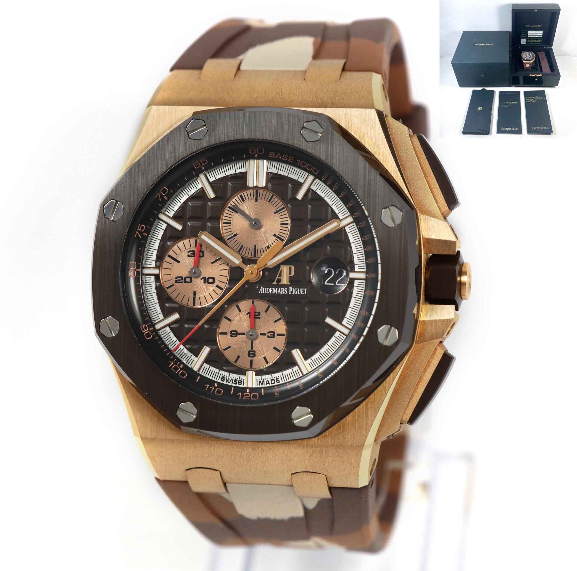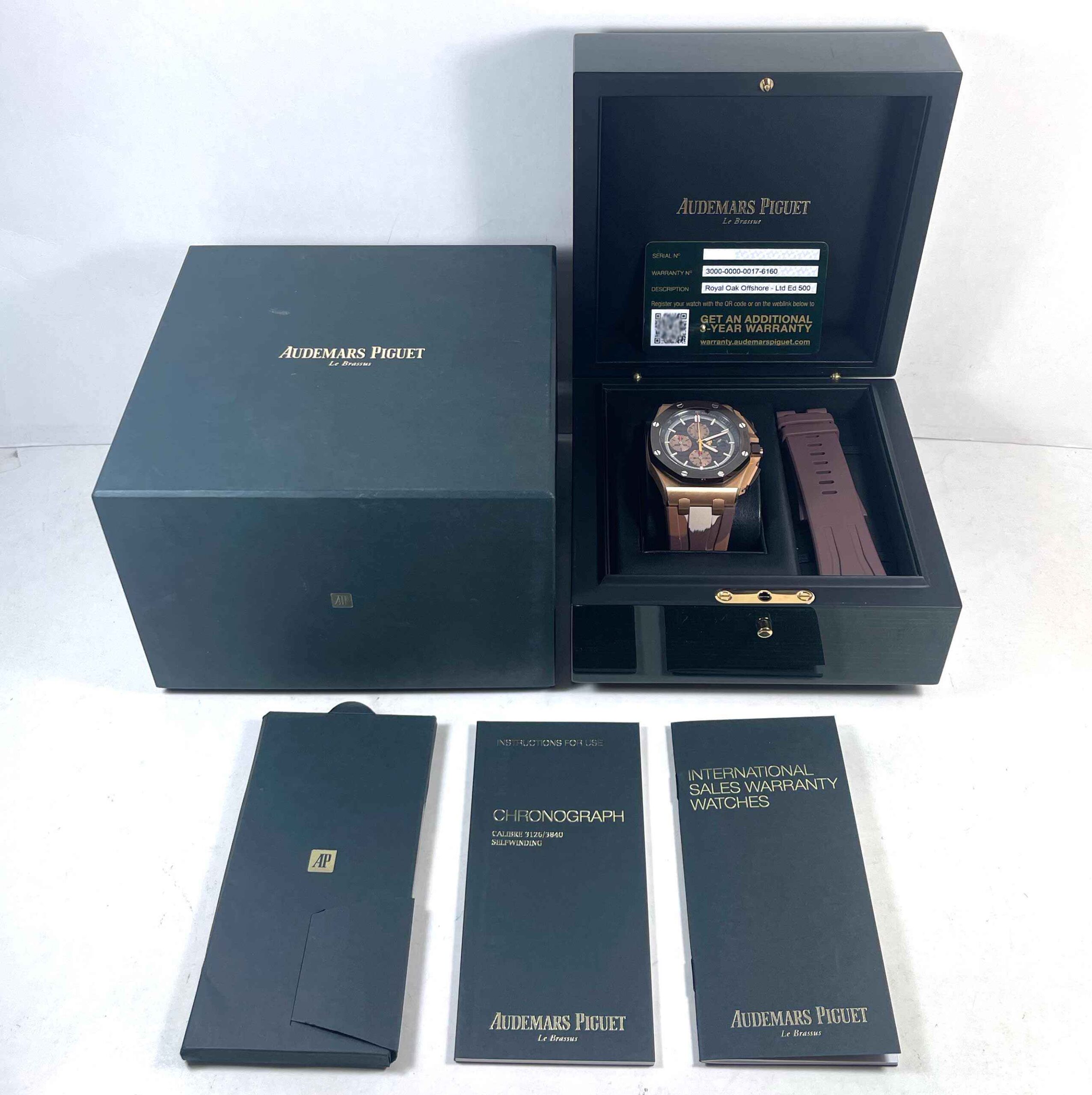 Read Morethis audemars piguet is in mint condition and and comes with its box, booklets, one additional brown rubber strap, and warranty card as shown in the pictures attached. This ap is part of limited edition with only 500 pieces released. This watch is in stock and available to ship immediately!