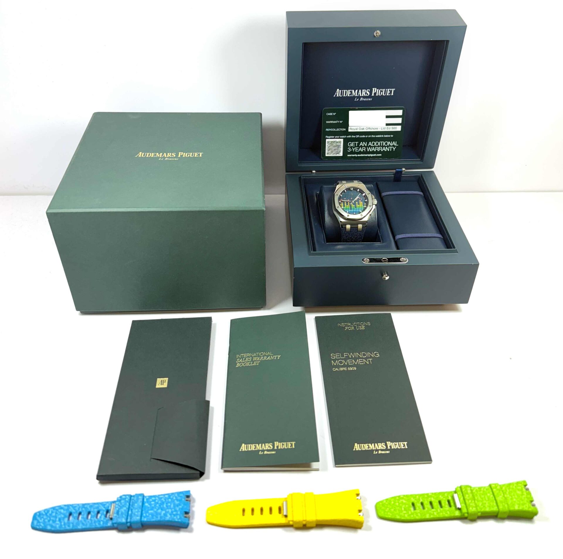 this audemars piguet is in excellent overall condition and comes with its box, booklets, 3 additional ap straps, and warranty card as shown in the pictures attached. This watch is in stock and available to ship immediately!