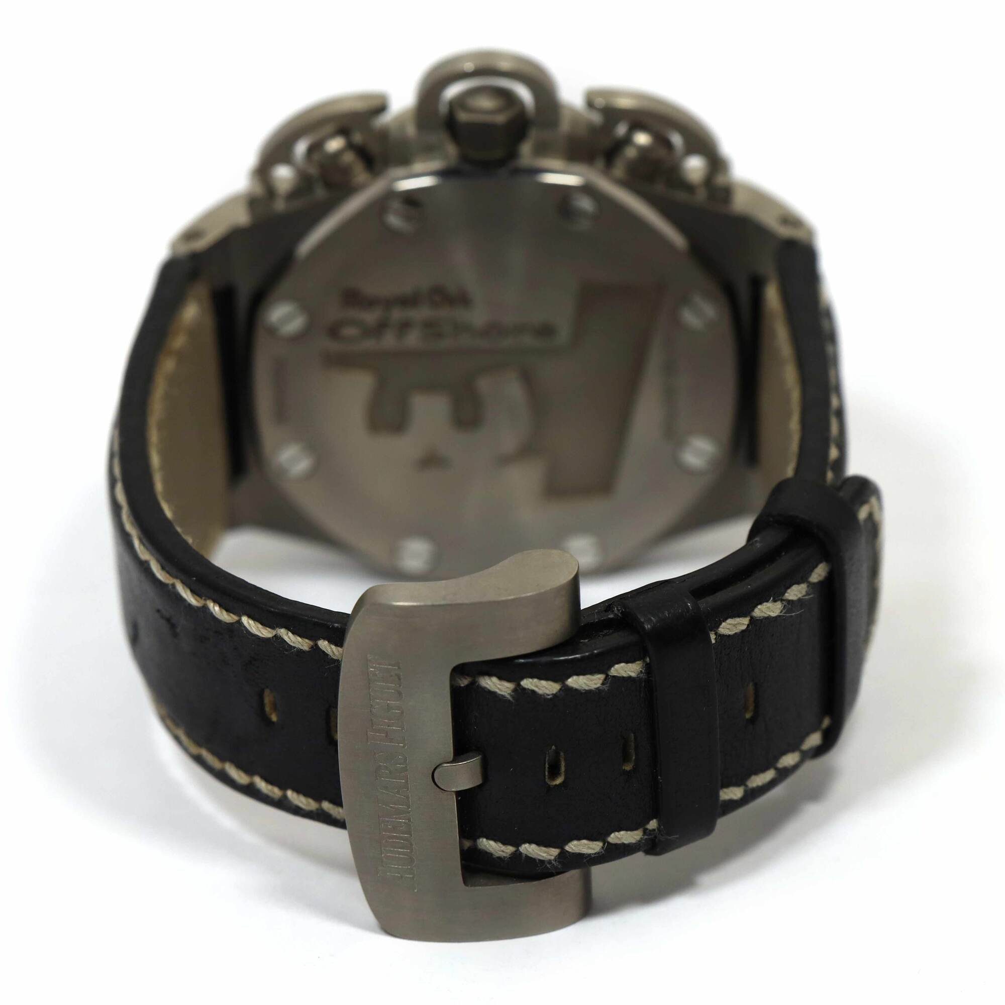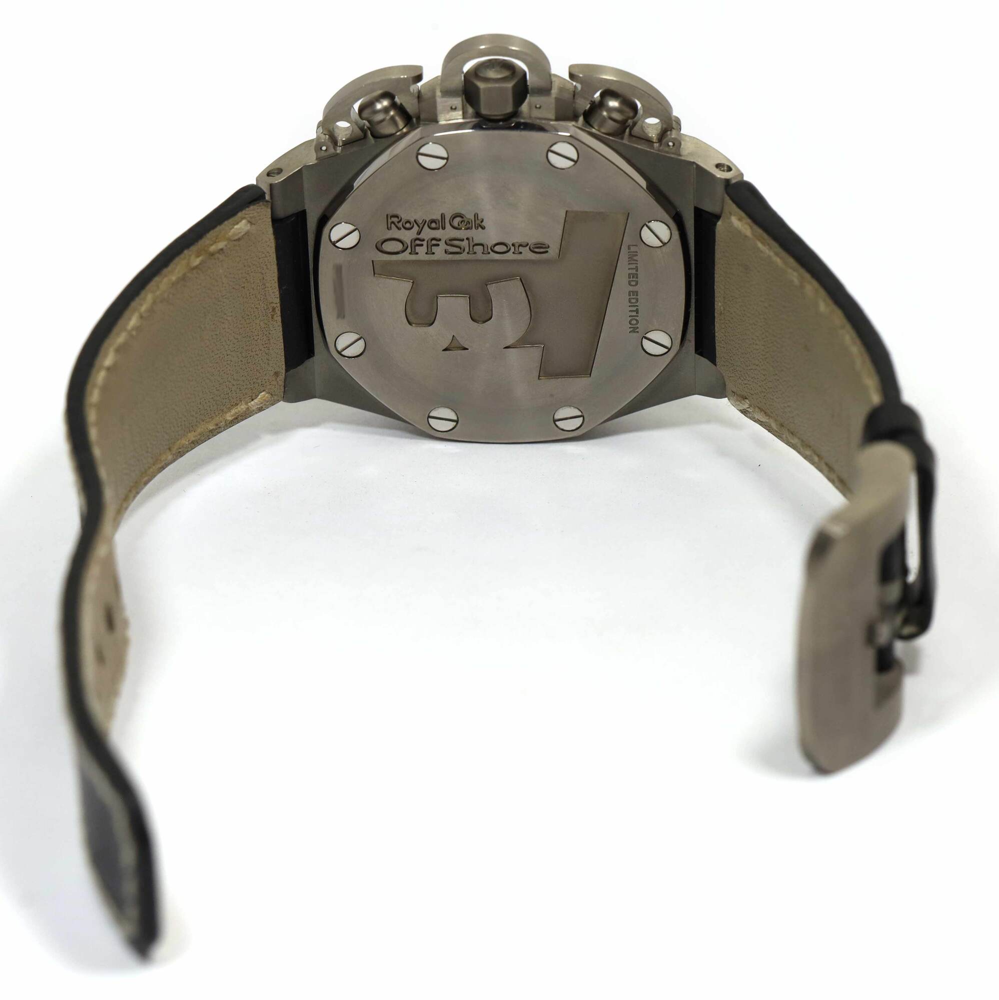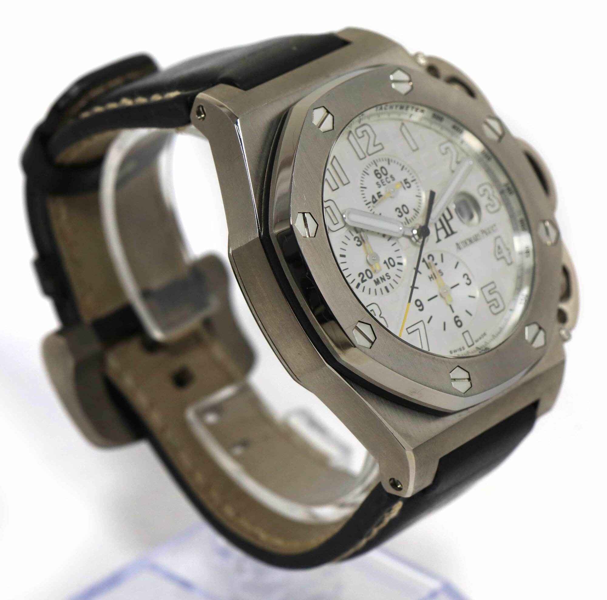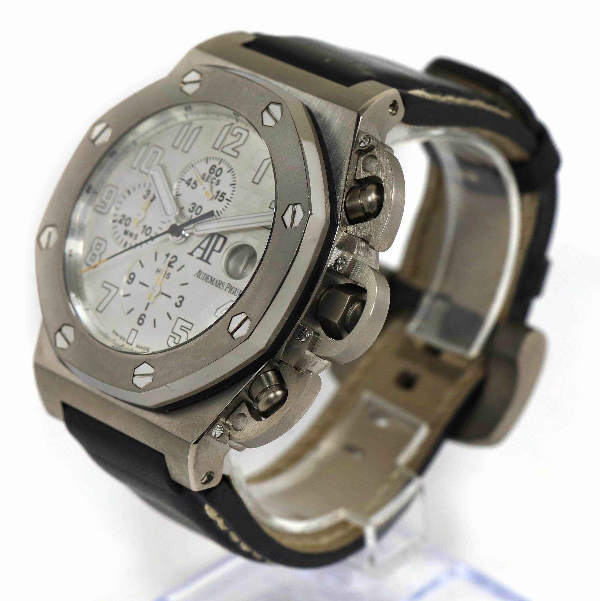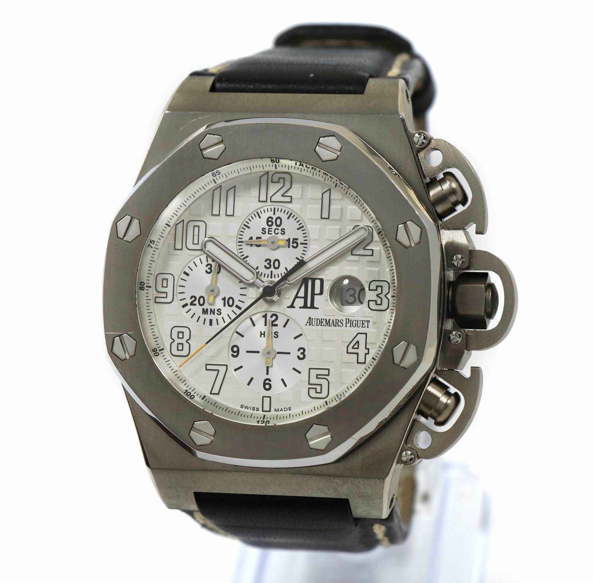 THIS AUDEMARS PIGUET IS IN EXCELLENT CONDITION SHOWING SOME SIGNS OF WEAR ON THE CASE AND BEZEL CONSISTENT WITH PREOWNED WATCHES. THIS COMES AS WATCH ONLY AND FEATURES A 47MM TITANIUM CASE THAT SURROUNDS A WHITE TAPISSERIE DIAL AND COMES ON A BLACK LEATHER ...