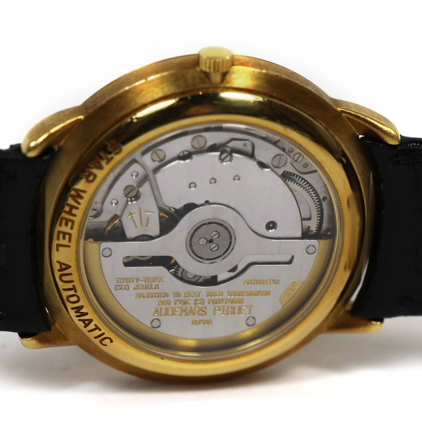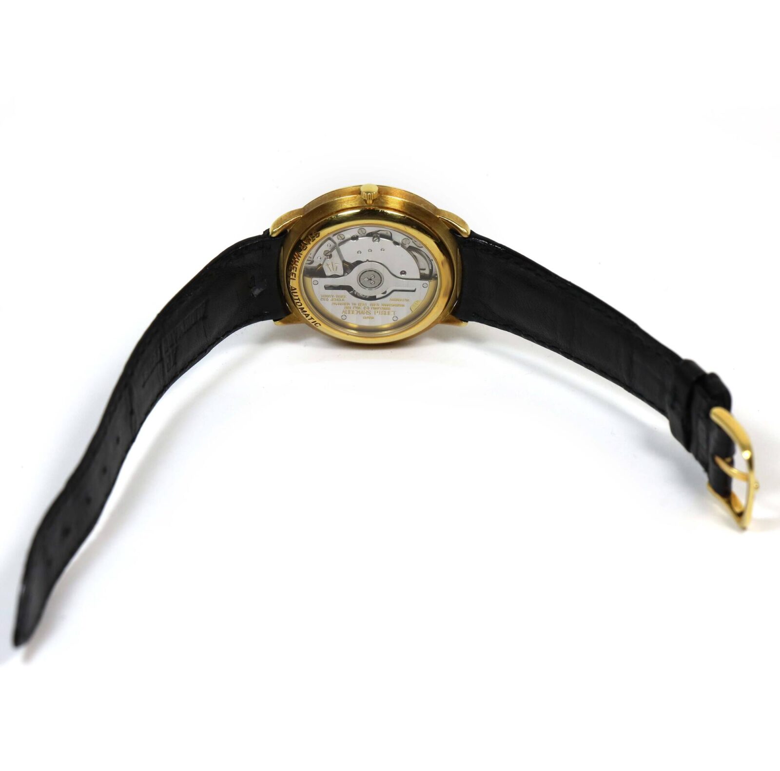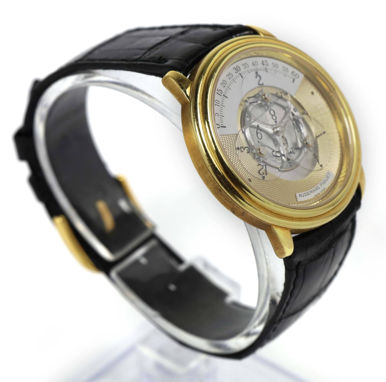 THIS AUDEMARS PIGUET IS EXCELLENT OVERALL CONDITION AND COMES AS WATCH ONLY AS SHOWN IN THE PICTURES ATTACHED. THIS WATCH FEATURES A 36MM 18K YELLOW GOLD CASE THAT SURROUNDS A GOLD DIAL AND COMES ON A BLACK LEATHER STRAP WITH AN 18K YELLOW GOLD TANG BUCKLE....