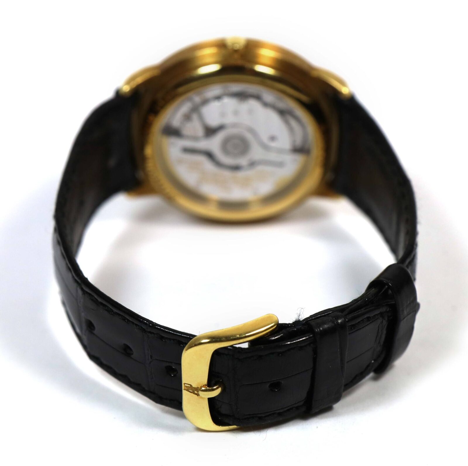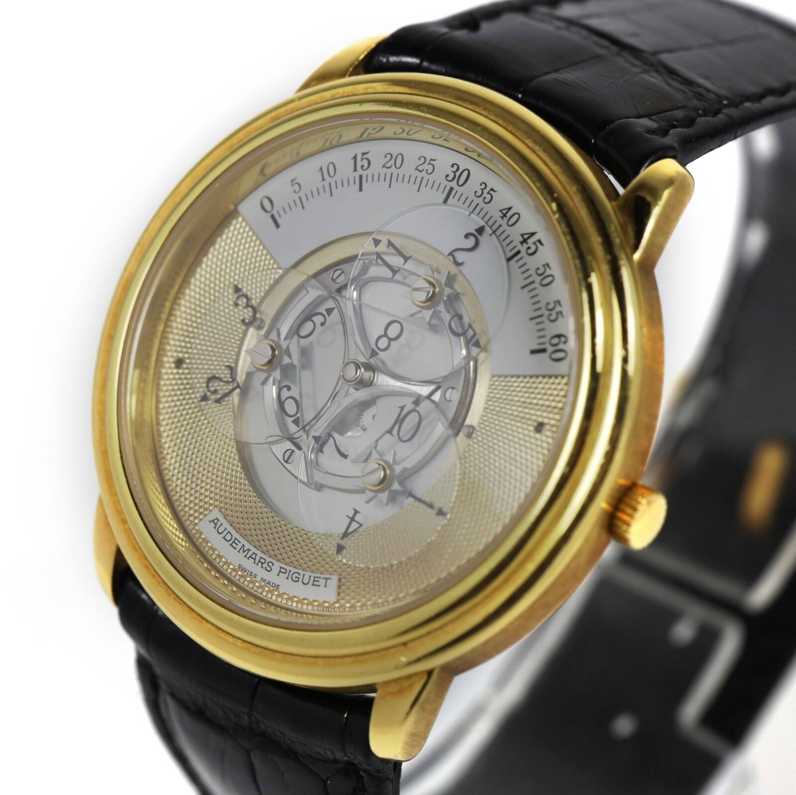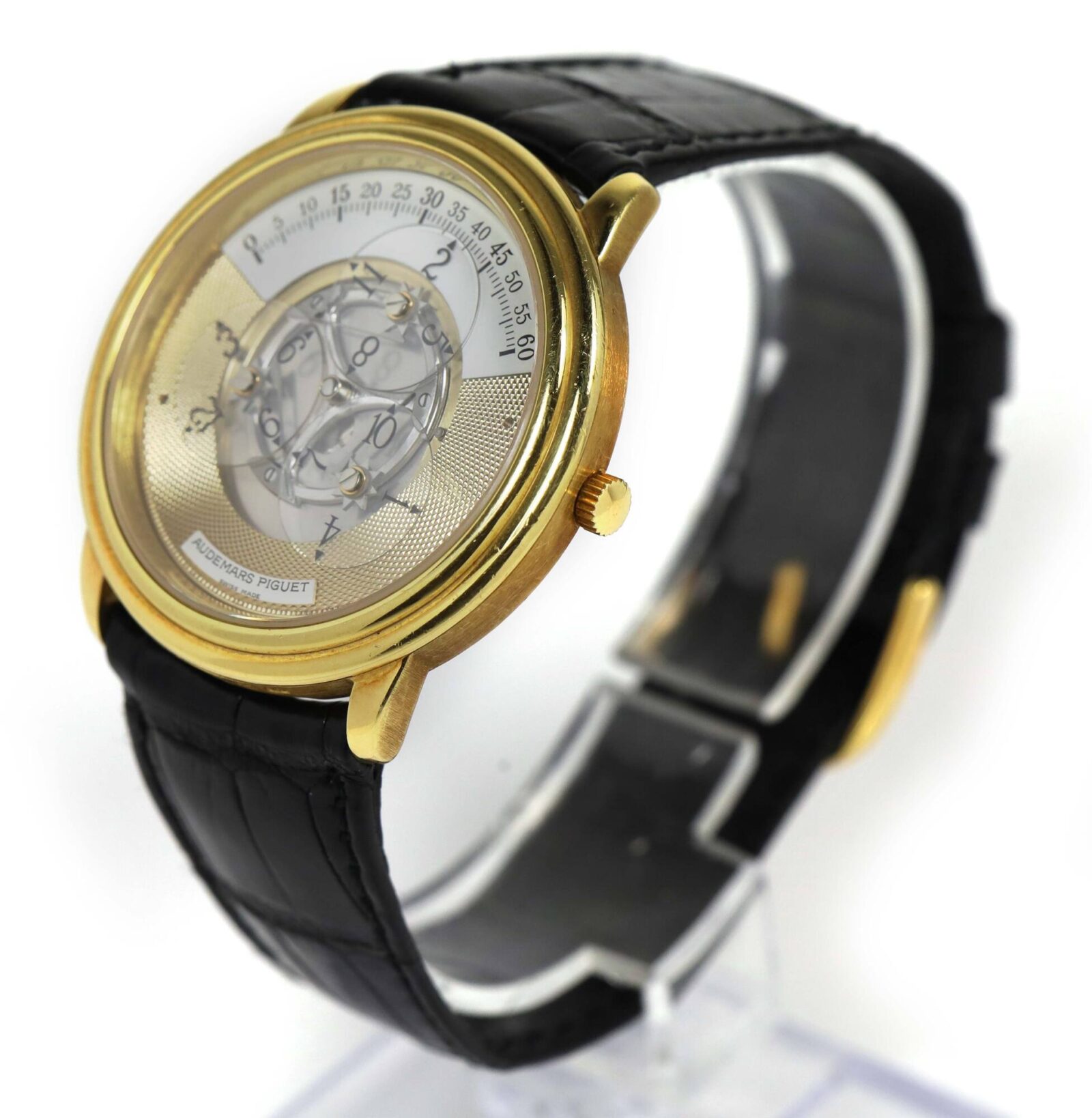 THIS AUDEMARS PIGUET IS EXCELLENT OVERALL CONDITION AND COMES AS WATCH ONLY AS SHOWN IN THE PICTURES ATTACHED. THIS WATCH FEATURES A 36MM 18K YELLOW GOLD CASE THAT SURROUNDS A GOLD DIAL AND COMES ON A BLACK LEATHER STRAP WITH AN 18K YELLOW GOLD TANG BUCKLE....