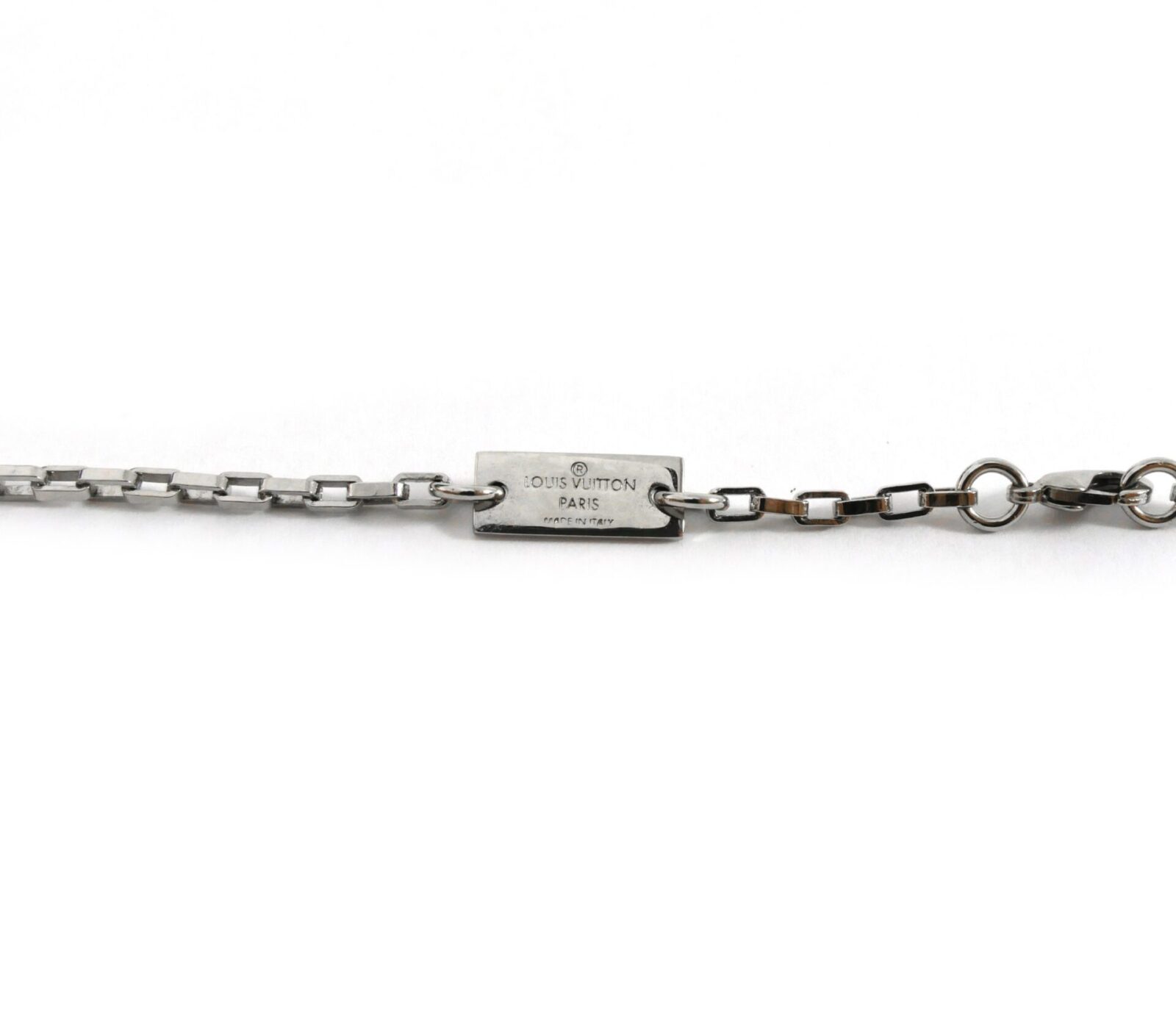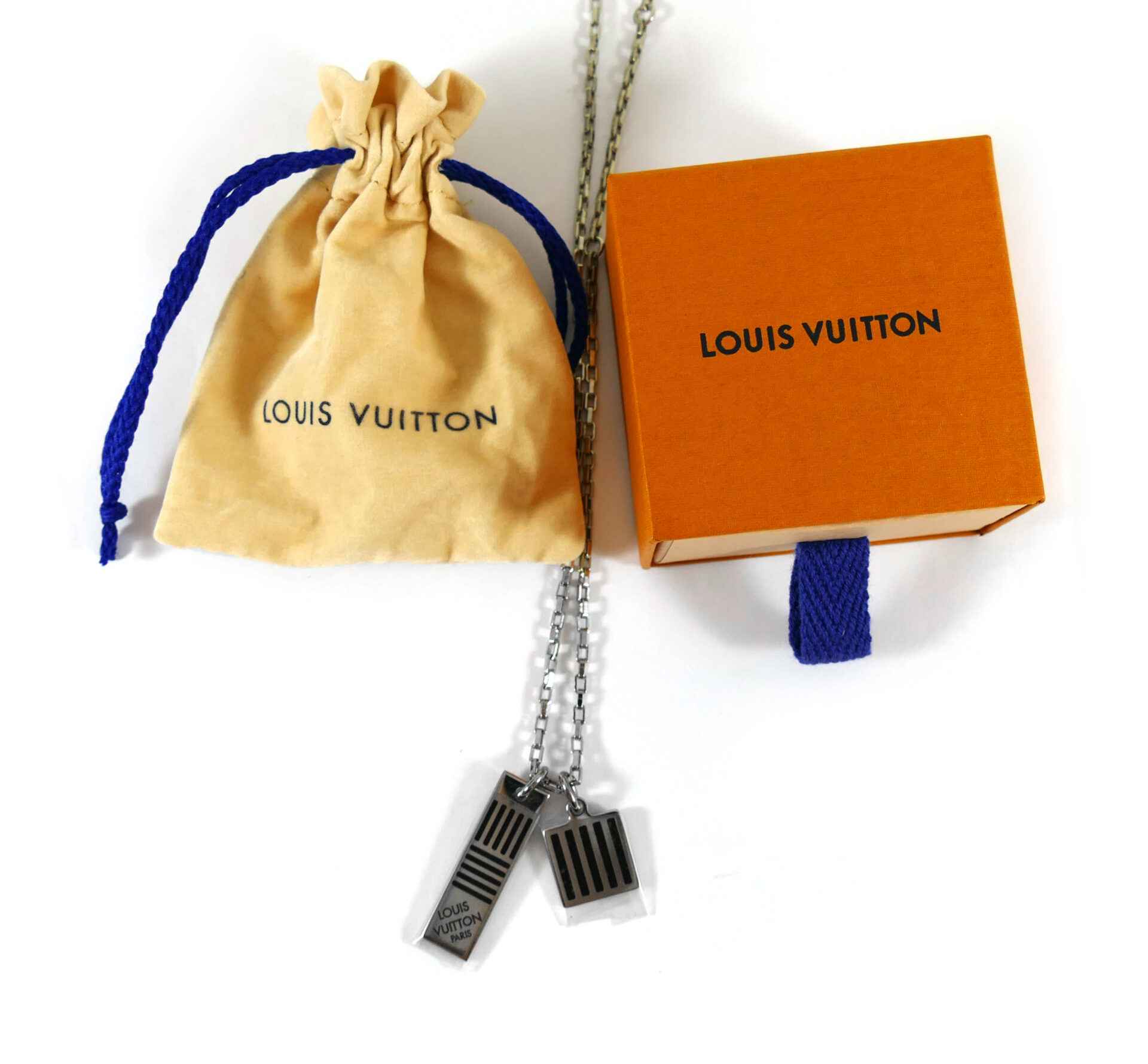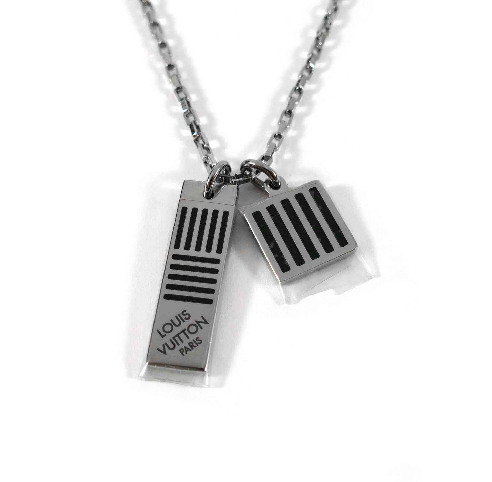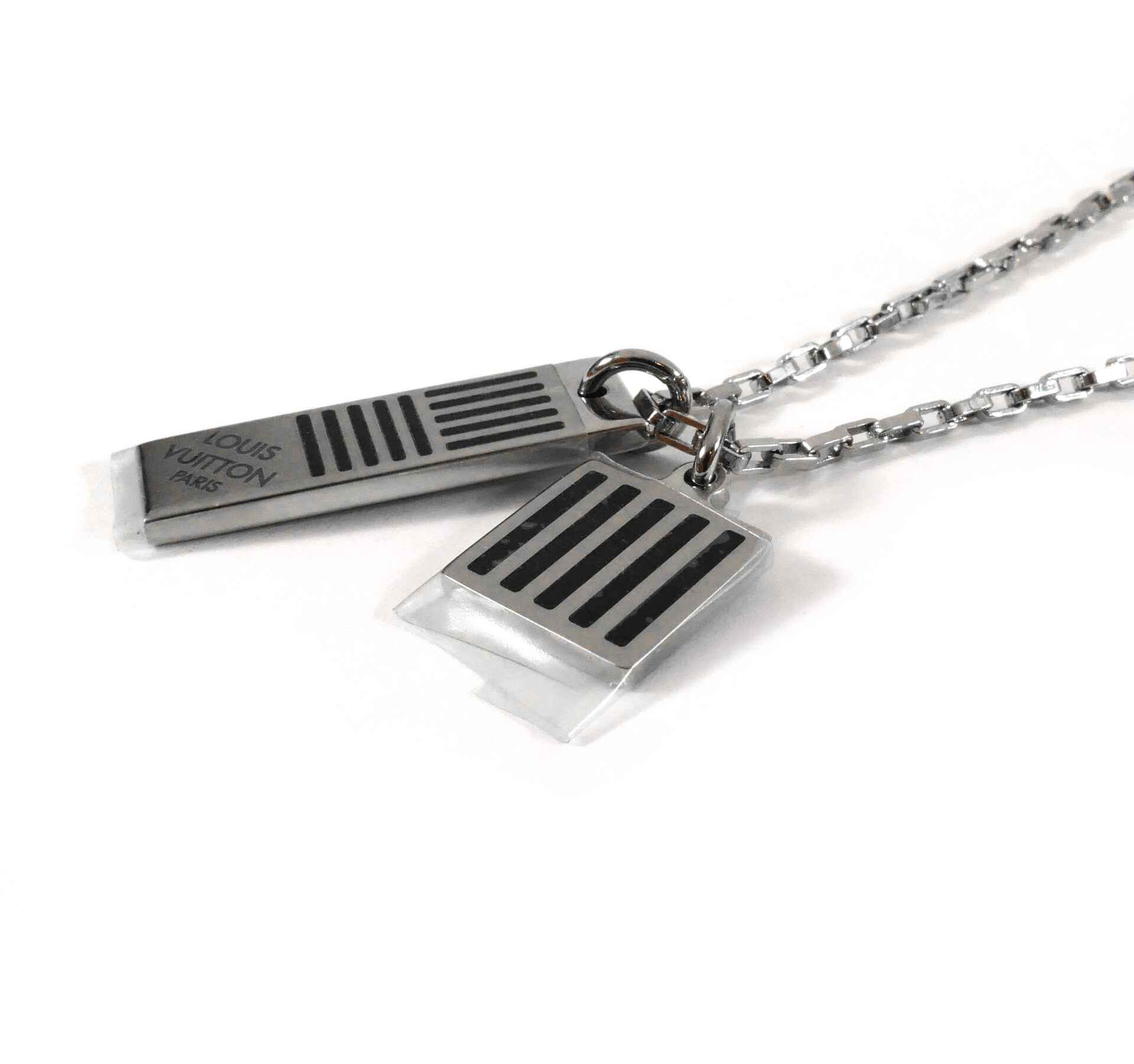Read Morethis new with tags louis vuitton damier necklace is 100% authentic, and comes with its pouch and box. This necklace is made with sterling silver, and black enamel with palladium finishing. It has the signature damier pattern / louis vuitton signature.