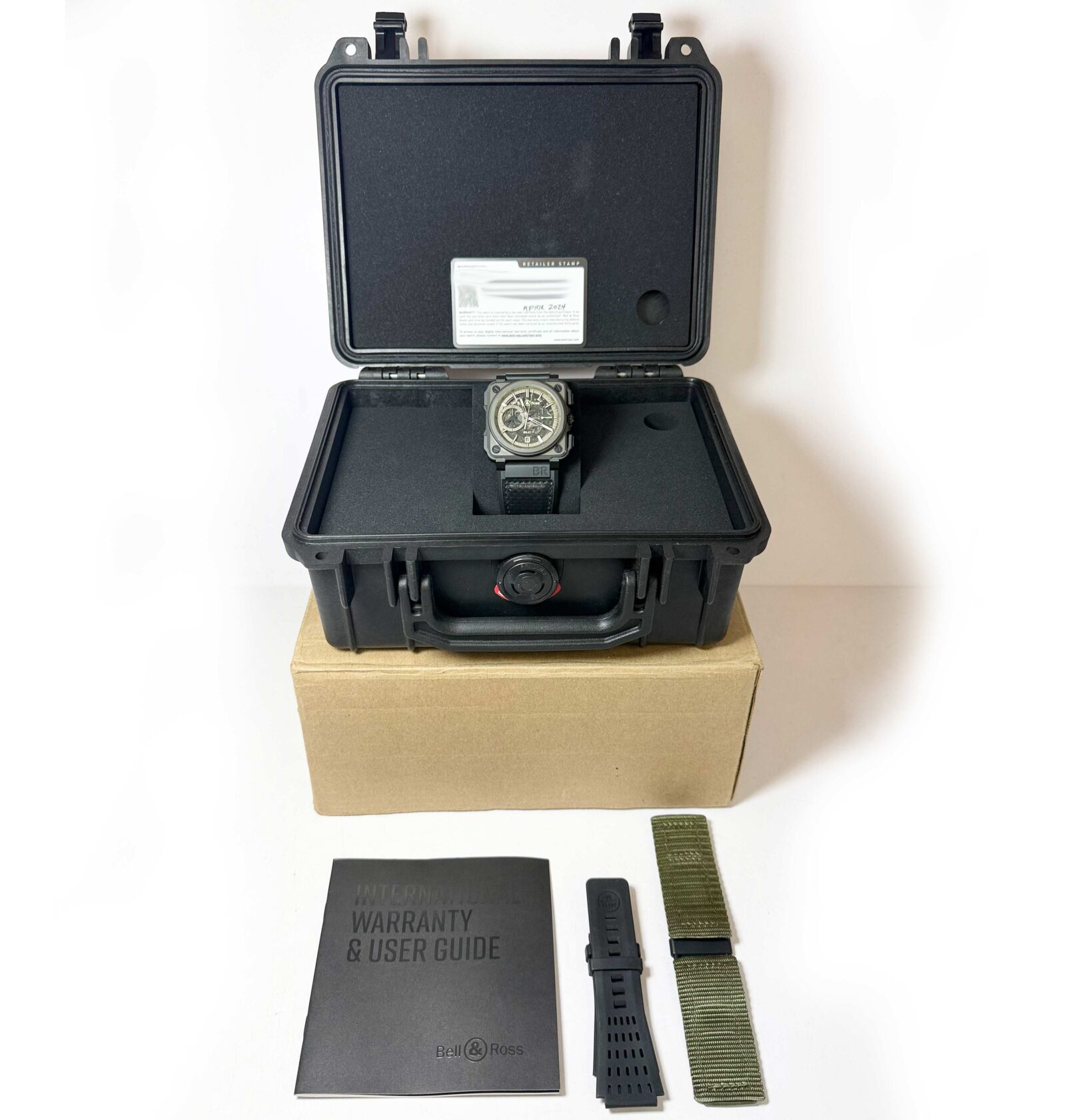 this bell & ross watch is in excellent condition and comes with its box, booklet, 2 additional straps, and warranty card dated april 2024 as shown in the pictures attached. This watch is in stock and available to ship immediately!