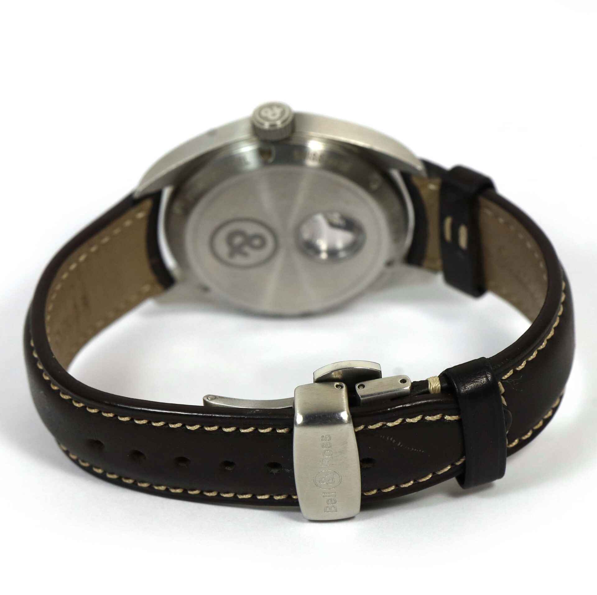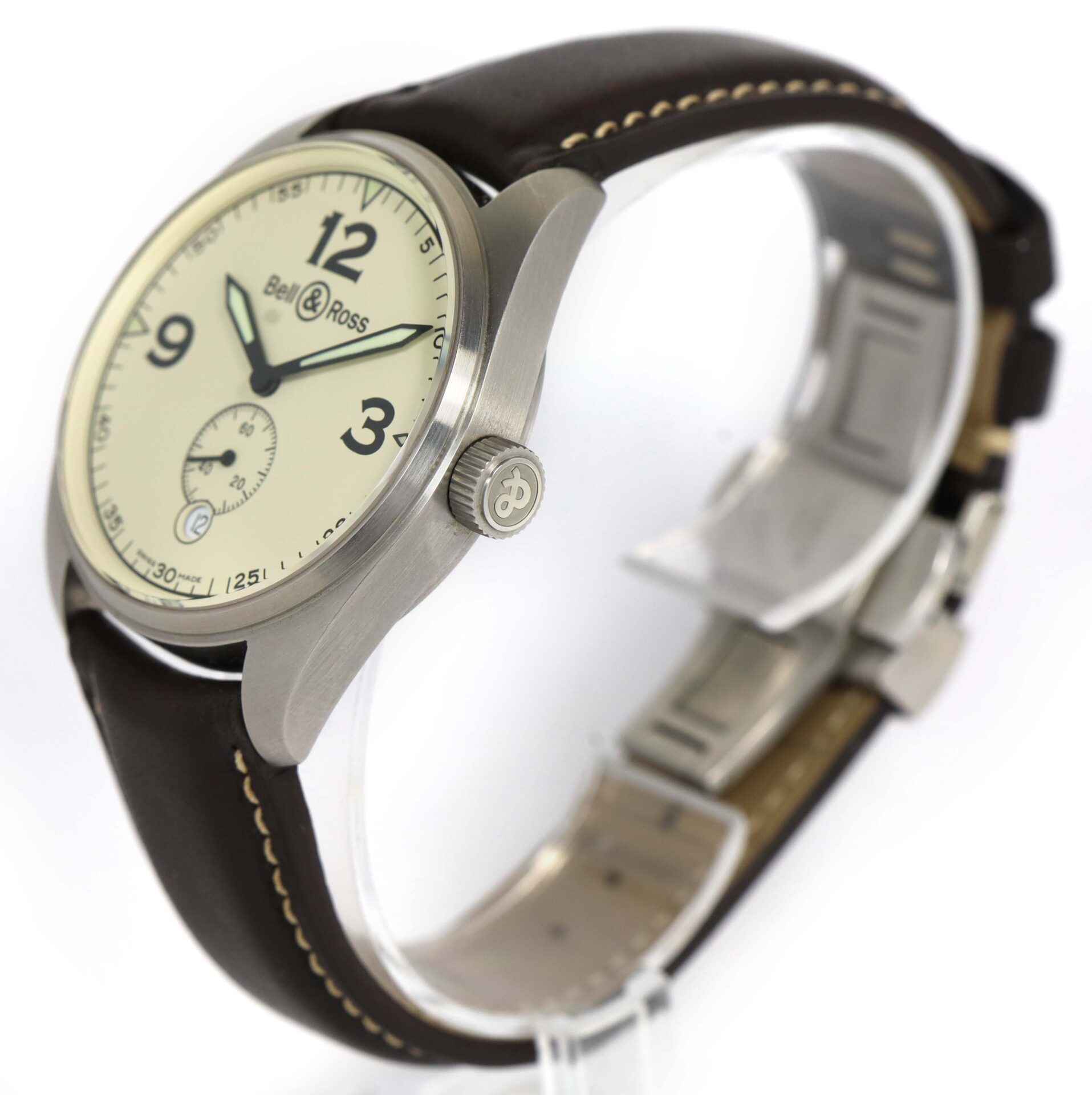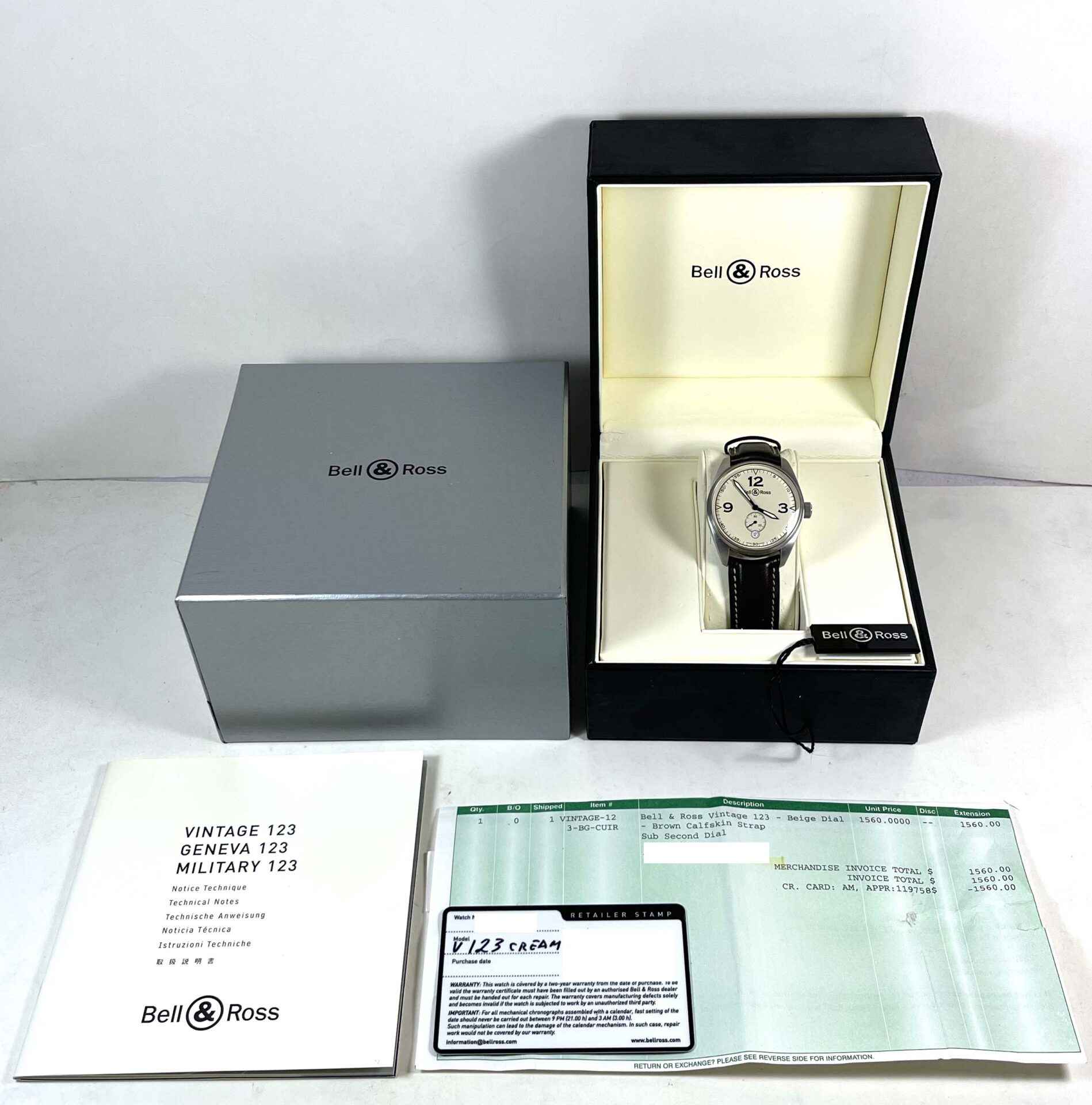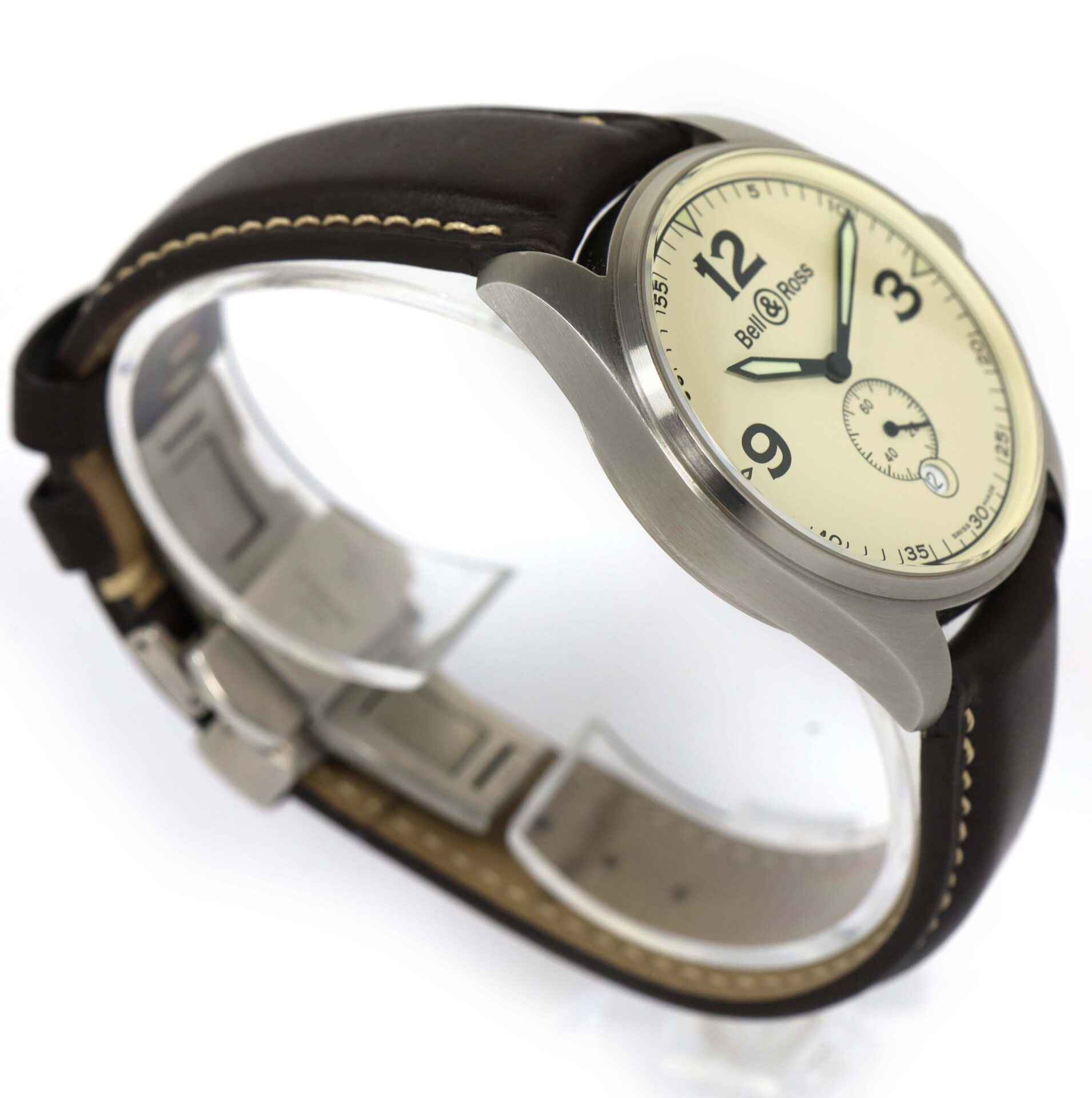 This Bell & Ross is in excellent condition and comes with its box, papers, hang tag, and warranty card as shown in the pictures attached. This watch features a stainless steel case that surrounds a beige dial display...