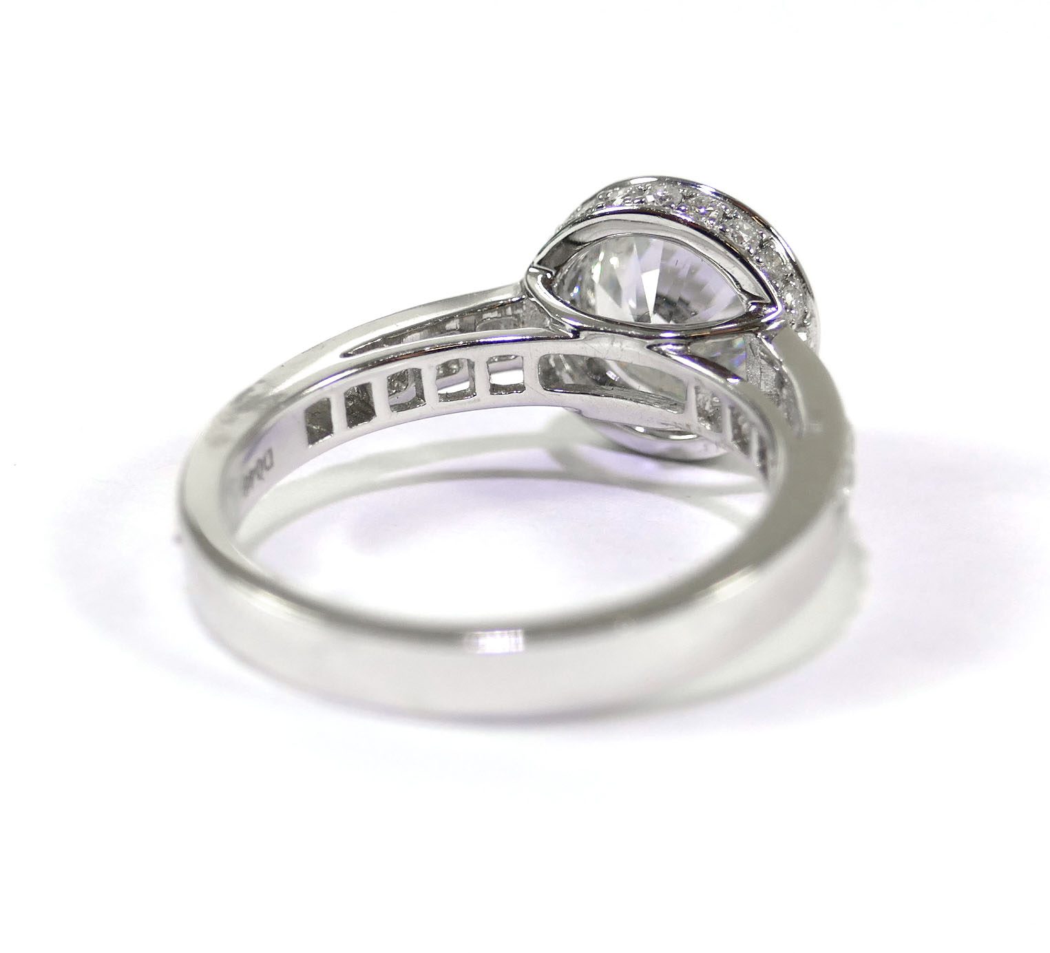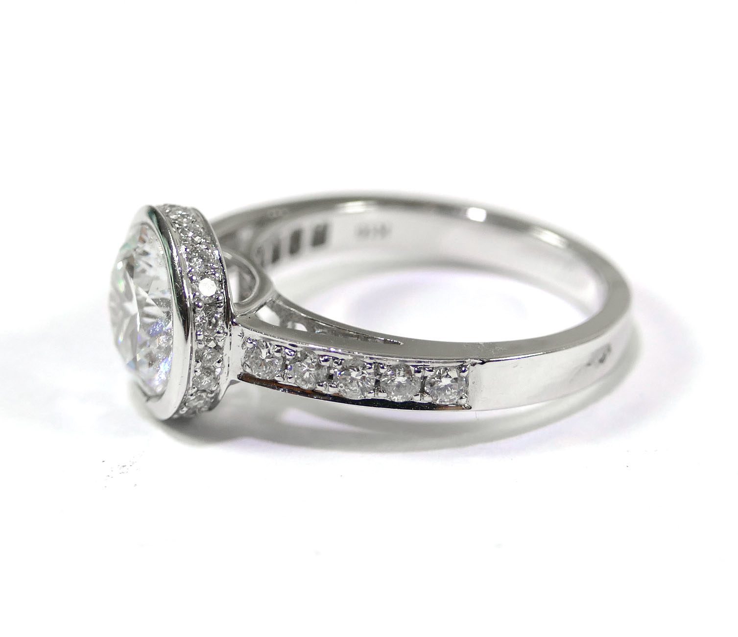 Product Description: This beautiful and elegant engagement ring features a bezel set center stone, with a halo of diamonds going around the bezel. More diamonds extend along the side of the band. Read More