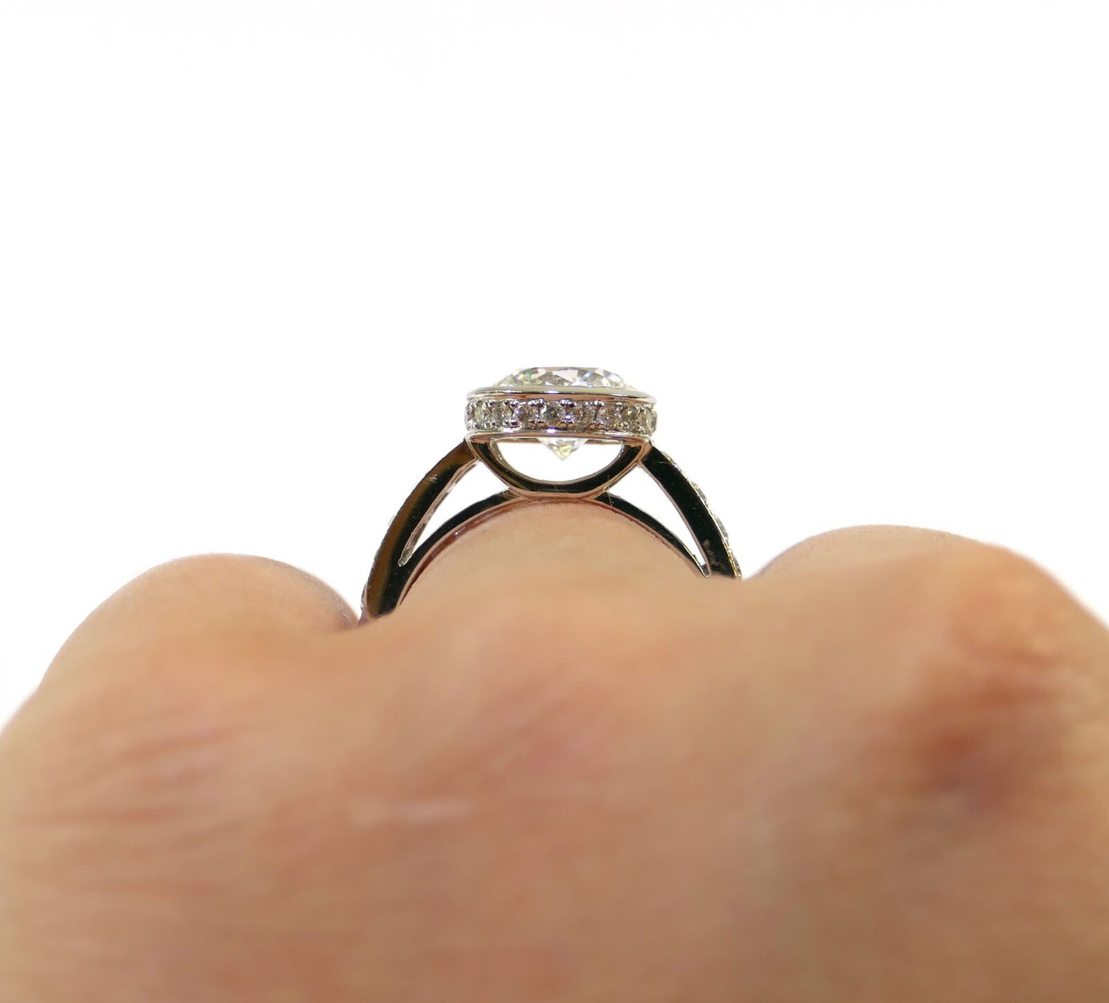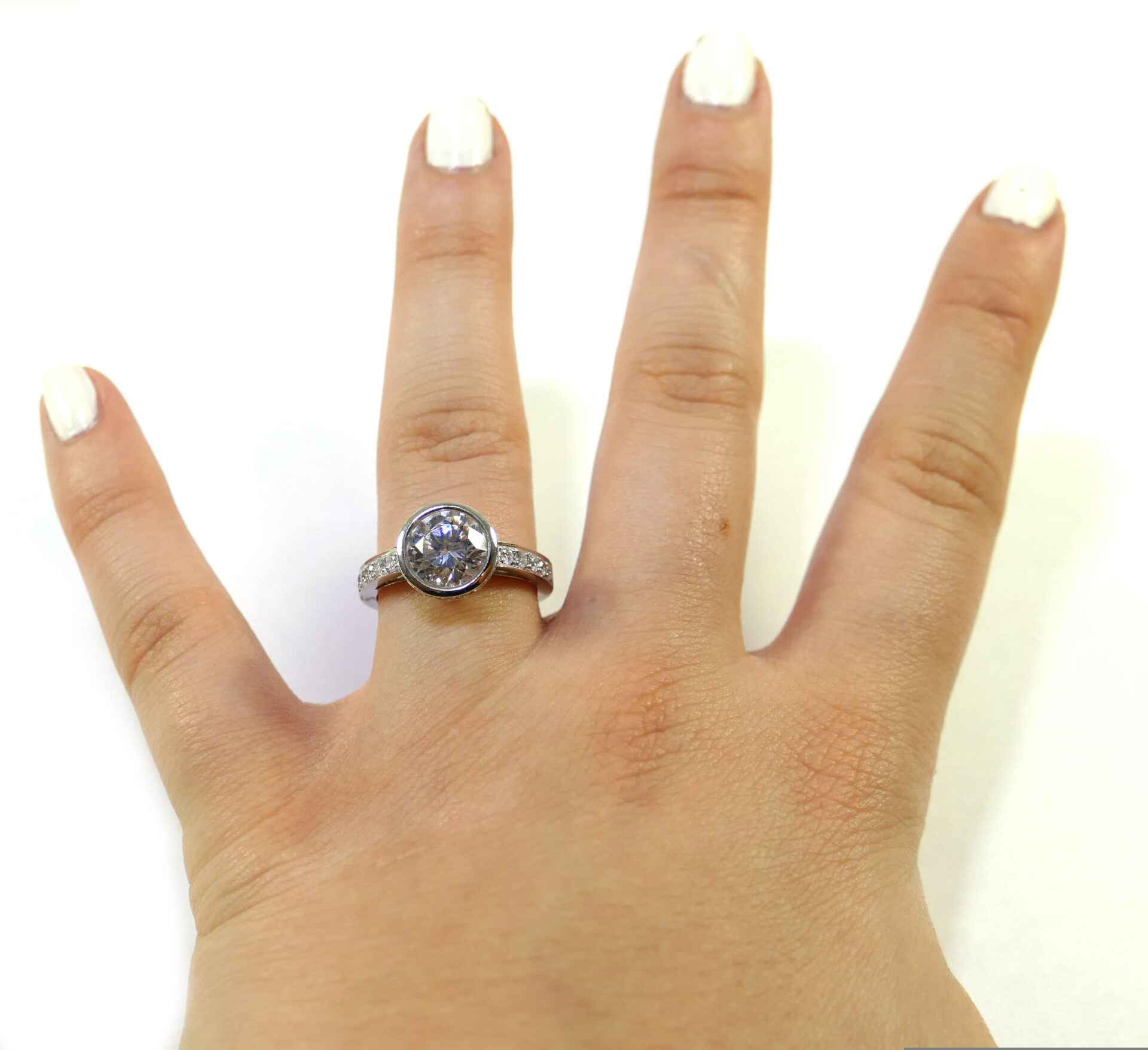 this beautiful and elegant engagement ring features a bezel set center stone, with a halo of diamonds going around the bezel. More diamonds extend along the side of the band. the center stone is currently a cz. The ring will fit a 9mm diamond, and we can help you find the perfect diamond to suit this ring for you.
