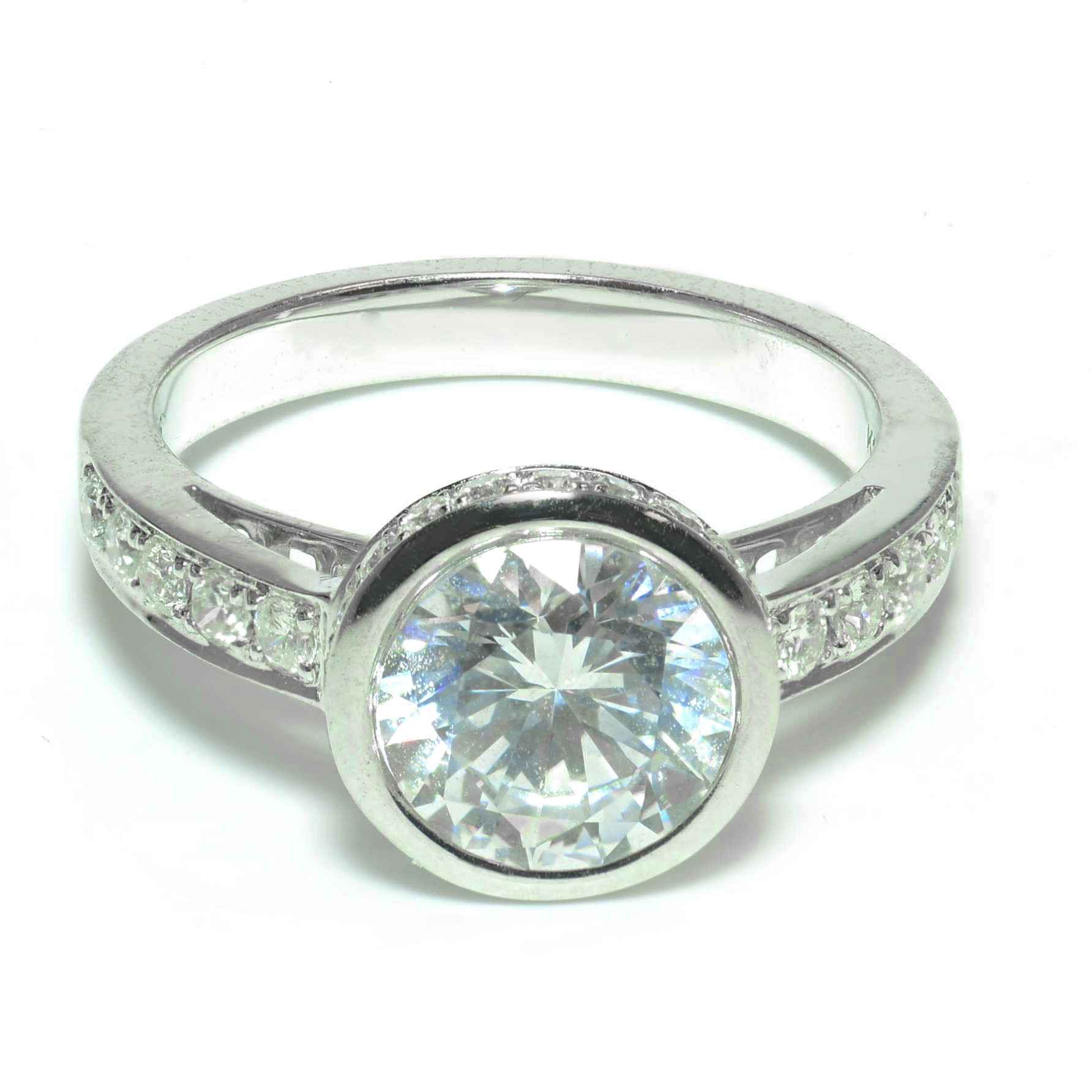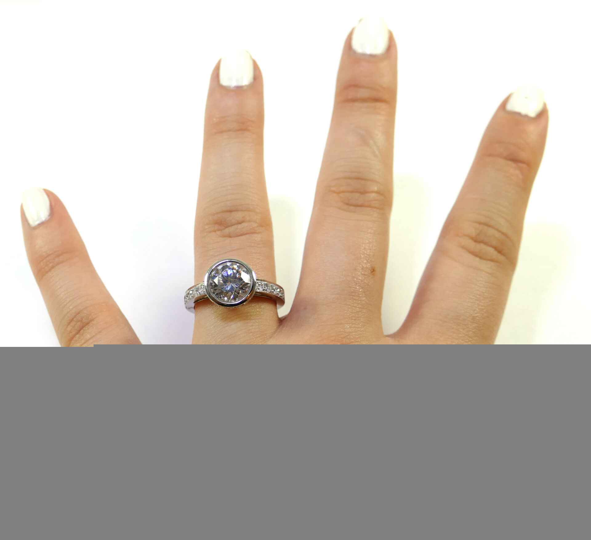 this beautiful and elegant engagement ring features a bezel set center stone, with a halo of diamonds going around the bezel. More diamonds extend along the side of the band. the center stone is currently a cz. The ring will fit a 9mm diamond, and we can help you find the perfect diamond to suit this ring for you.
