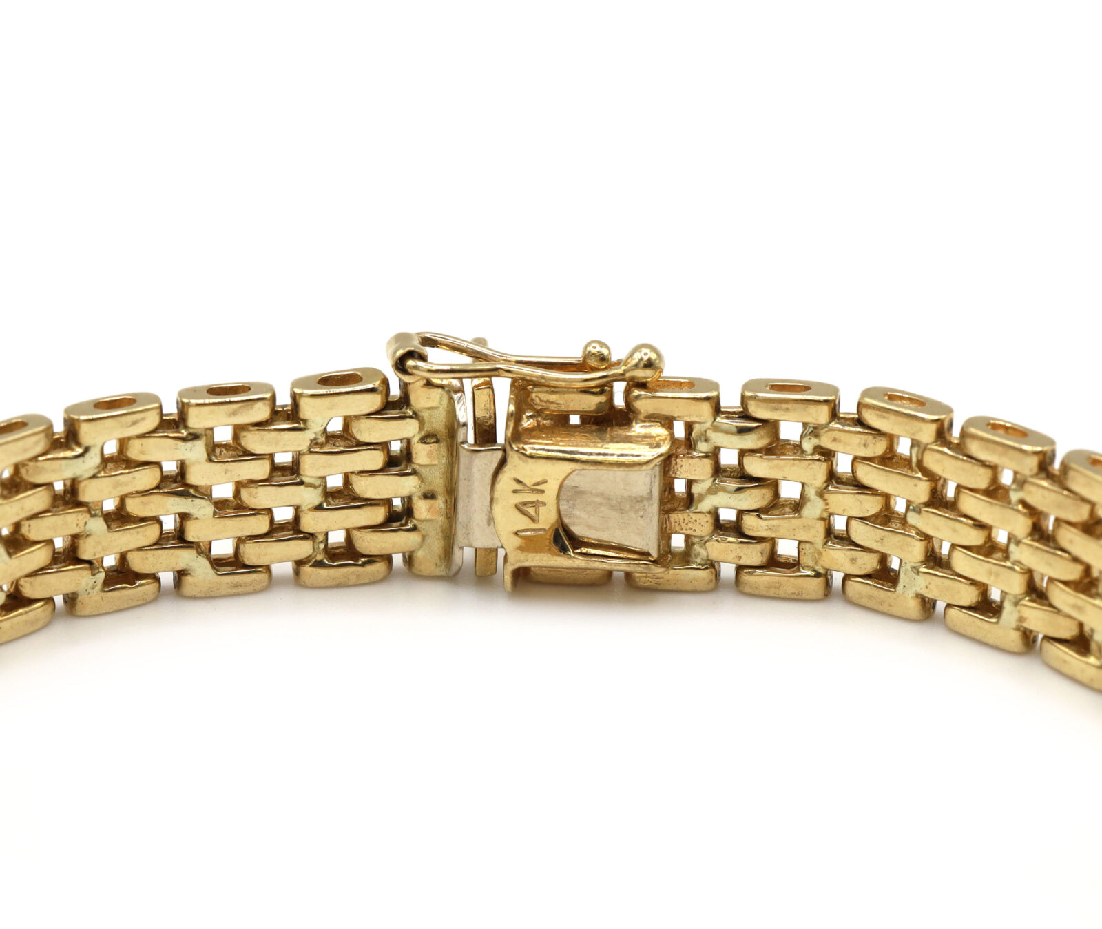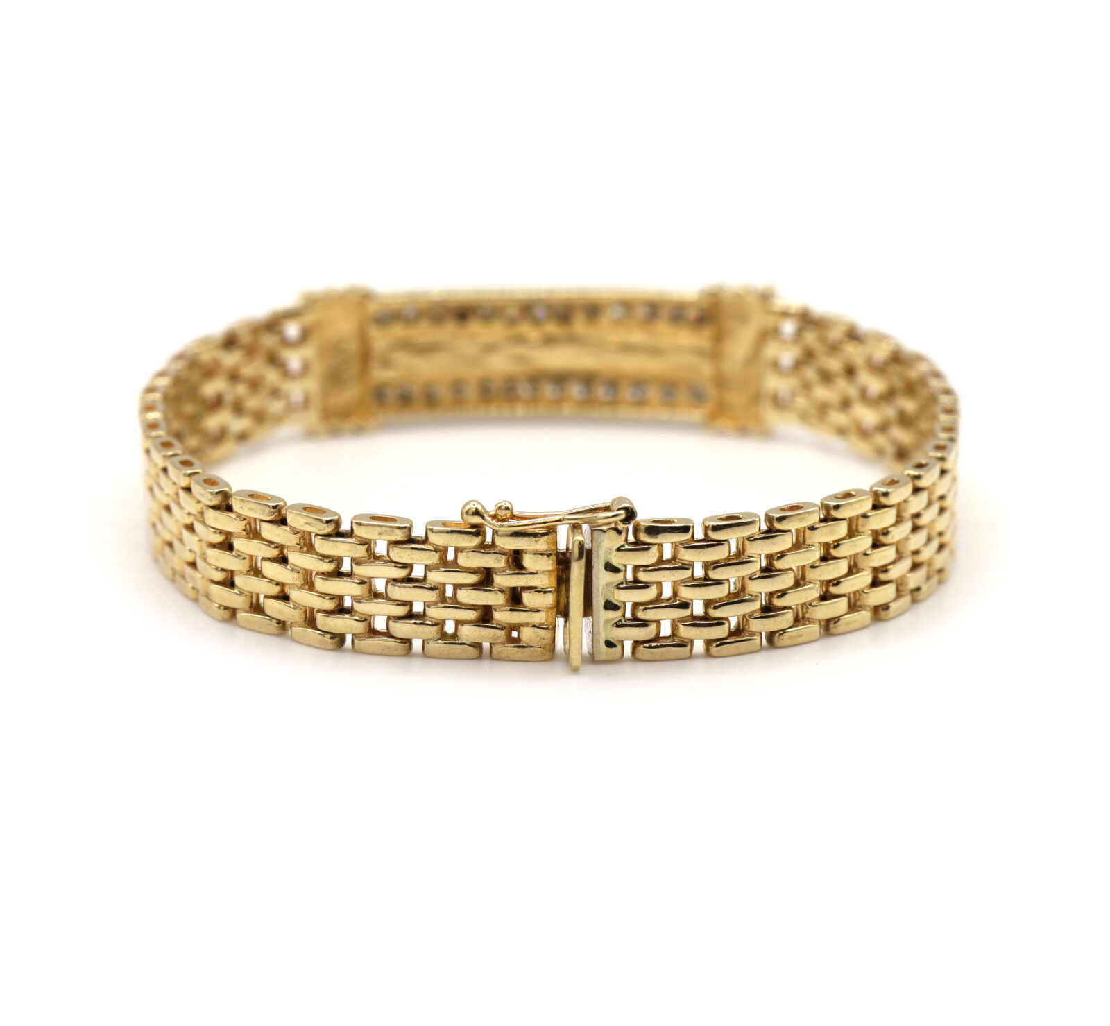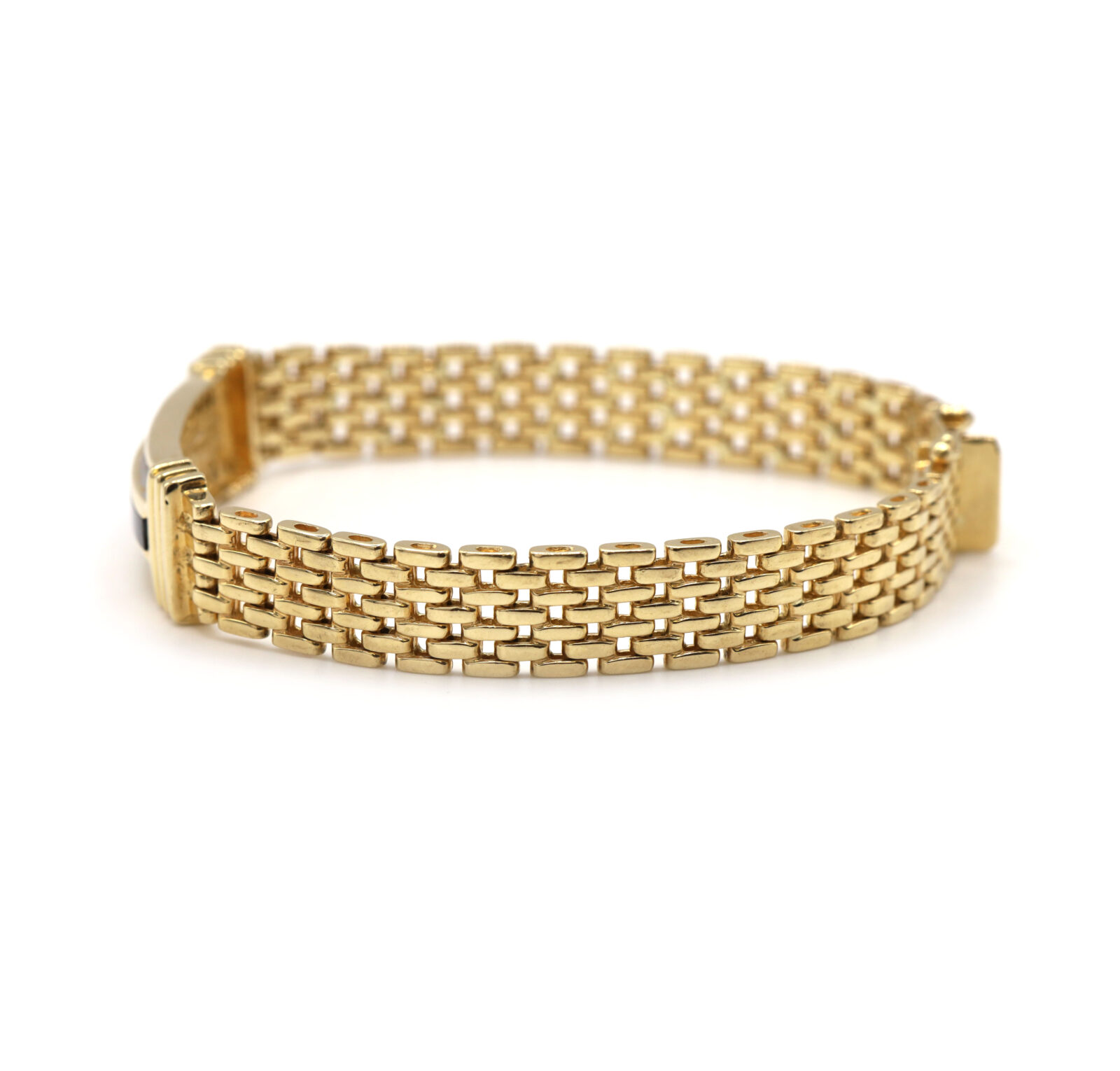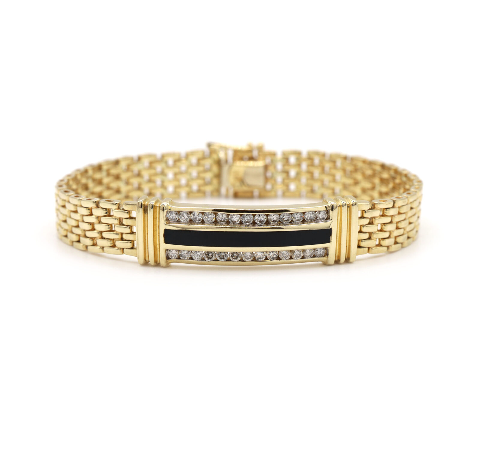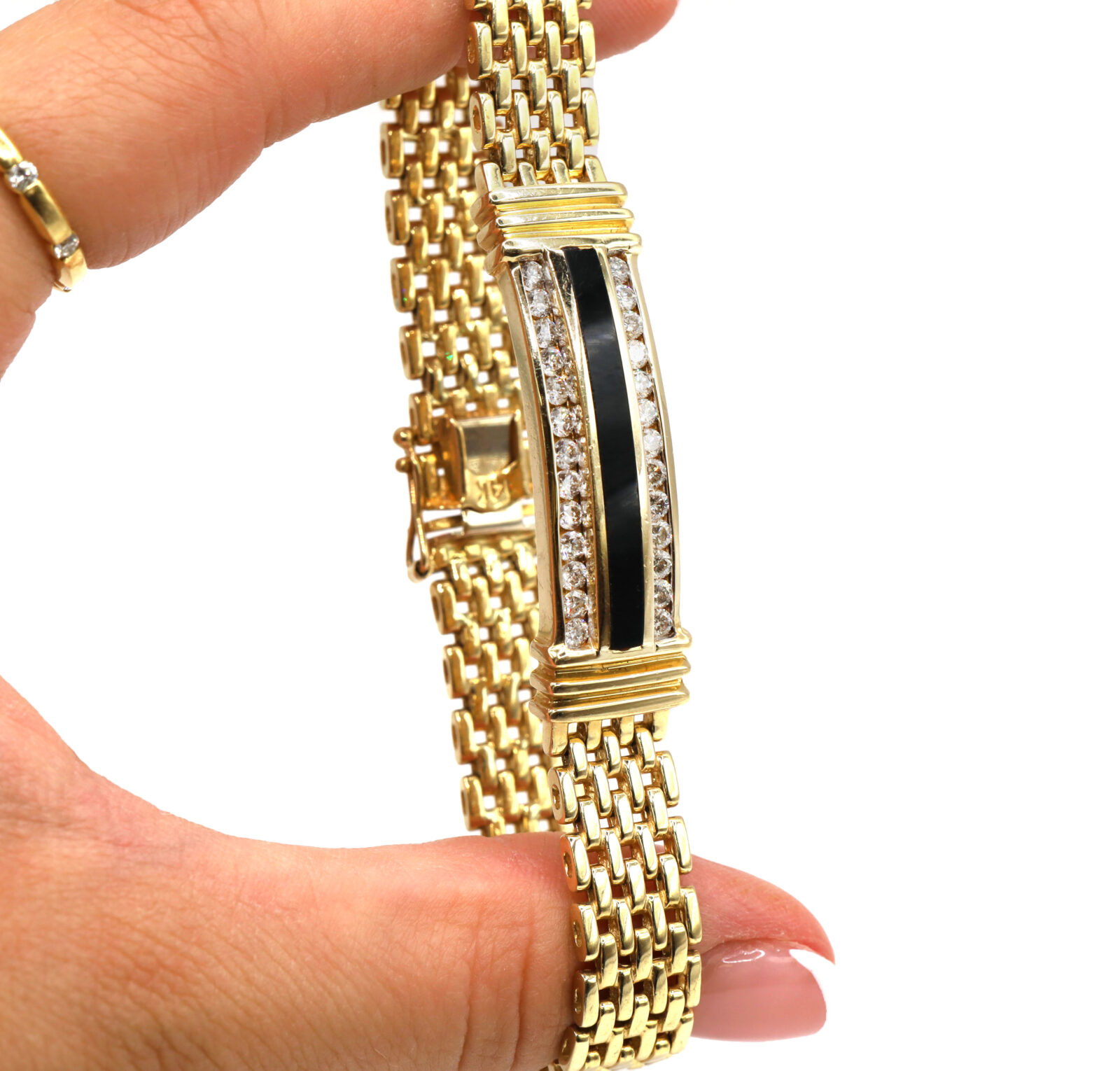Material: 14k Yellow Gold Gemstone: Black Onyx and Natural Diamond Diamond Carat Weight: Approximately 1.30 Carat Clarity: H Color: I1 Length: 8 Inches Type: Channel Set Bracelet Width: 13mm Weight: 42.3 Grams