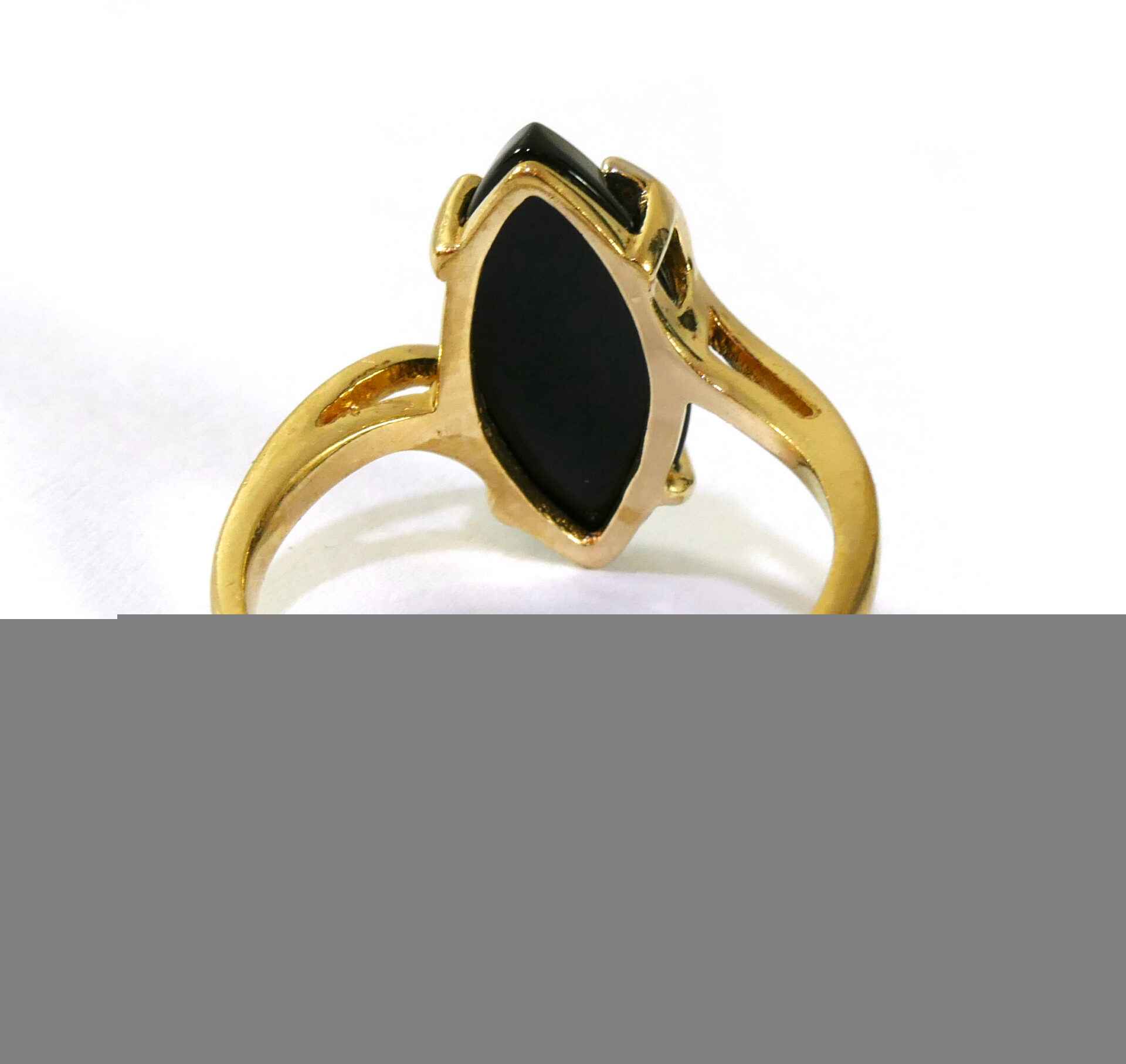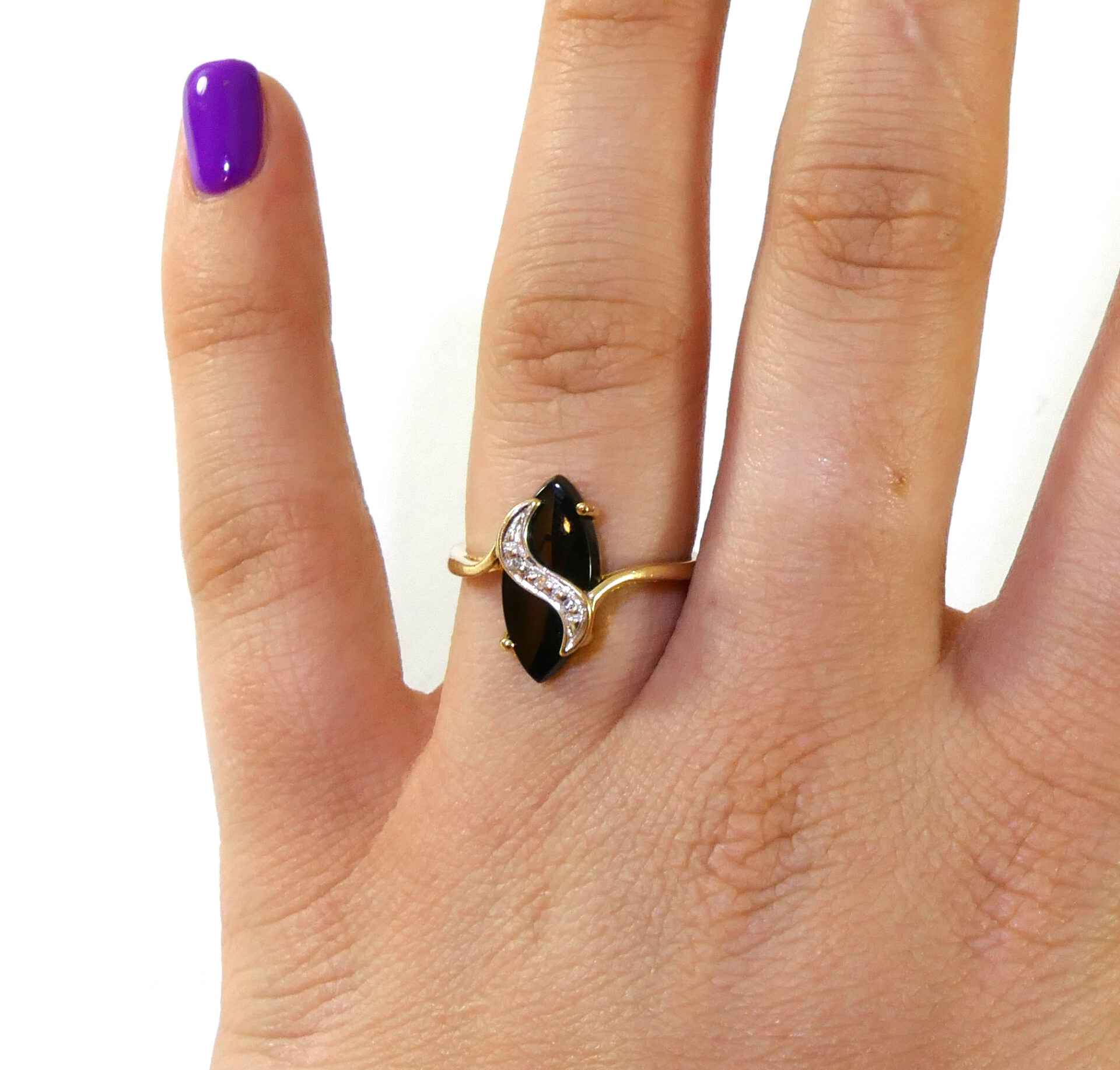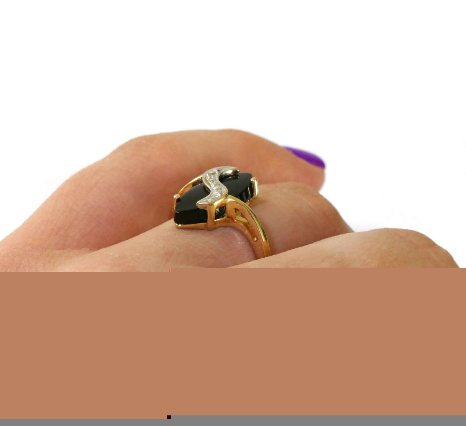Product Description: This beautiful black Onyx ring has a sliver of small round diamonds, set into 10k yellow gold. The black Onyx is cut into a marquise shape, giving the ring definition and elegancy,  ...