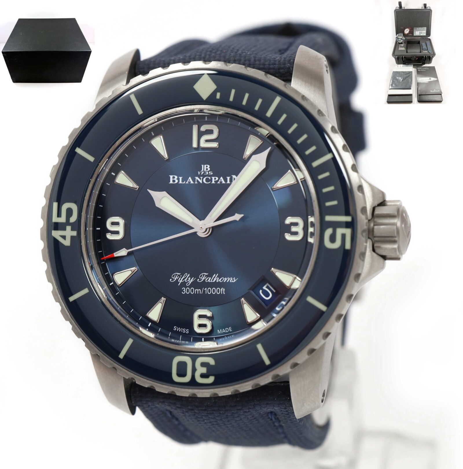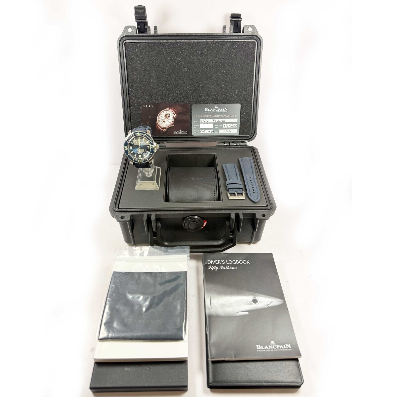 this blancpain watch is in excellent condition and comes with its box, booklets, one additional blue strap, and warranty card dated june 19th, 2022 as shown in the pictures attached. This watch is in stock and available to ship immediately!