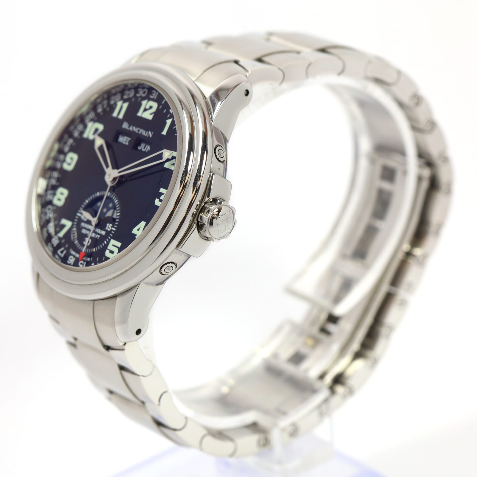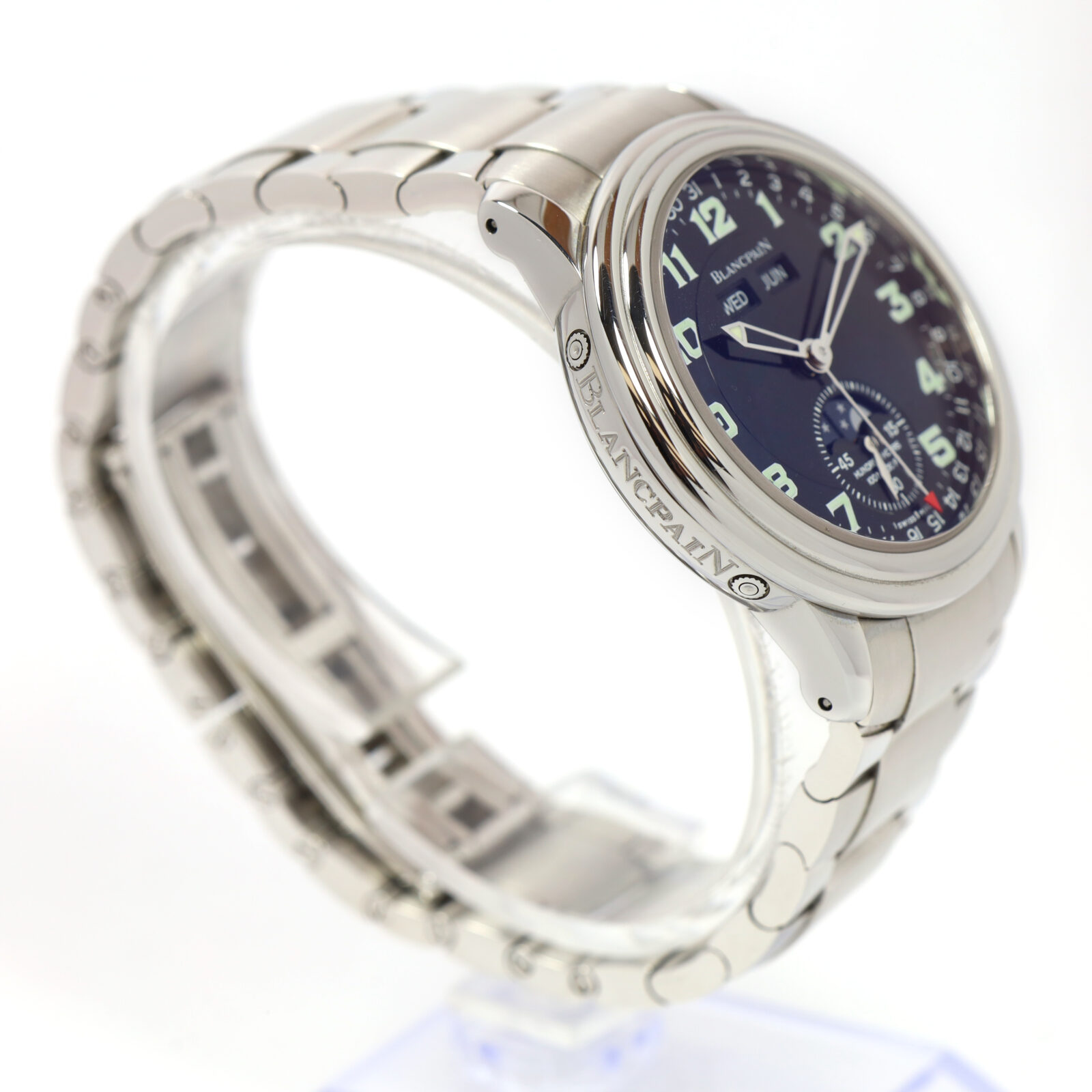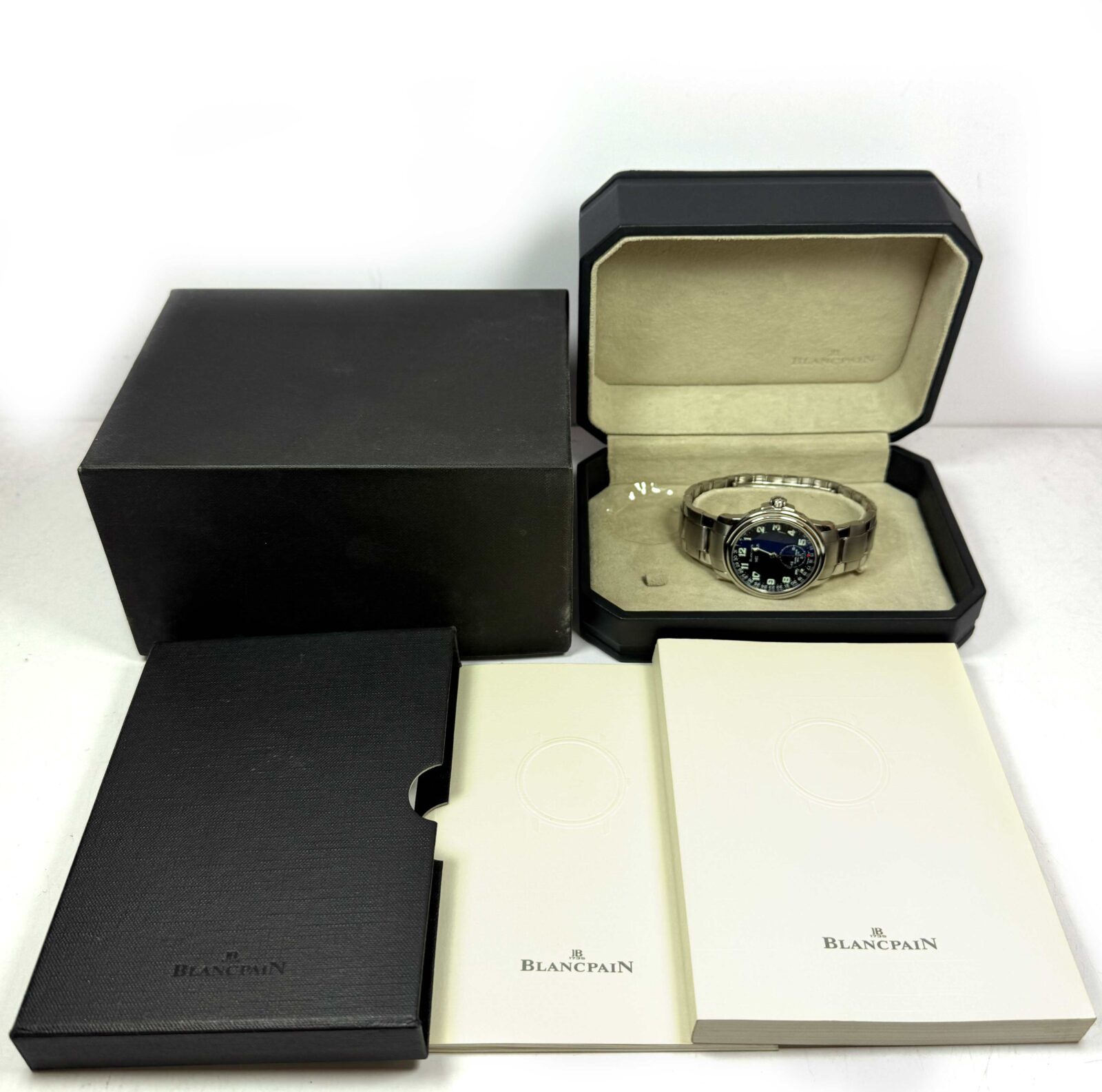 this blancpain watch is in excellent overall condition showing some light signs of surface wear consistent with preowned watches. This comes with its box, booklets, and warranty paper dated november 2001 as shown in the pictures attached. This watch is in stock and available to ship immediately!