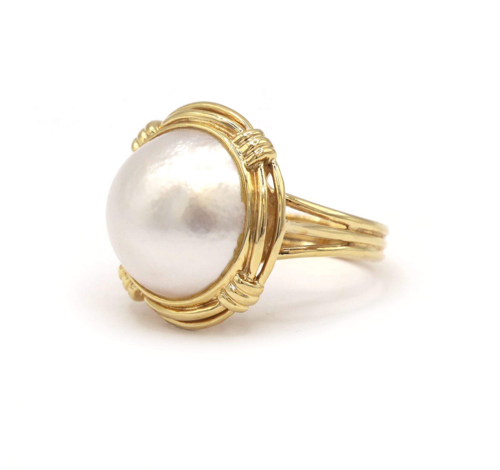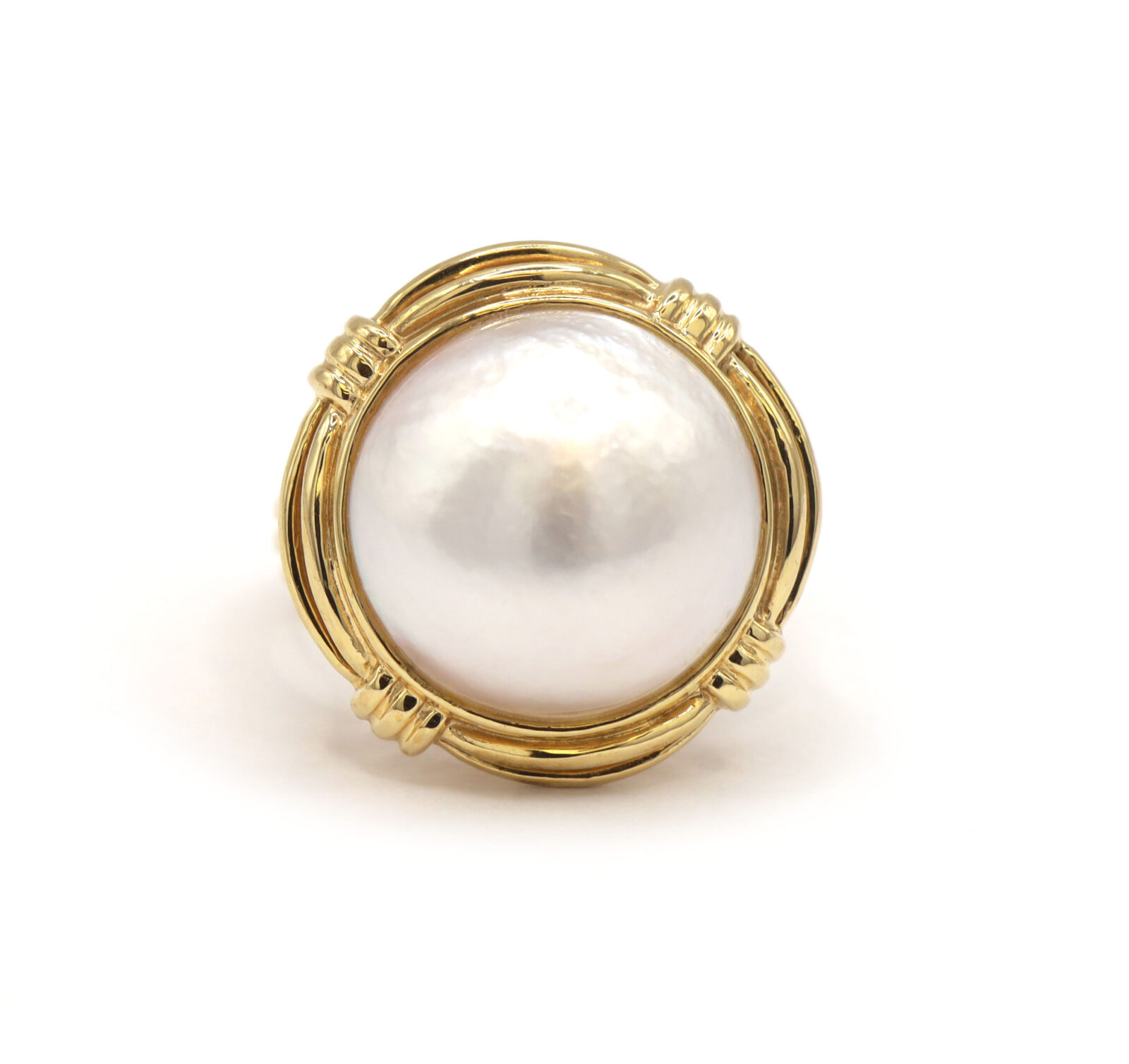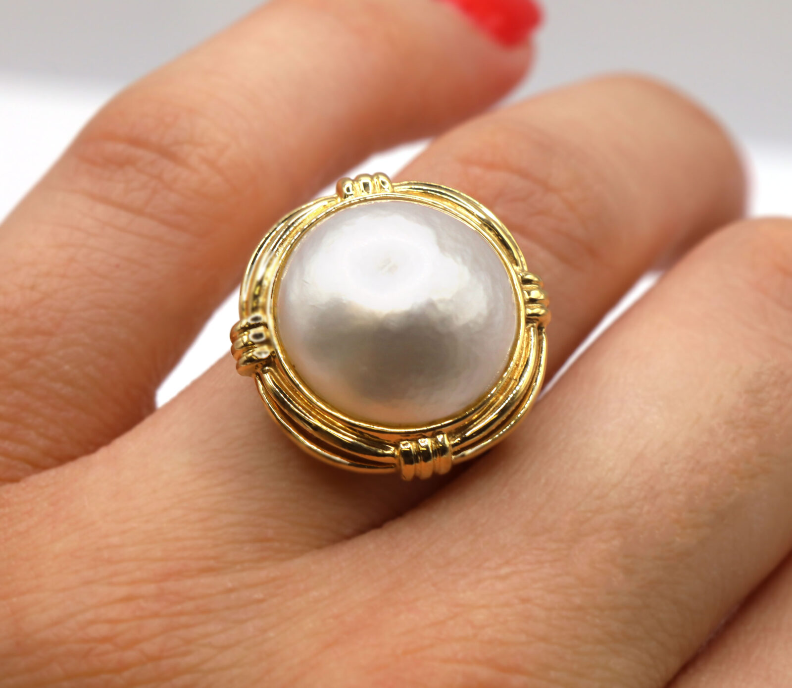Material: 18k Yellow Gold Gemstone: Blister Pearl Stone Color: White Stone Cut: Round Cabochon Size: 6.25 Front Width: 20mm Back Width: 3.35mm Weight: 7.8 Grams