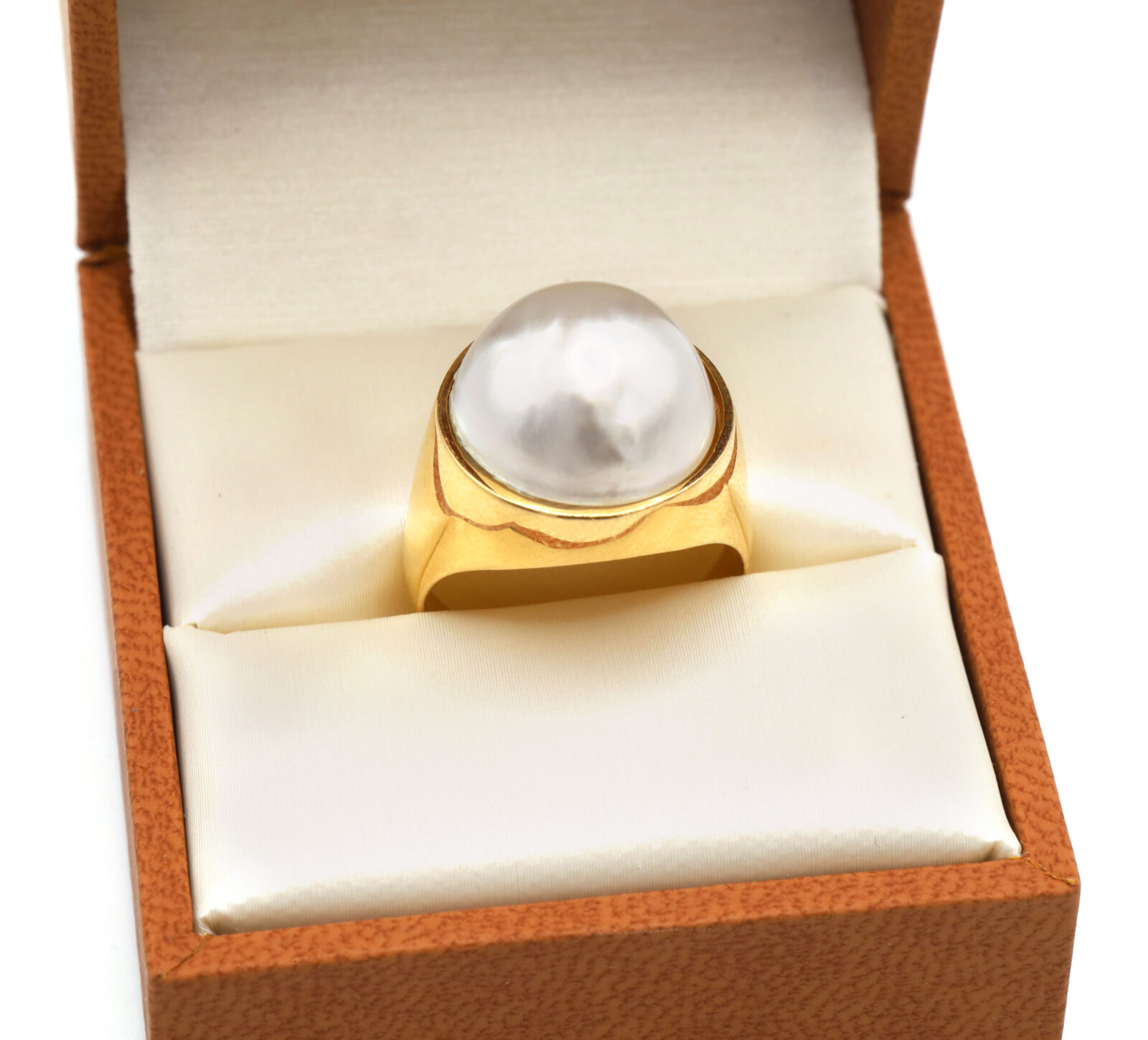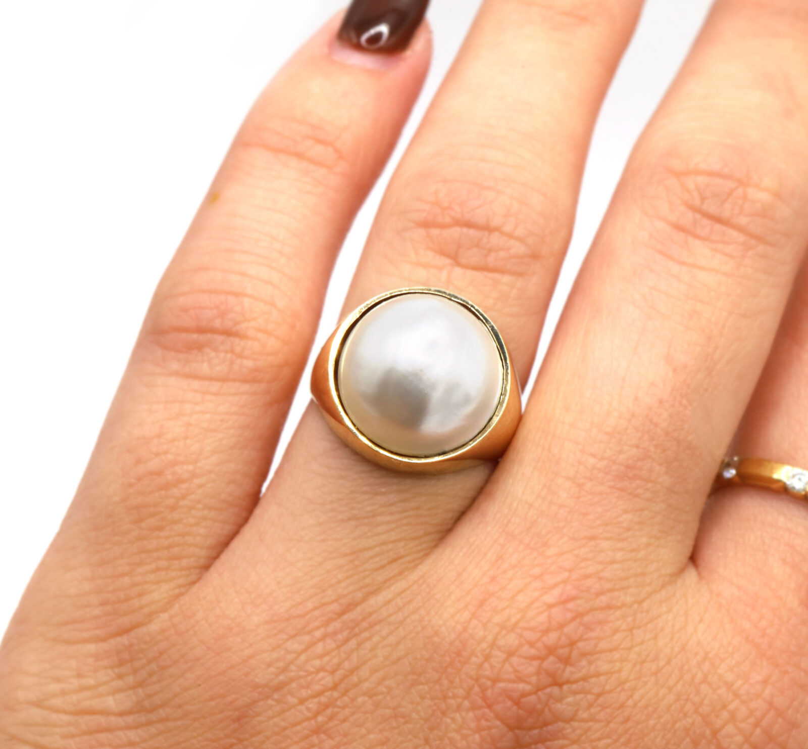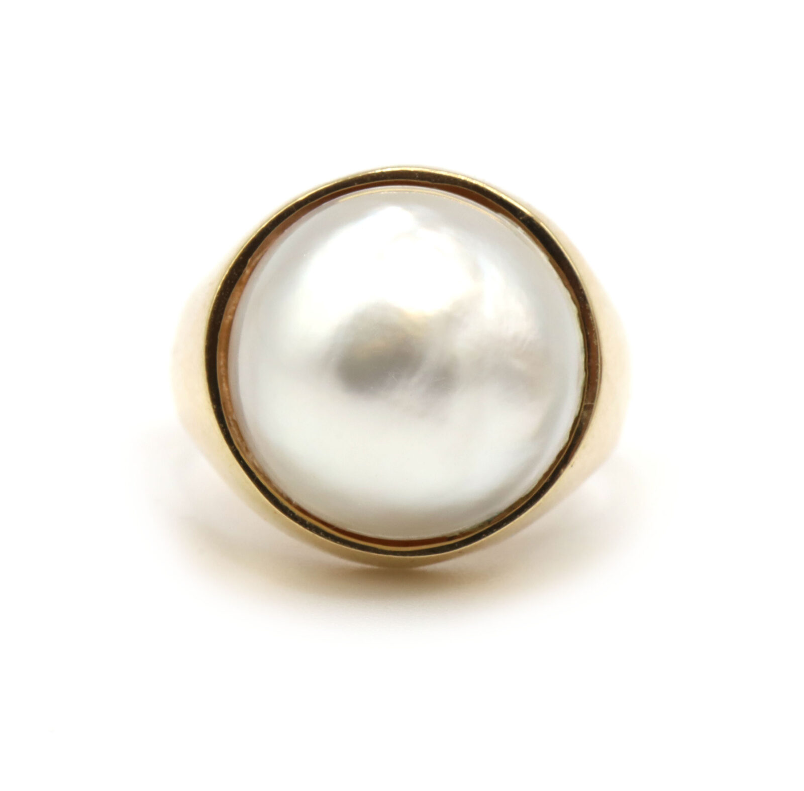 Size: 5.5 Gemstone: South Sea Blister Pearl Pearl Measurements: 13.8 x 13.8 mm Band Measurements: 3mm Material: 14k Yellow Gold Weight: 8 Grams