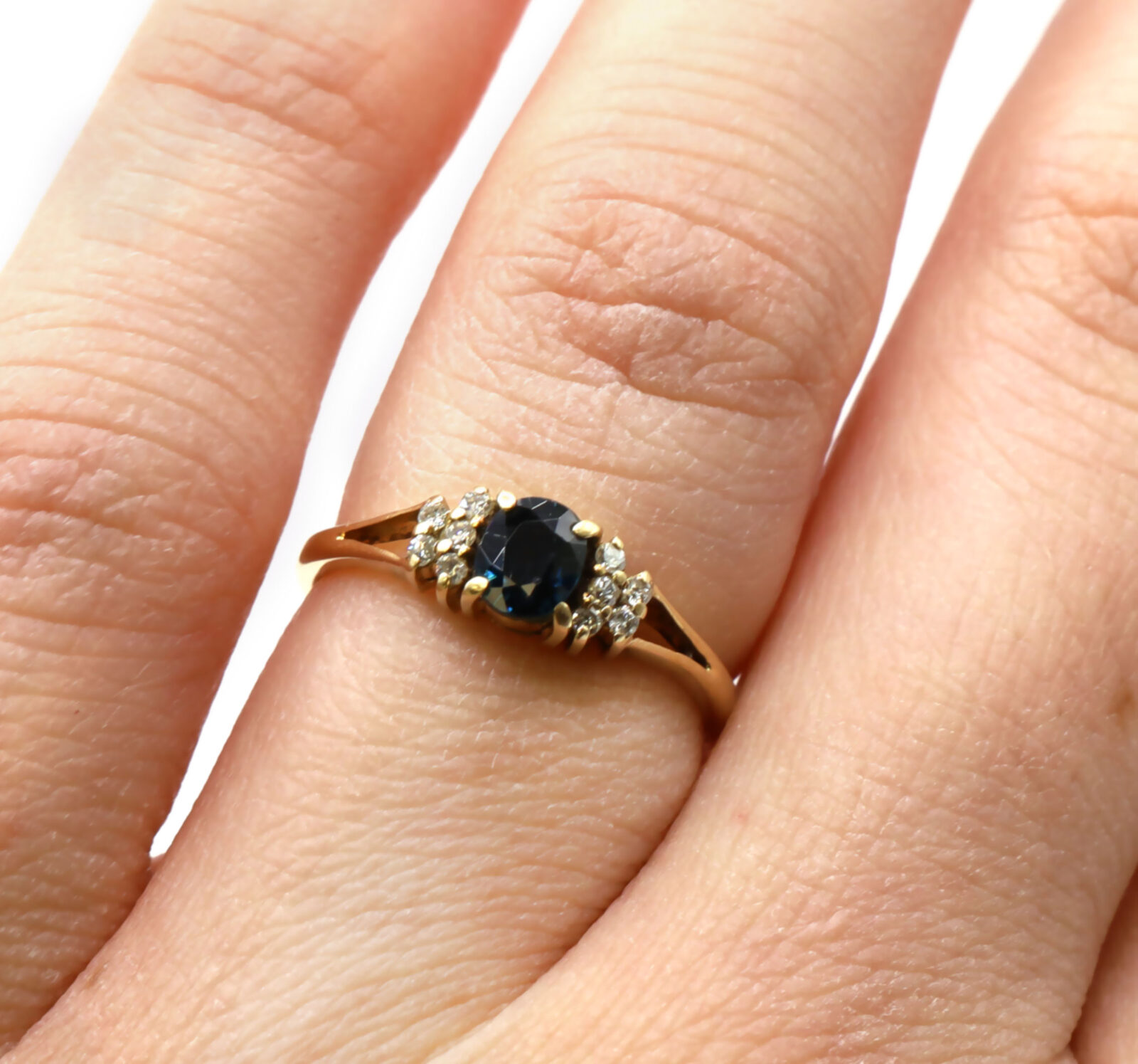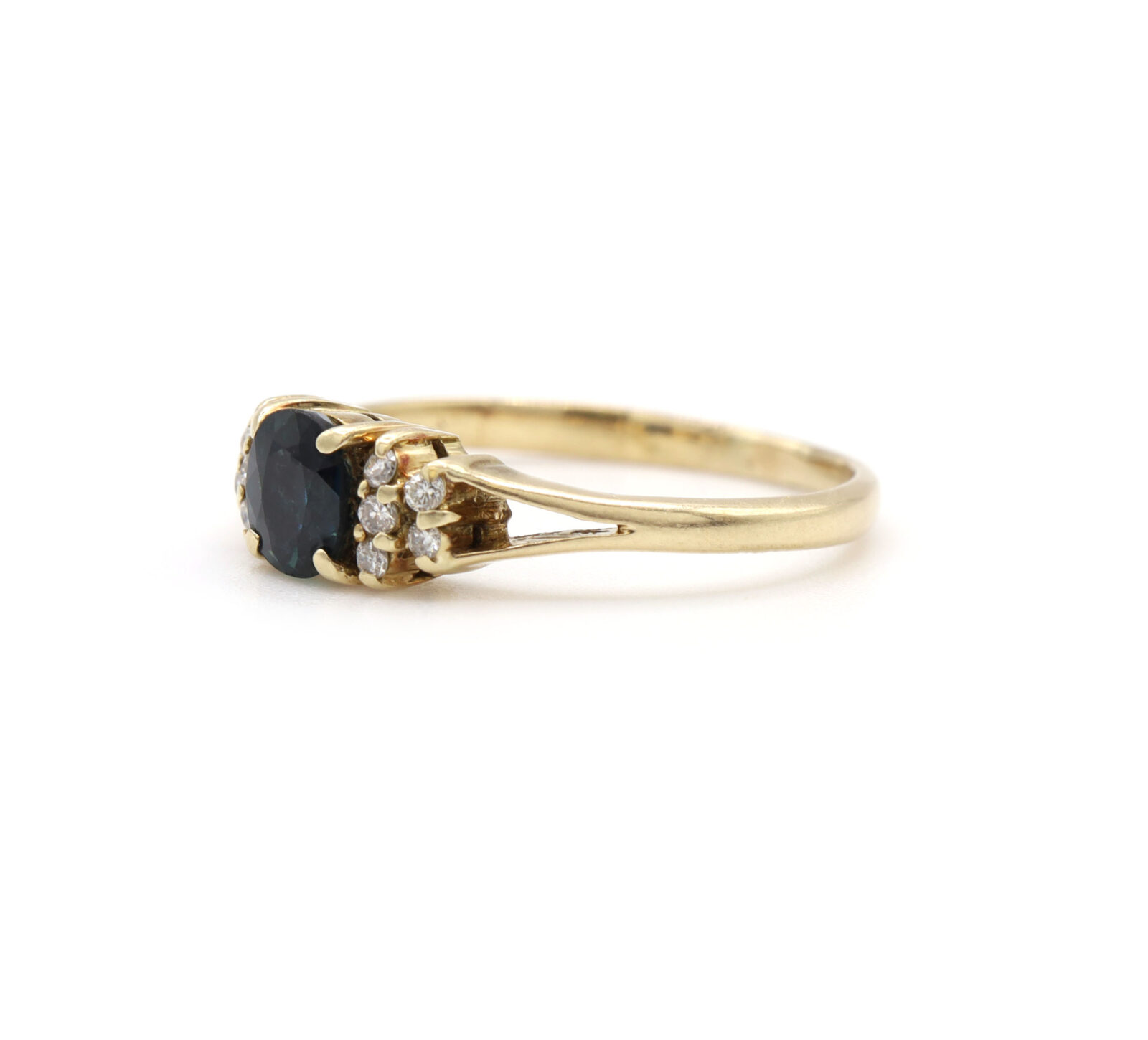 metal: 14k yellow gold band width: 1.5mm size: 4.75 center stone gemstone: sapphire carat weight: approx. 0.36 carat color: blue side stone gemstone: diamond side stone carat weight: approx. 0.1 carat clarity: si2 color: f cut: round brilliant