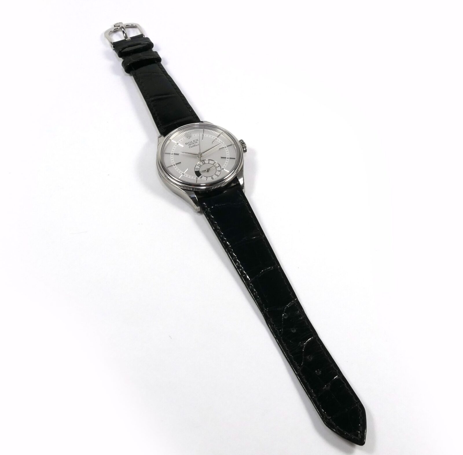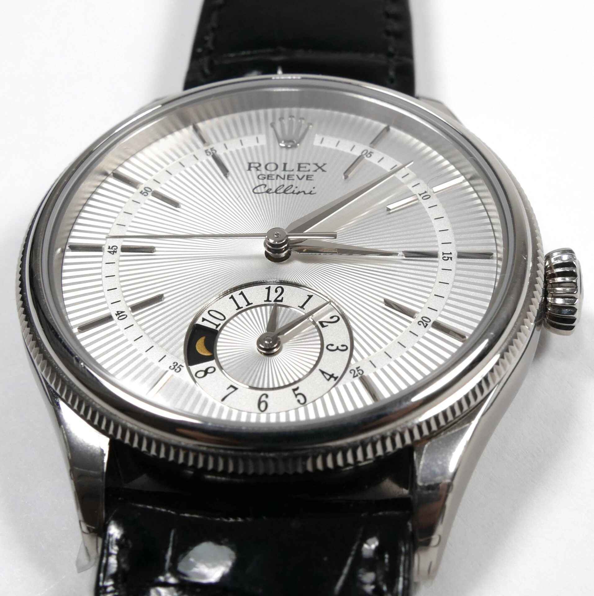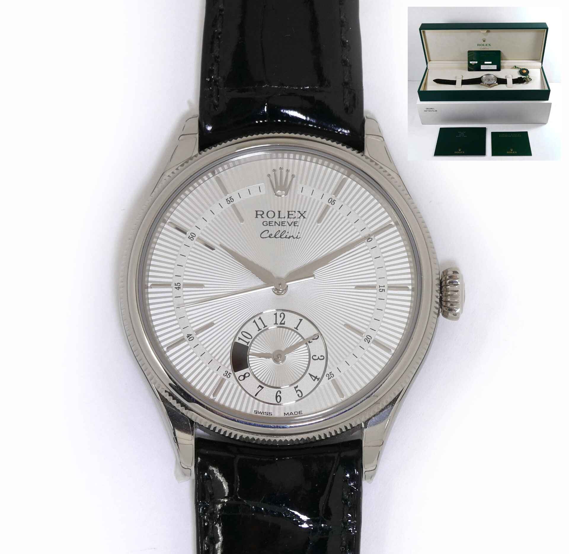 Read Morethis rolex cellini is new and comes with its box, papers, hang tag, and warranty card dated october 12th, 2021. This watch comes on its original crocodile strap, features an 18k white gold case, a silver dial, display of second time zone on the sub-dial with a day/night indicator and also has full stickers as shown in the photos attached.