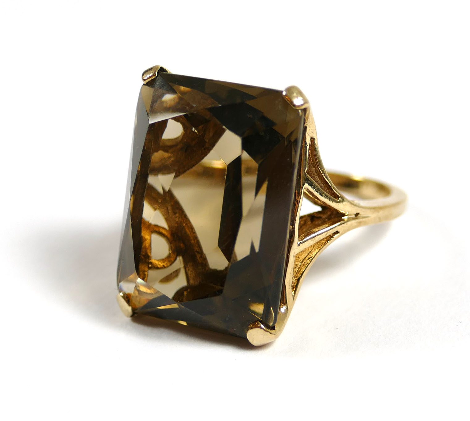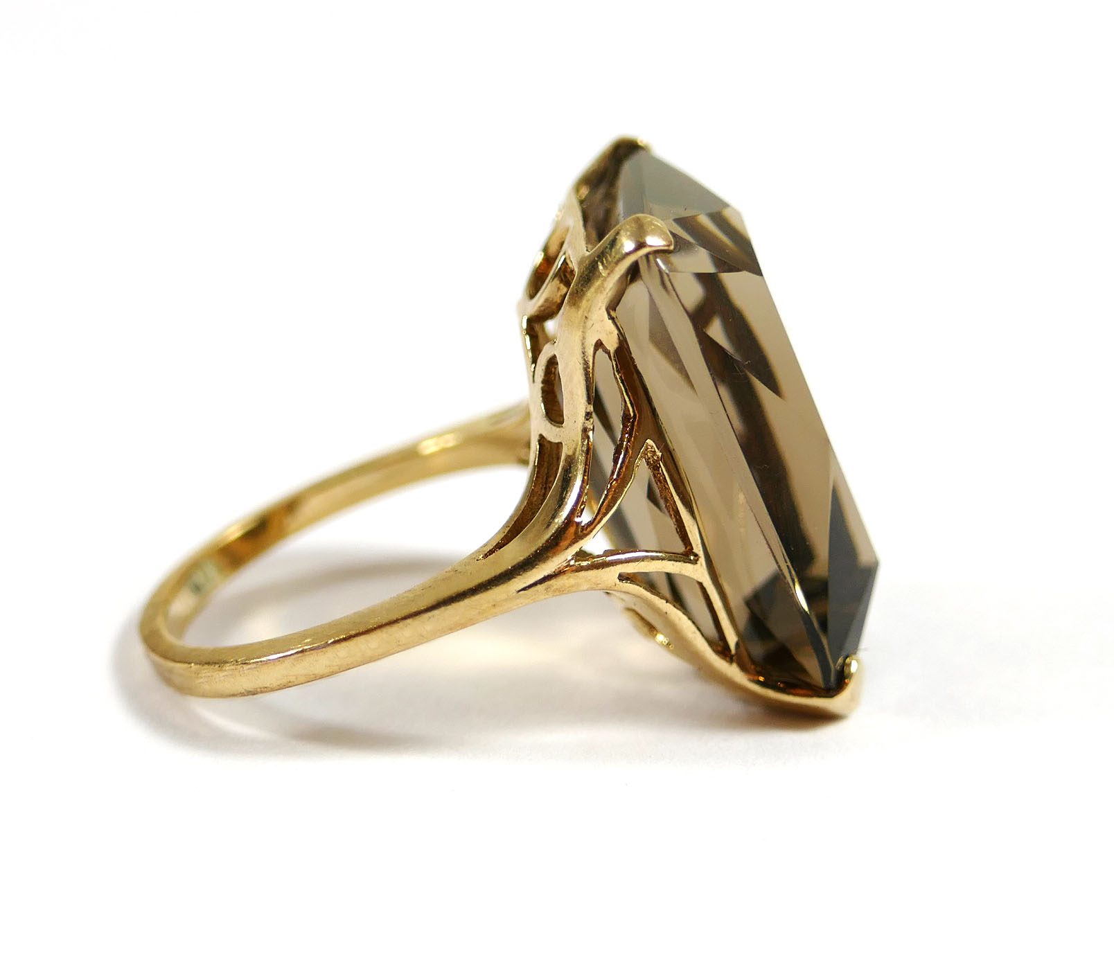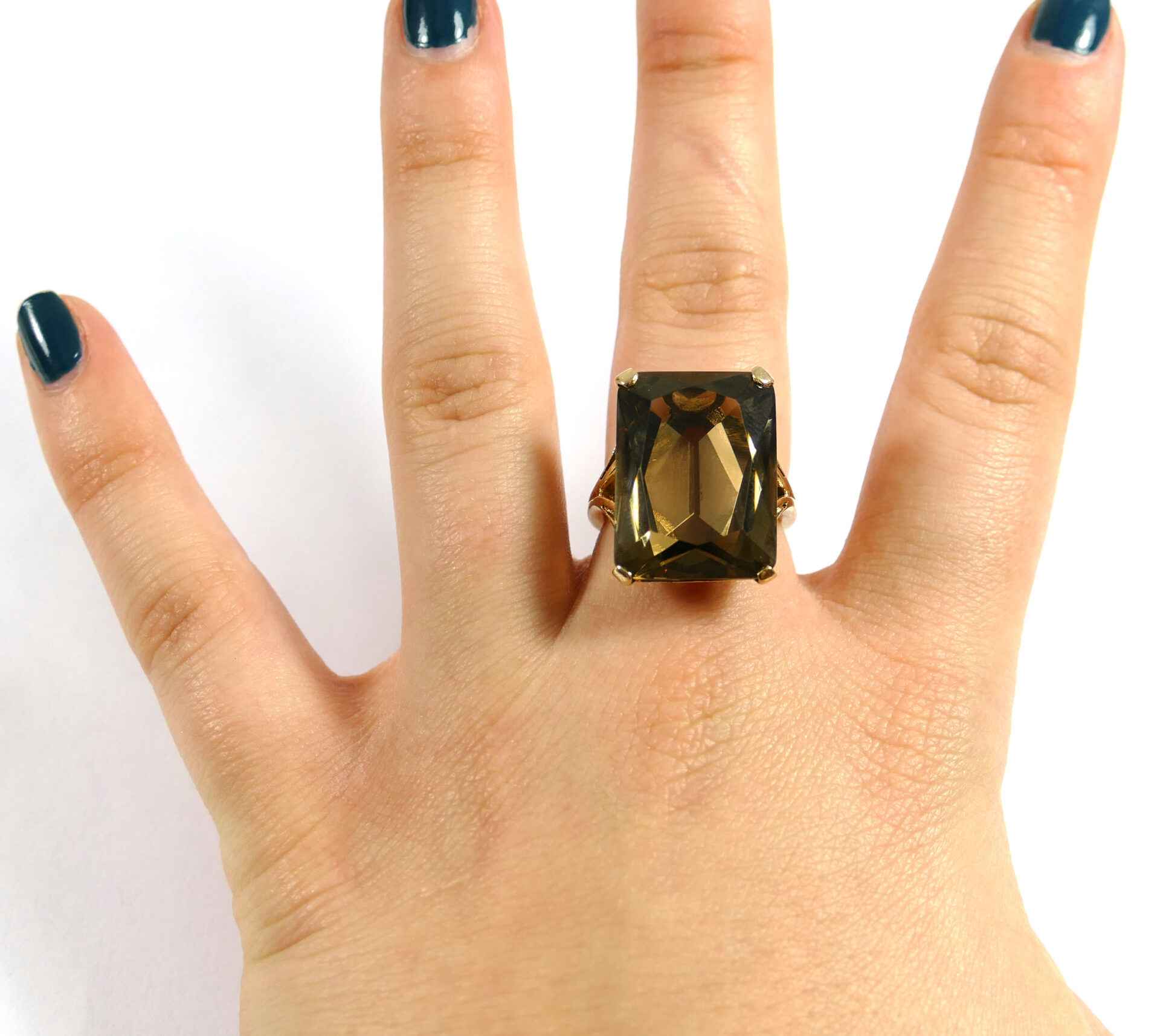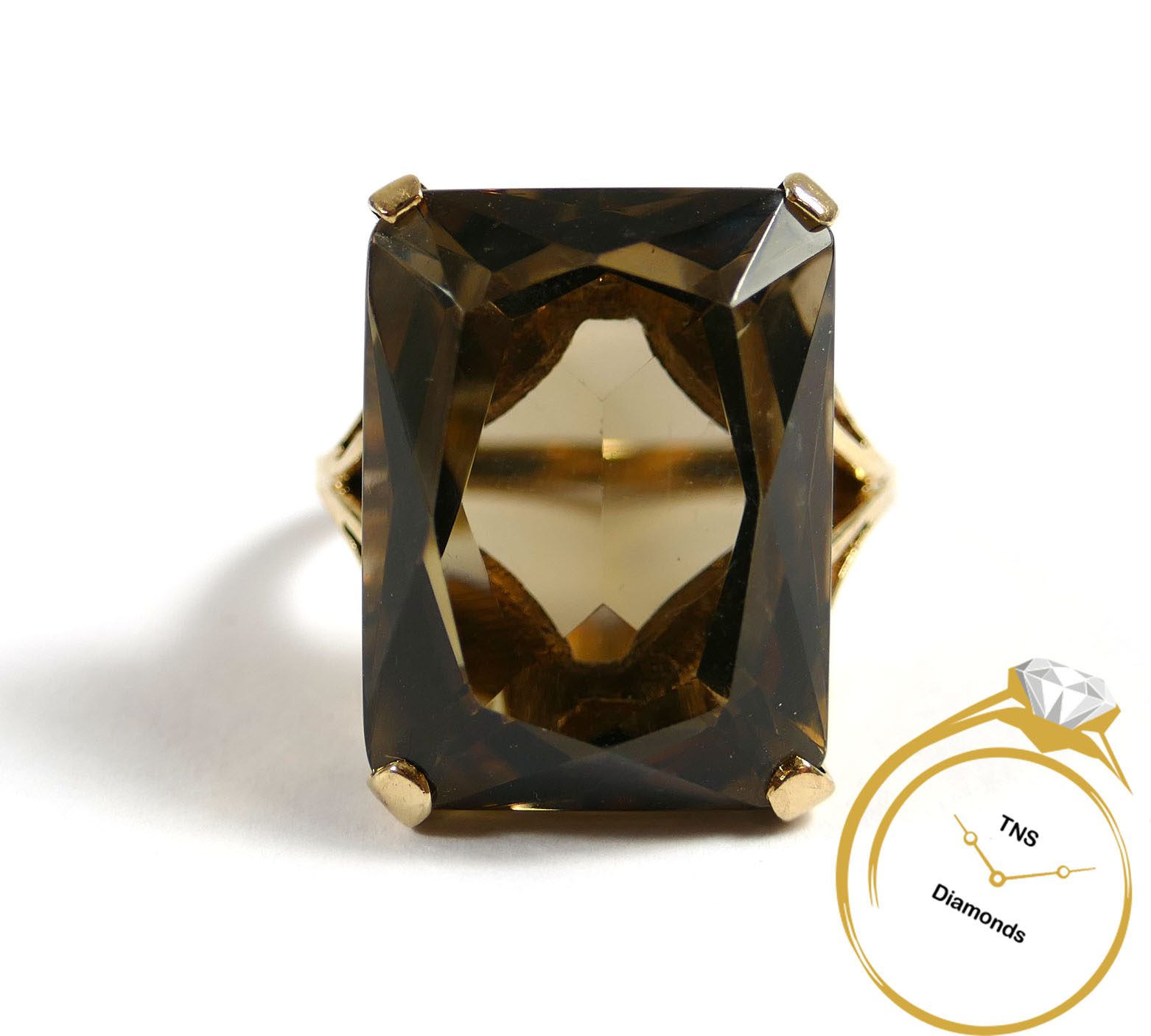 Product Description: This bold ring holds a big Smokey Quartz in a Topaz shape, and is eye catching but sophisticated. This gem lets light shine right through it, and it glistens with beauty. This is definitely a stateme...
