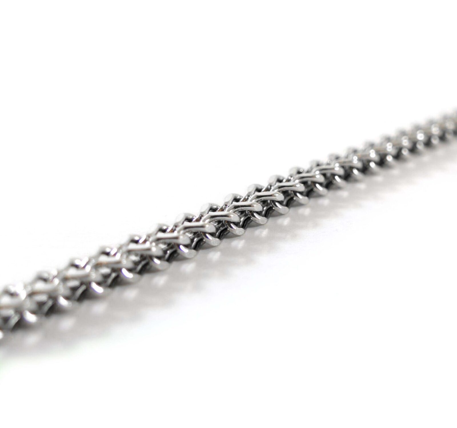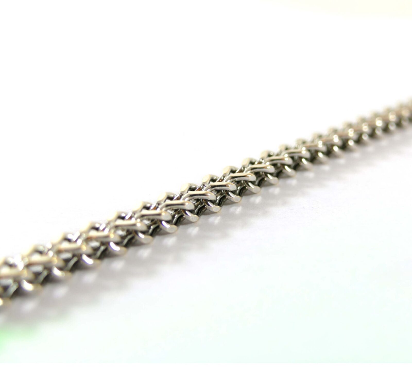 this box franco link chain bracelet is 14k white gold, and 8.75 inches long.