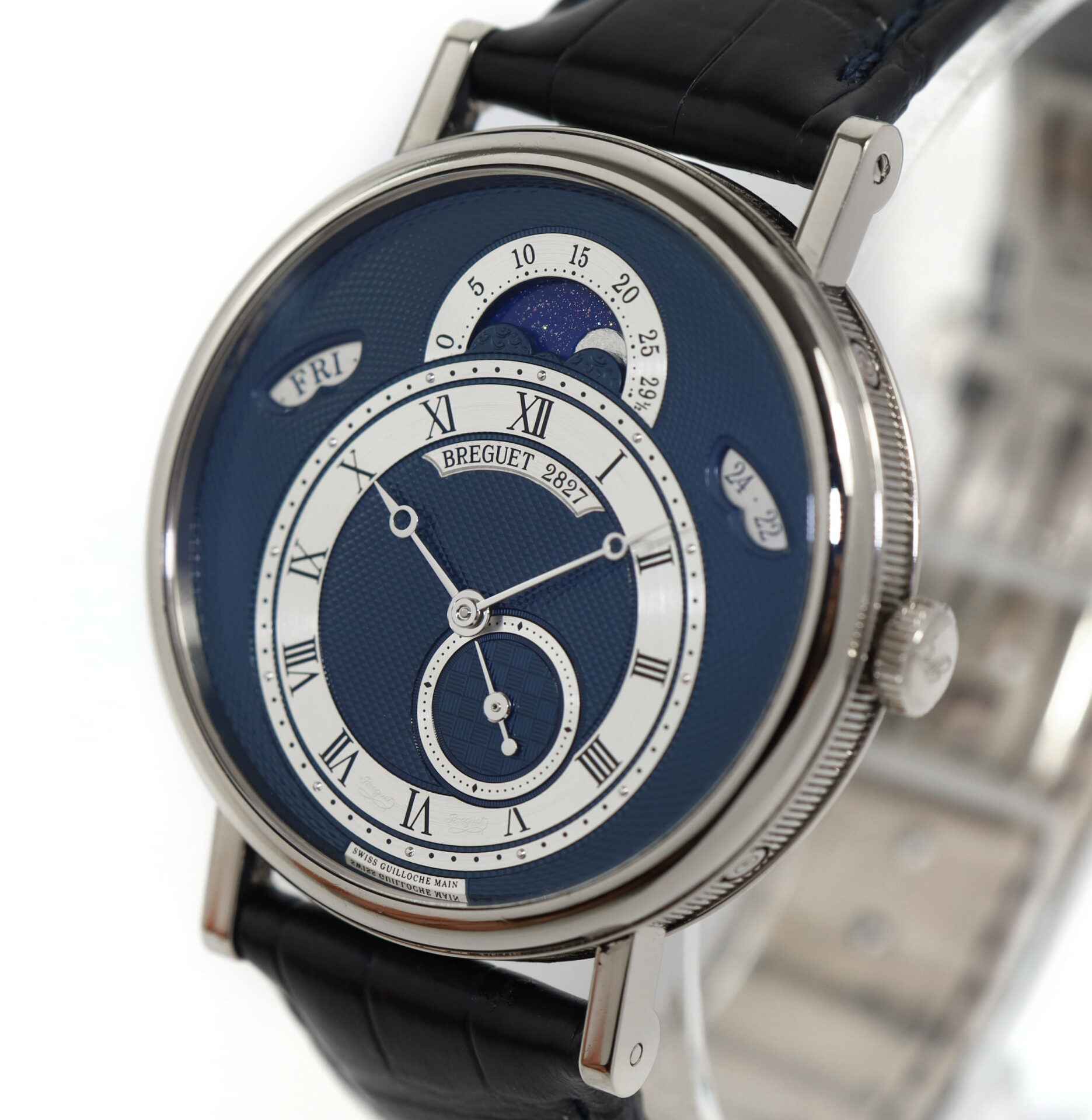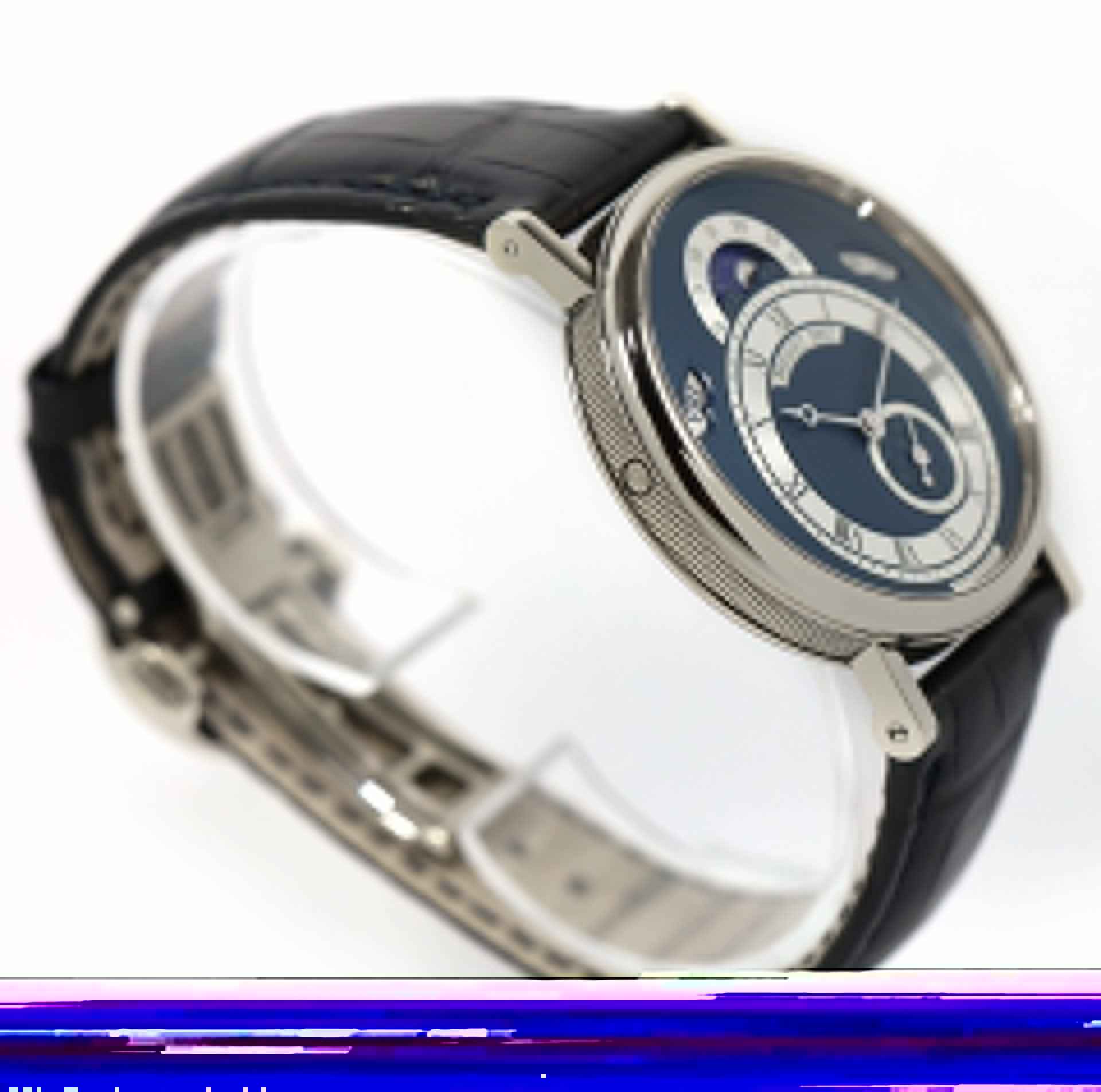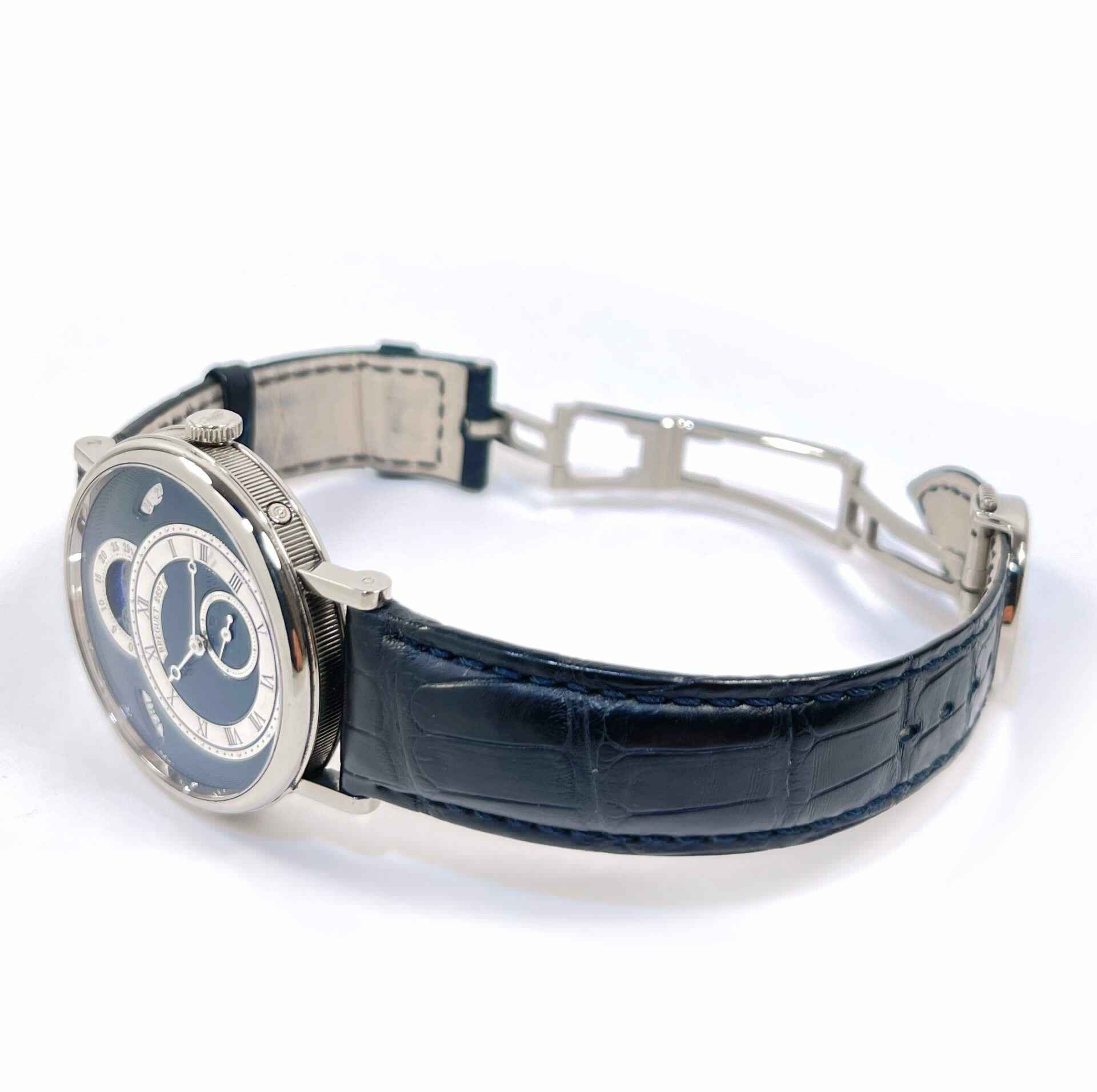 Read Morethis breguet is in excellent condition and shows minimal signs of wear consistent with regular use. This watch comes as watch only and features a white gold case that surrounds a beautiful blue dial showing the date, the day, the phases and age of the moon with a sapphire caseback. The bracelet on this watch is a breguet blue leather band with a white gold buckle as shown in the pictures attached. This watch is in stock and available to ship immediately!
