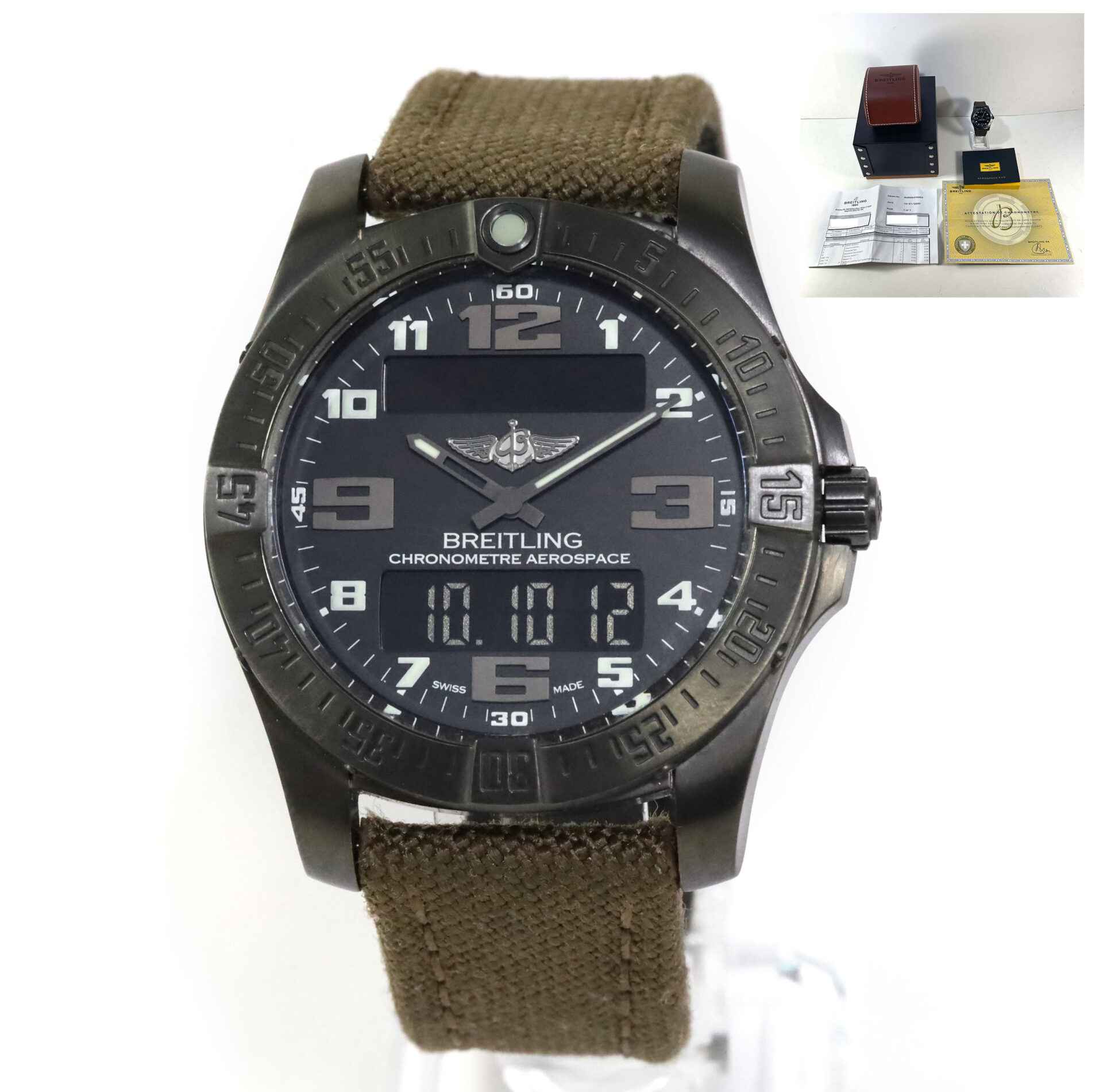 Read Morethis breitling is in excellent condition and comes with box, papers, and service history papers. this breitling is a quartz watch that features crown-activated functions including 1/100th of a second chronograph, countdown timer, second time zone, alarm, audible time signal (minute repeater) and calendar. This watch is in stock and available to ship immediately!