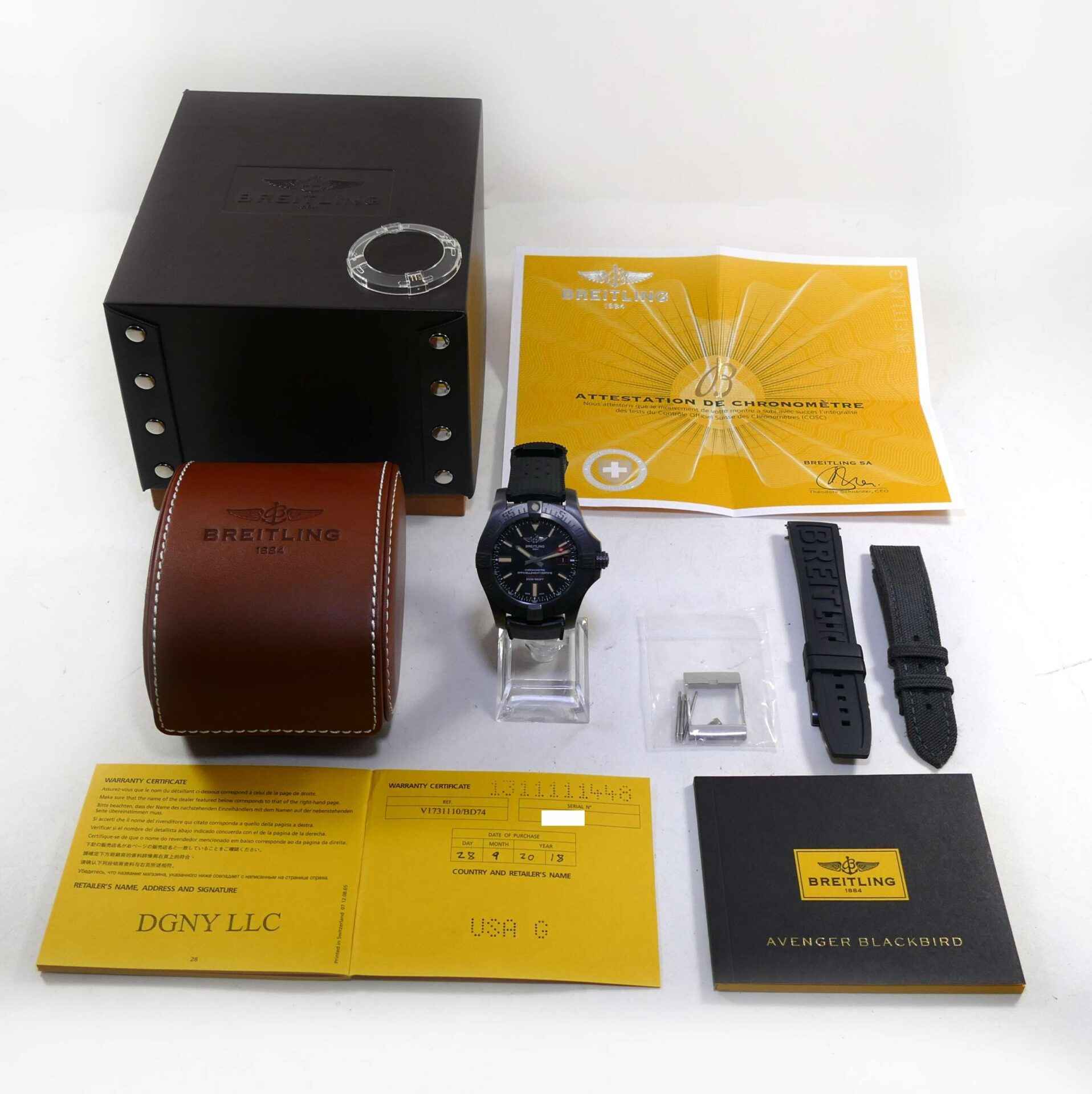 this breitling avenger is in good condition and comes with its original box, papers, two additional breitling straps, one extra buckle, and the bezel protector. The strap currently on the watch is an “uncle seiko” strap. The warranty card for this watch is dated september 28th, 2018.