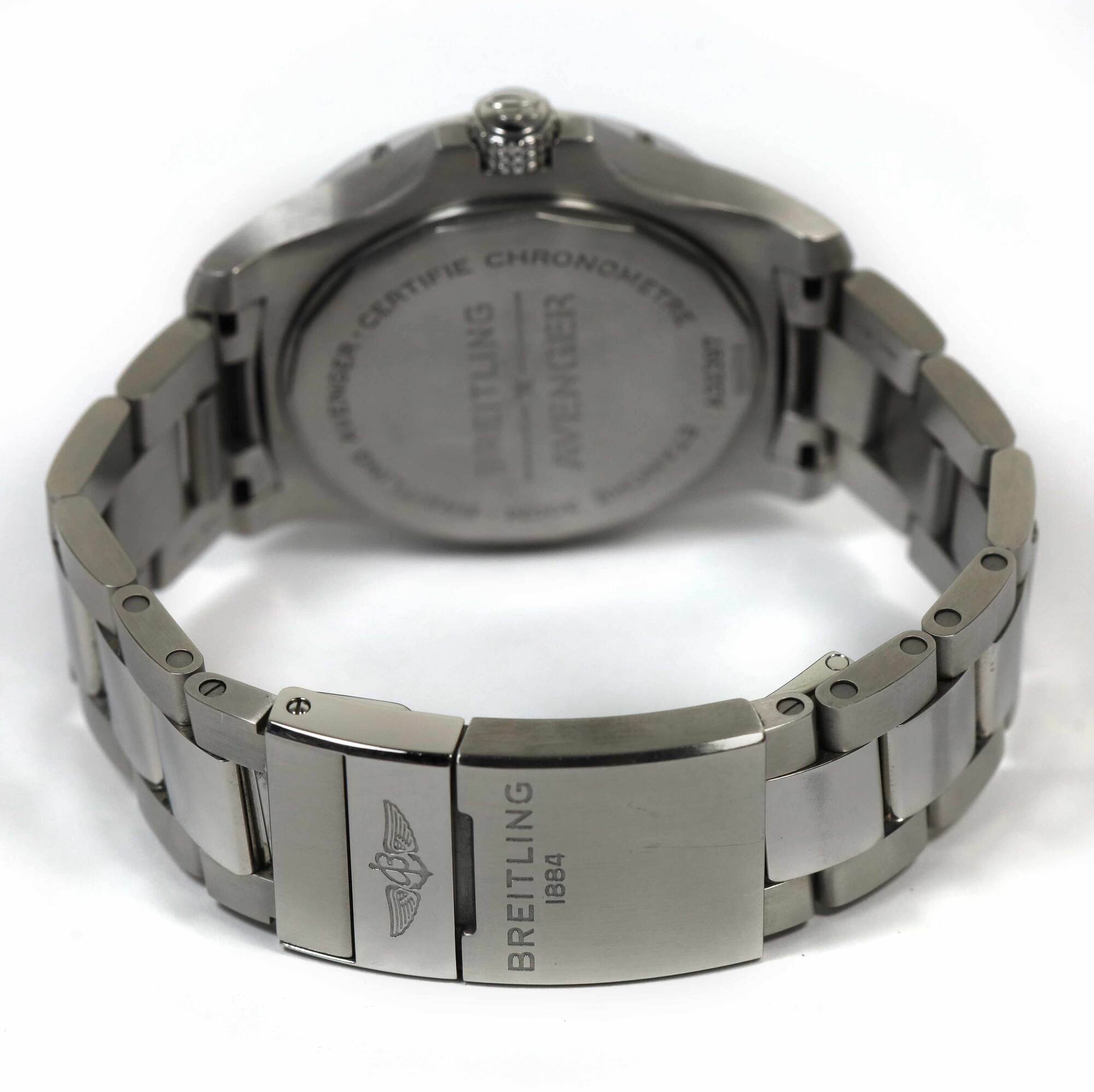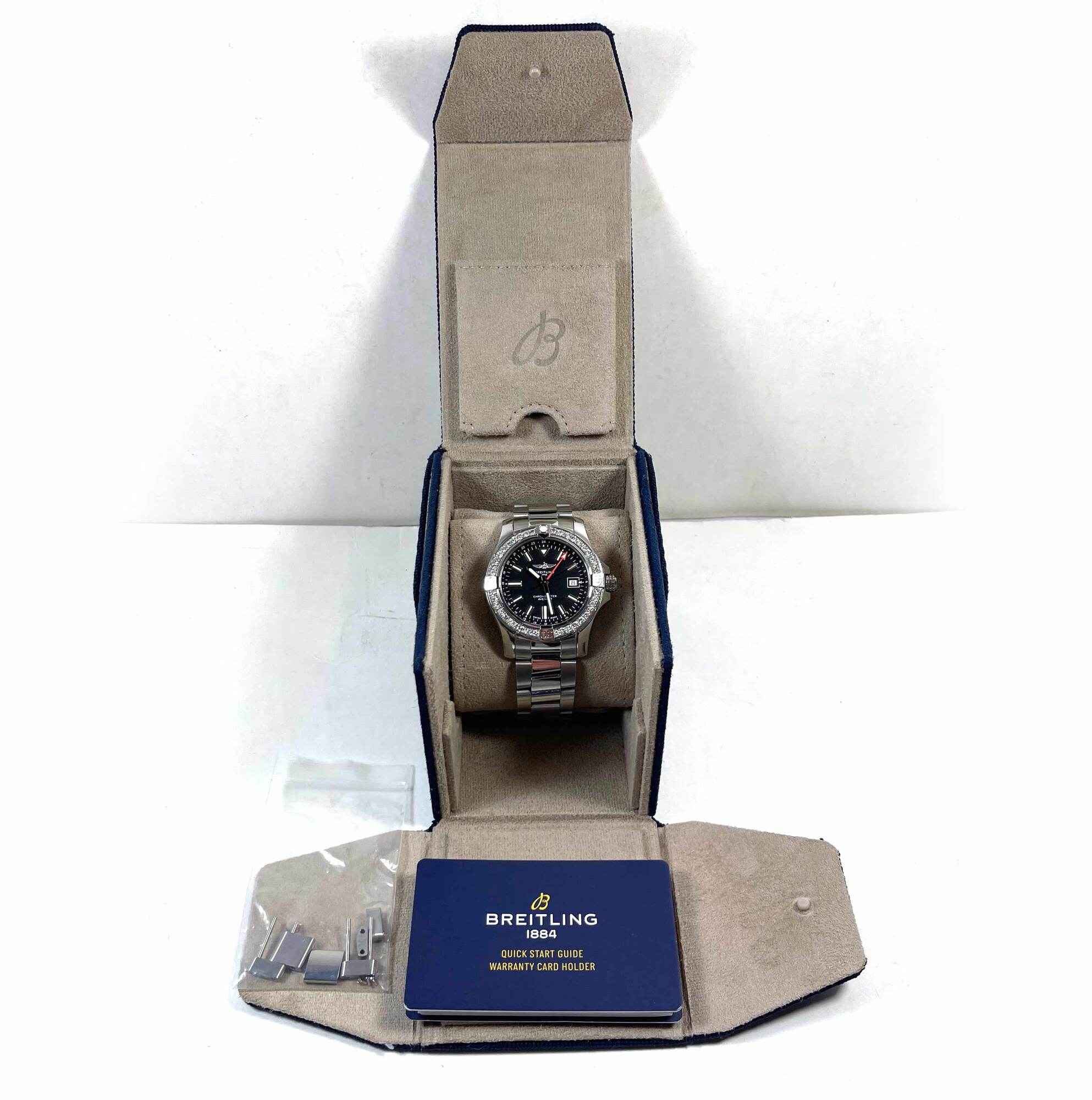 THIS BREITLING IS IN EXCELLENT CONDITION AND COMES WITH ITS BOX, BOOKLETS, AND SPARE LINKS AS SHOWN IN THE PICTURES ATTACHED. THIS WATCH FEATURES A 43MM STAINLESS STEEL CASE THAT SURROUNDS A BLACK DIAL WITH A CUSTOM DIAMOND BEZEL AND COMES ON A STEEL BRACEL...