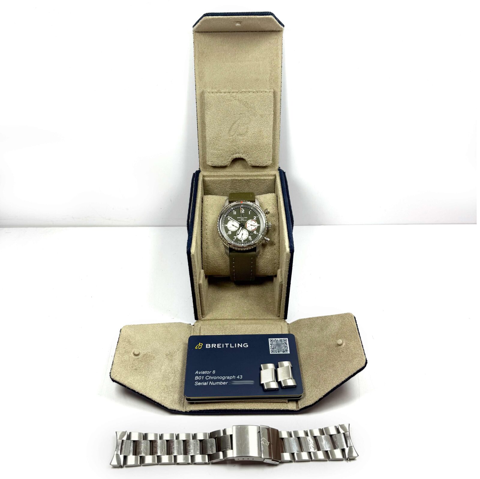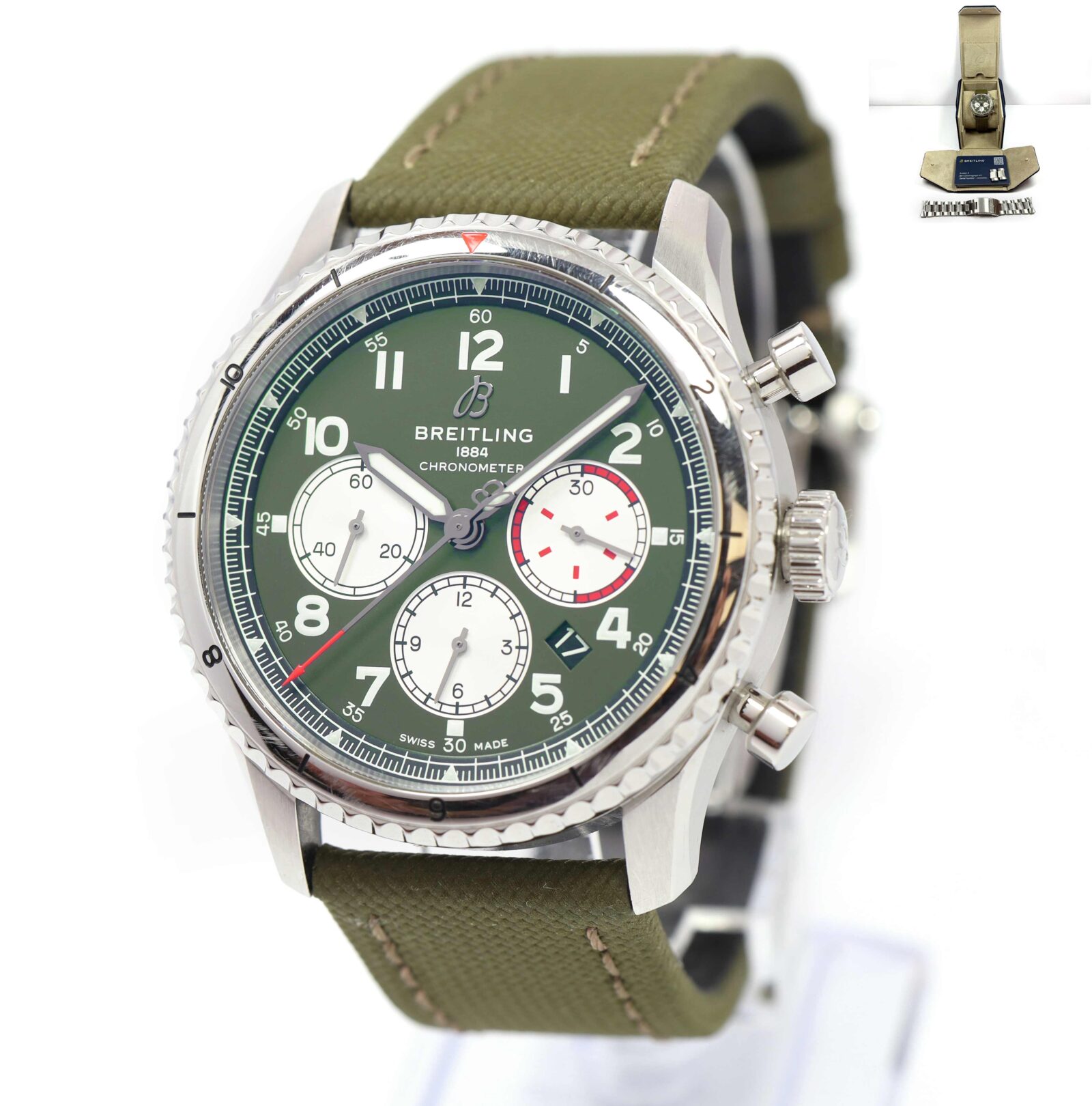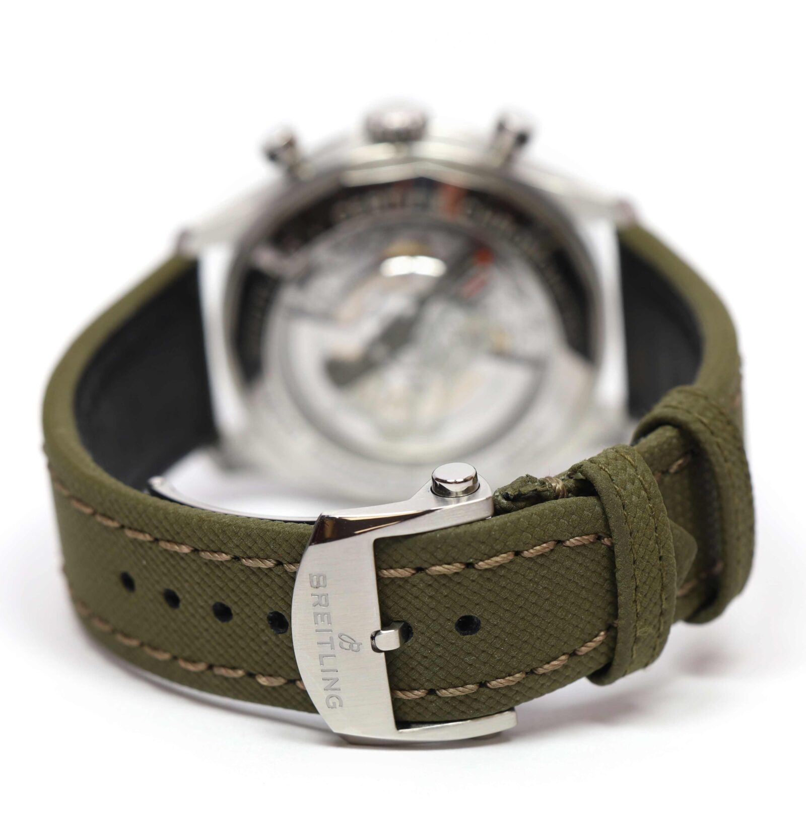 Read Morethis breitling watch is in good overall condition, showing some light signs of surface wear consistent with preowned watches. This comes complete with its original box, booklet, warranty card, and one additional breitling steel bracelet/spare links as shown in the photos. The watch was originally purchased on a stainless steel bracelet, and the previous owner added the green strap as an extra. This watch is currently in stock and available to ship immediately!