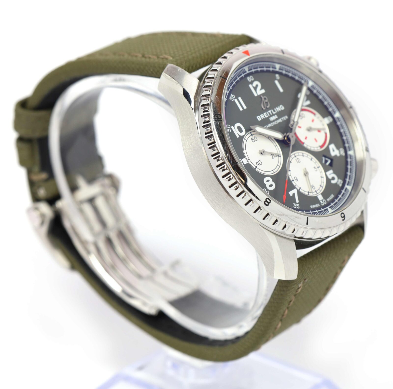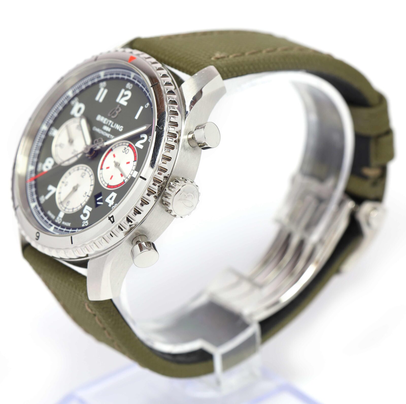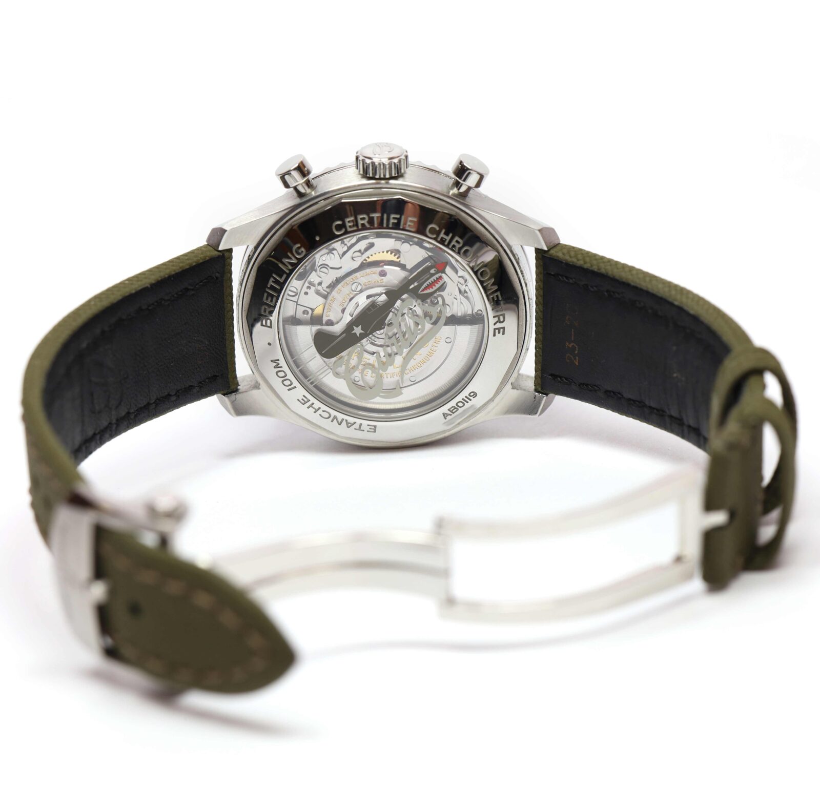 Read Morethis breitling watch is in good overall condition, showing some light signs of surface wear consistent with preowned watches. This comes complete with its original box, booklet, warranty card, and one additional breitling steel bracelet/spare links as shown in the photos. The watch was originally purchased on a stainless steel bracelet, and the previous owner added the green strap as an extra. This watch is currently in stock and available to ship immediately!