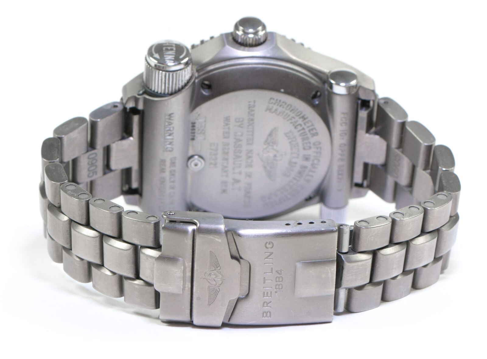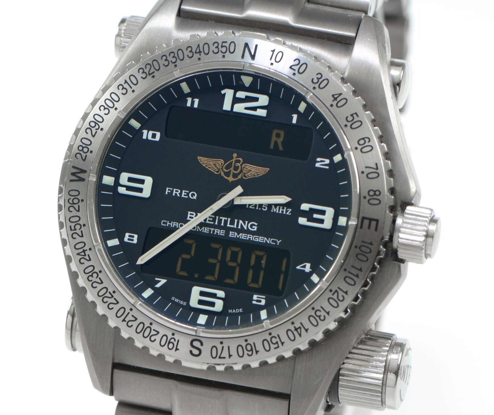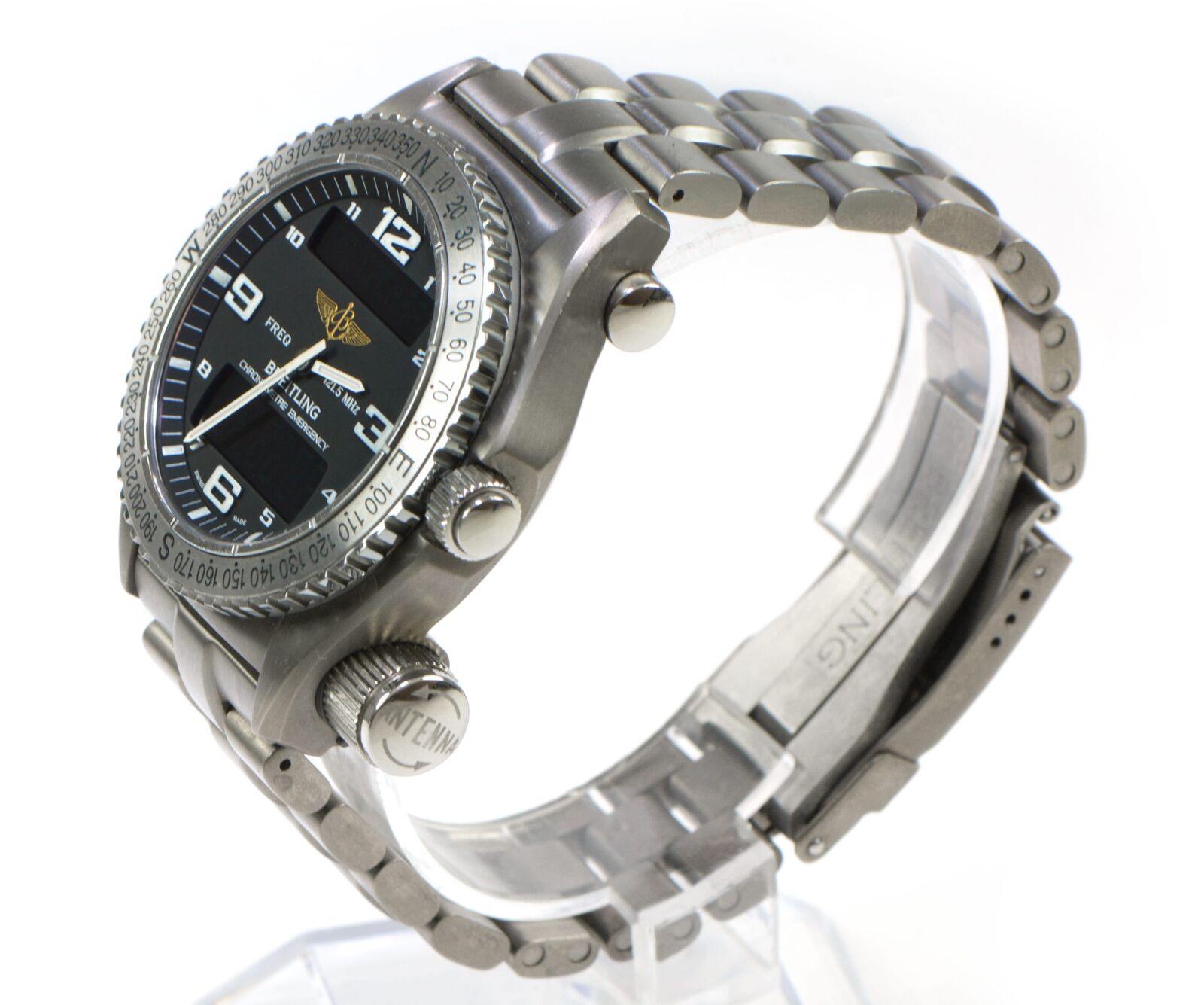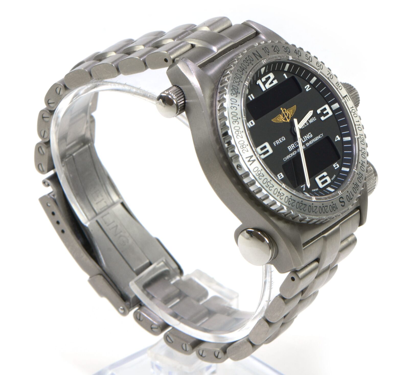 condition: pre-owned brand breitling series emergency movement quartz case diameter (mm) 43mm caseback solid dial black crystal sapphire band titanium functions warranty box no original box papers no original papers