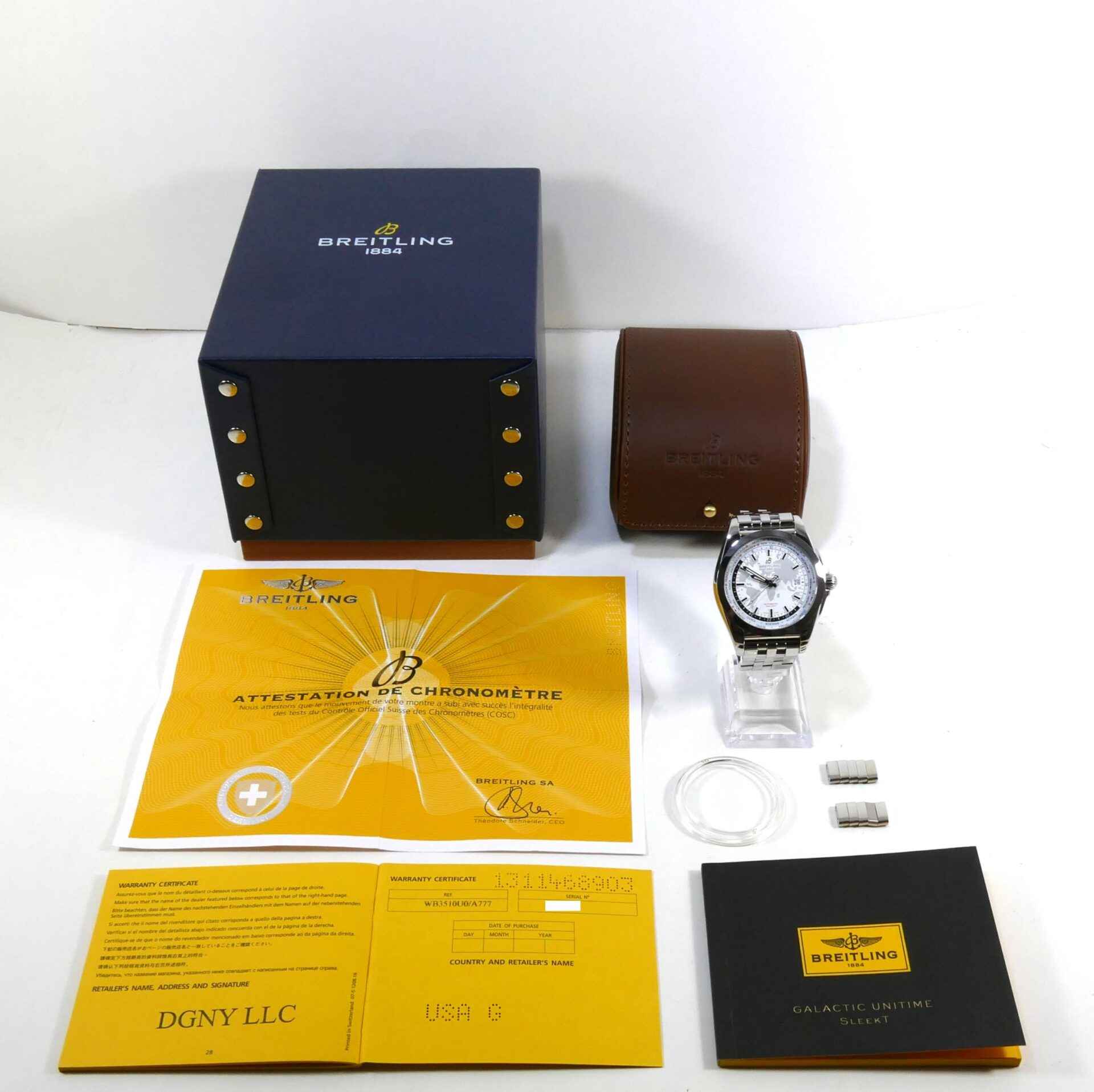 this breitling watch is in excellent condition and comes with box, papers, spare links, and bezel protector. This watch is in stock and available to ship immediately!
