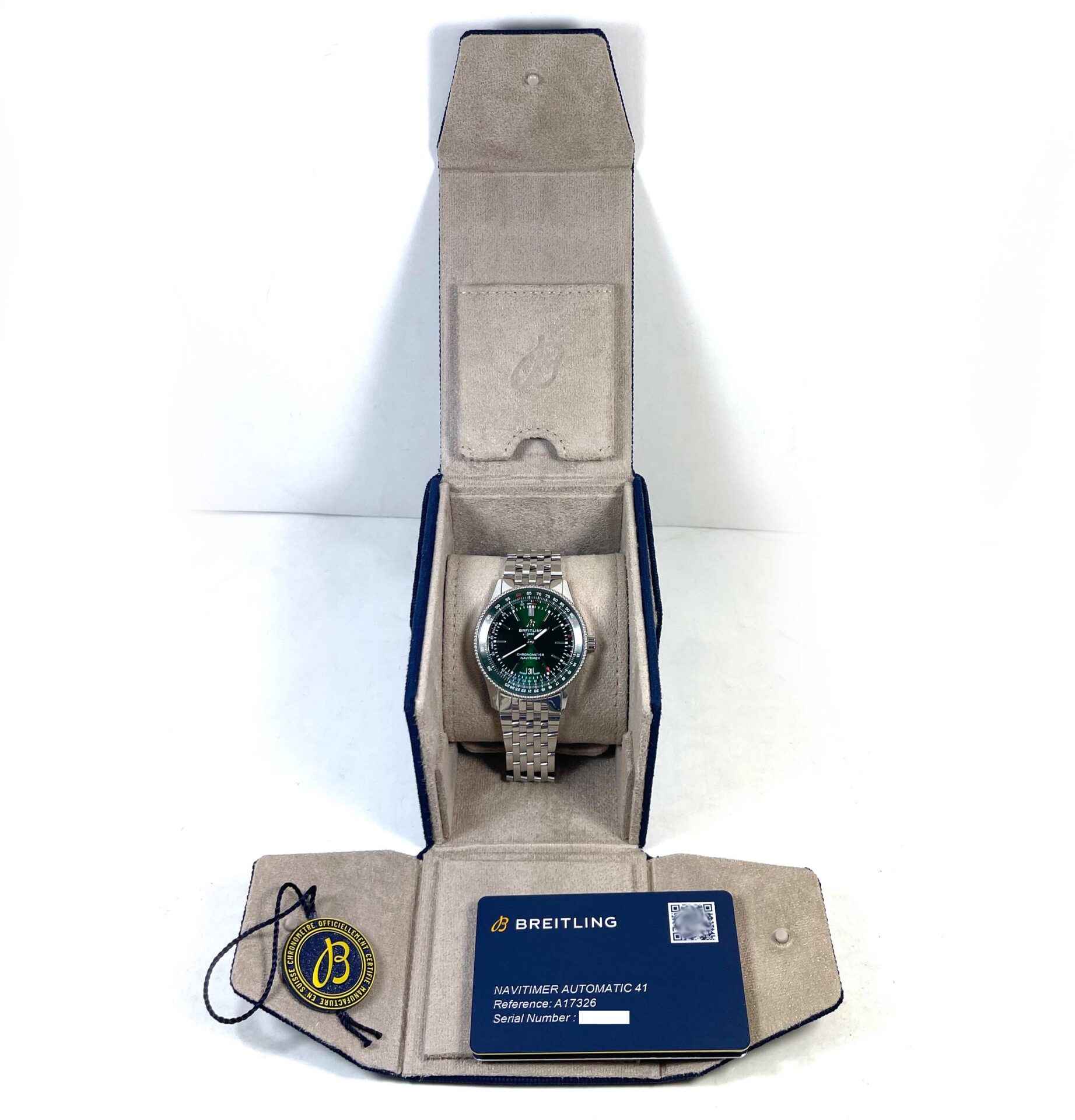 This Breitling is in excellent condition and comes with its box, booklet, hang tag, and warranty card as shown in the pictures attached. This watch features a 41mm steel case that surrounds a green dial and comes on a st...