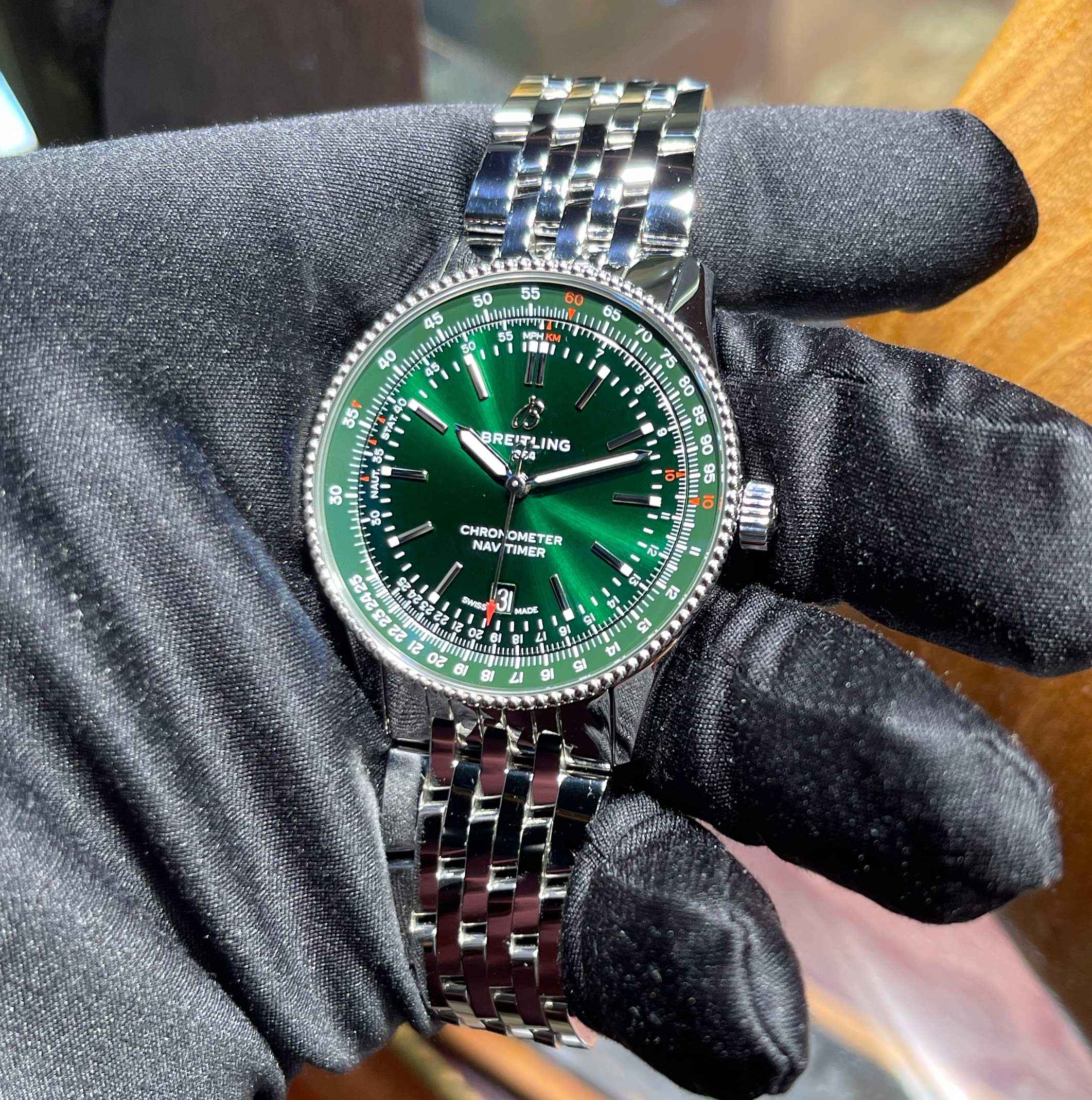 Read Morethis breitling is in excellent condition and comes with its box, booklet, hang tag, and warranty card as shown in the pictures attached. This watch features a 41mm steel case that surrounds a green dial and comes on a steel bracelet. This watch is in stock and available to ship immediately!