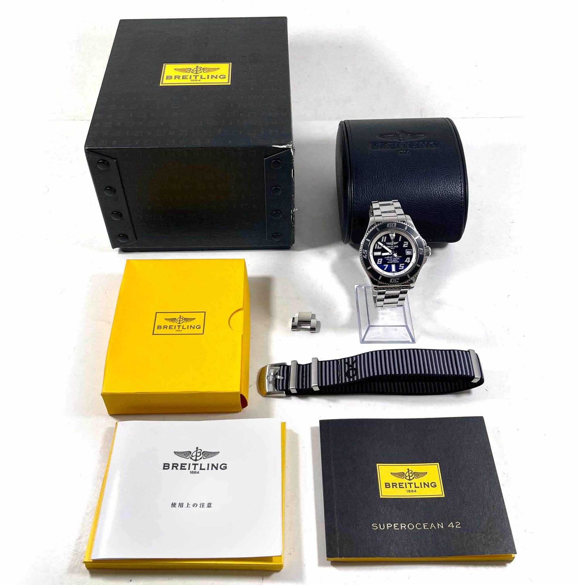 this breitling is in excellent condition and comes with its box, booklets, one spare link, and one additional breitling strap as shown in the pictures attached. This watch is in stock and available to ship immediately!