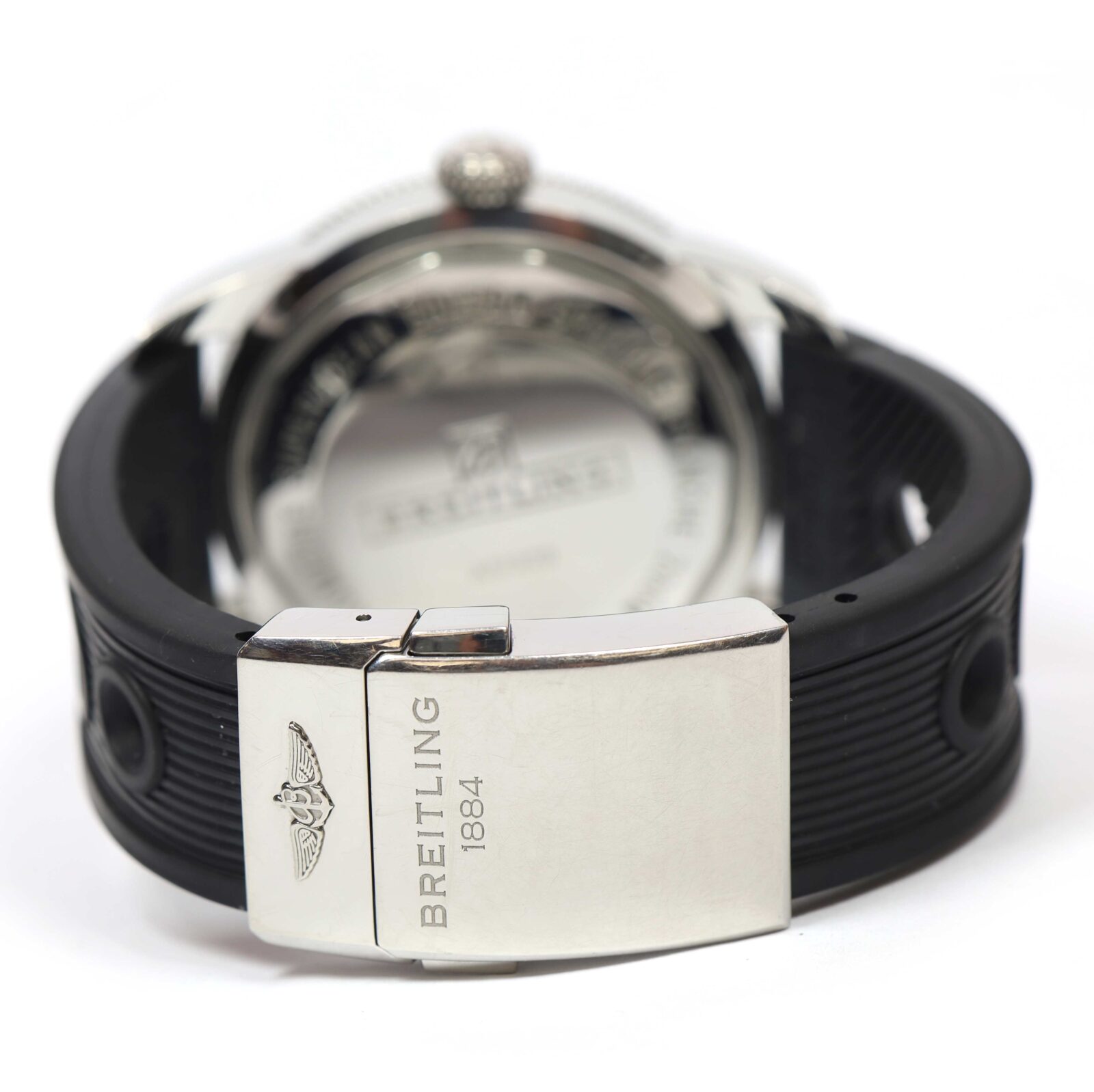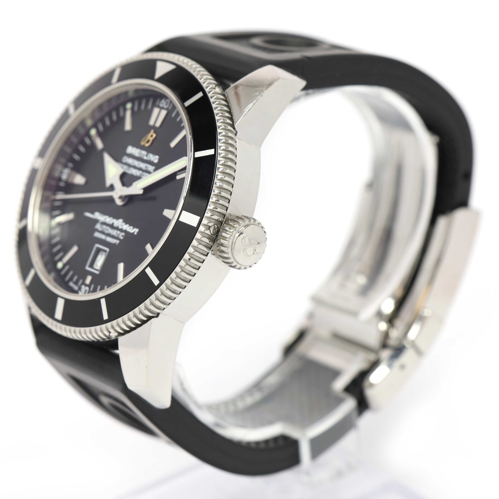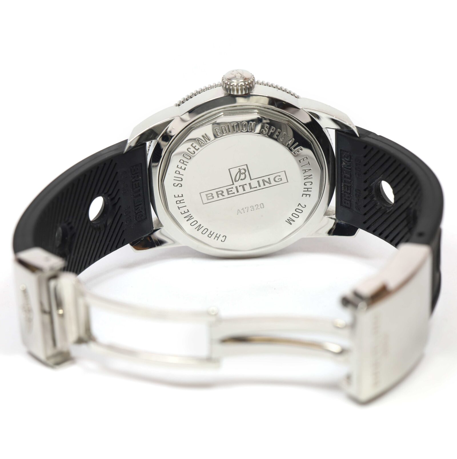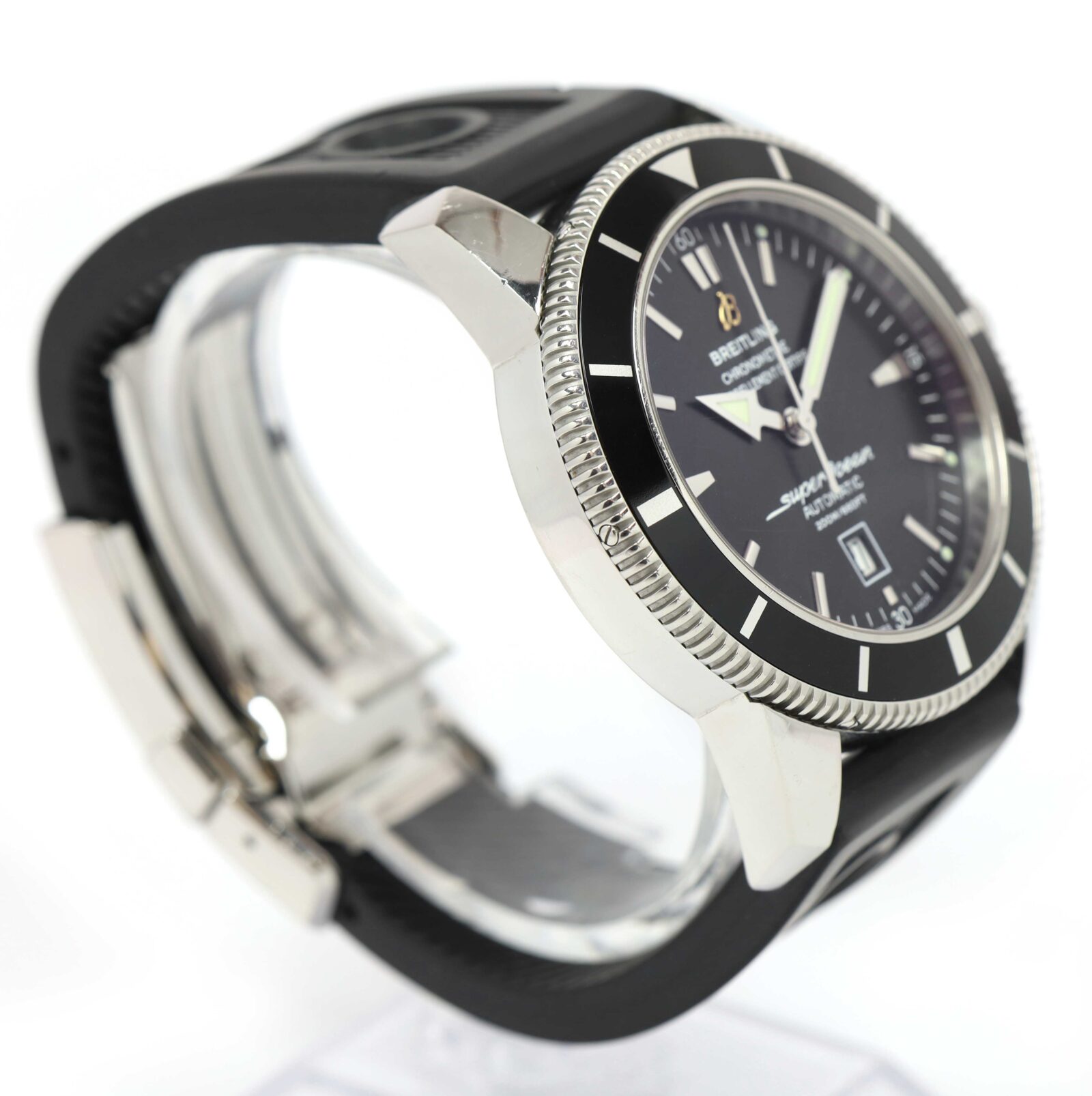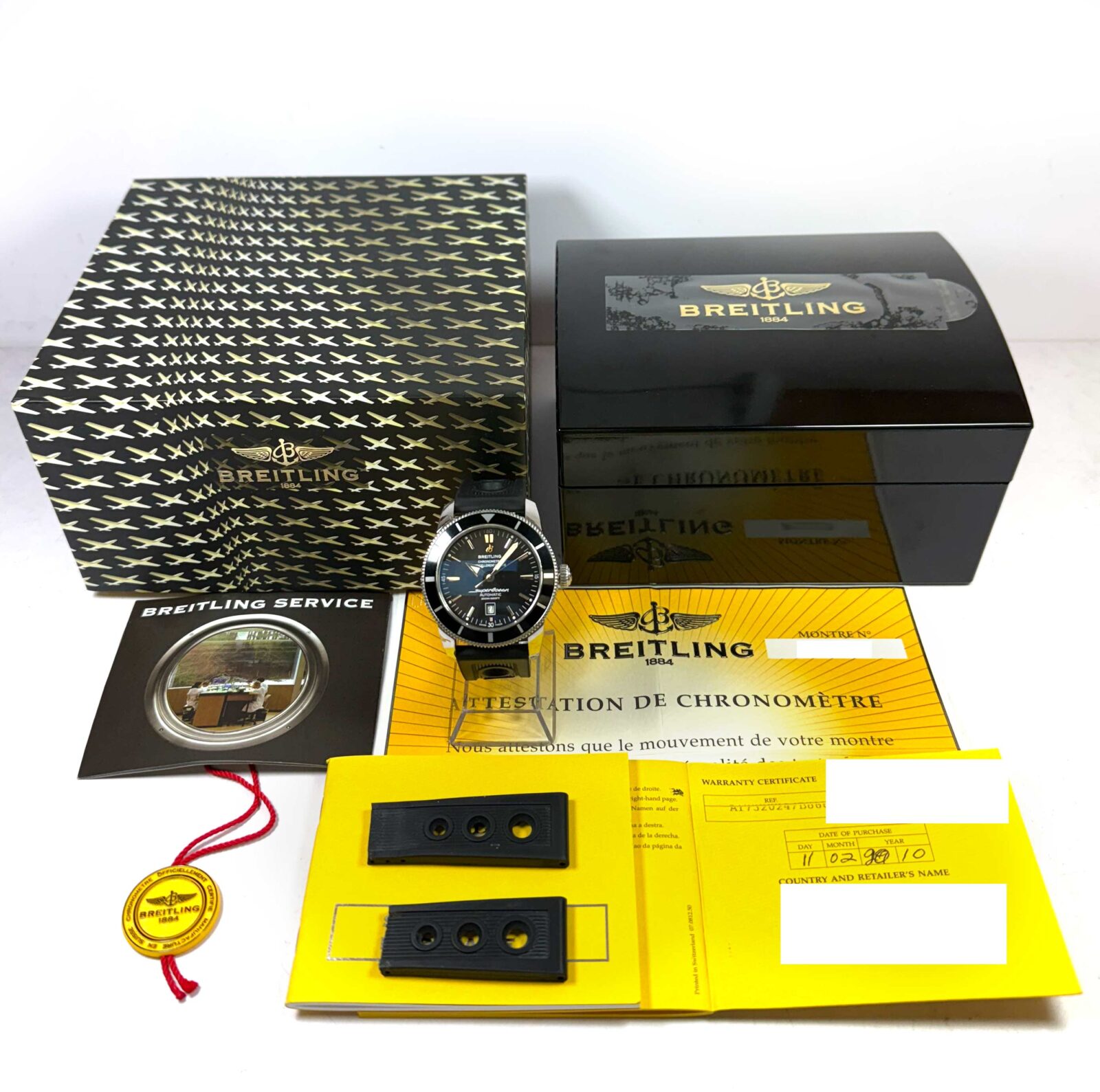 this breitling watch is in excellent overall condition and comes with its box, booklets, hang tag, one additional cut strap, and warranty paper dated february 11th, 2010 as shown in the pictures attached. This watch is in stock and available to ship immediately!