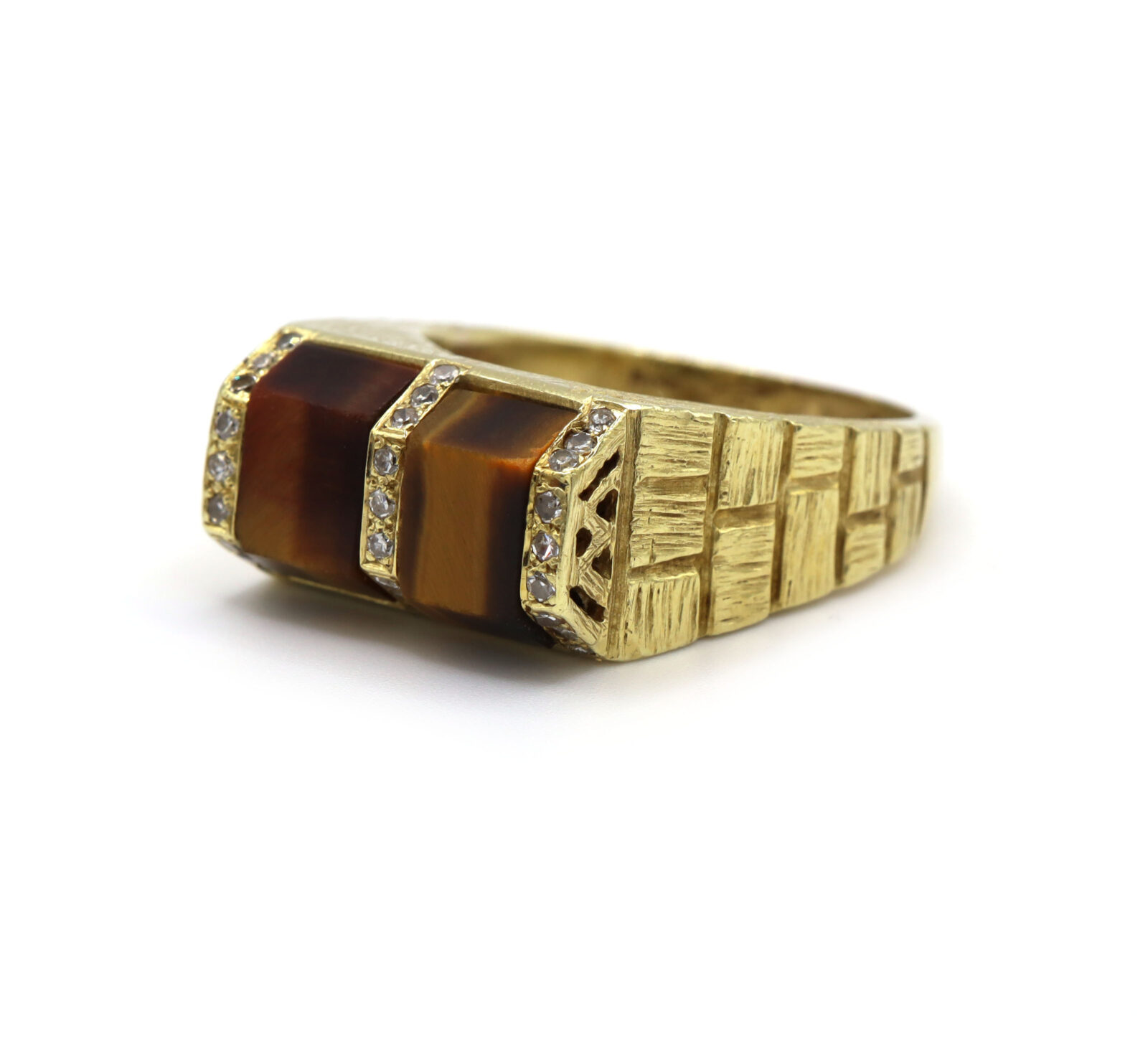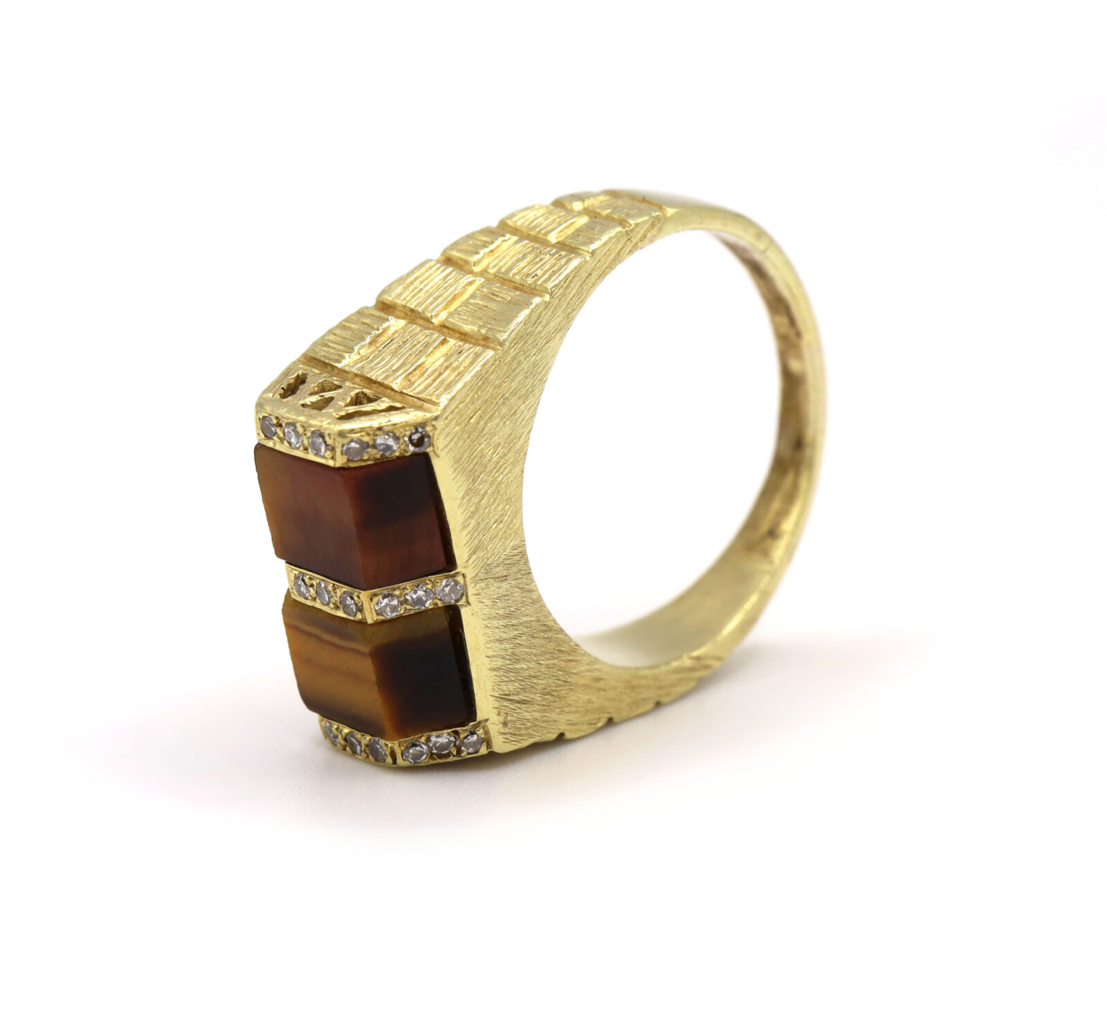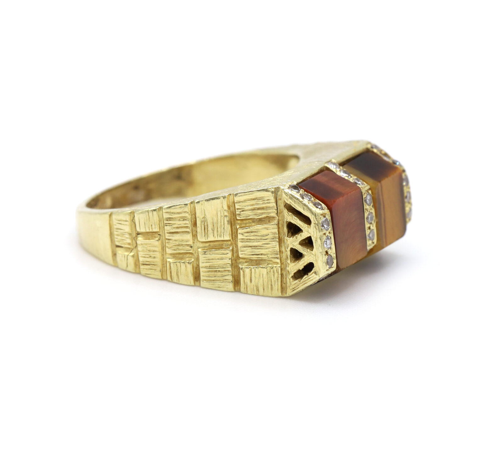 Brown Tigers Eye Diamond Brick 18K Yellow Gold Men’s Statement Ring
