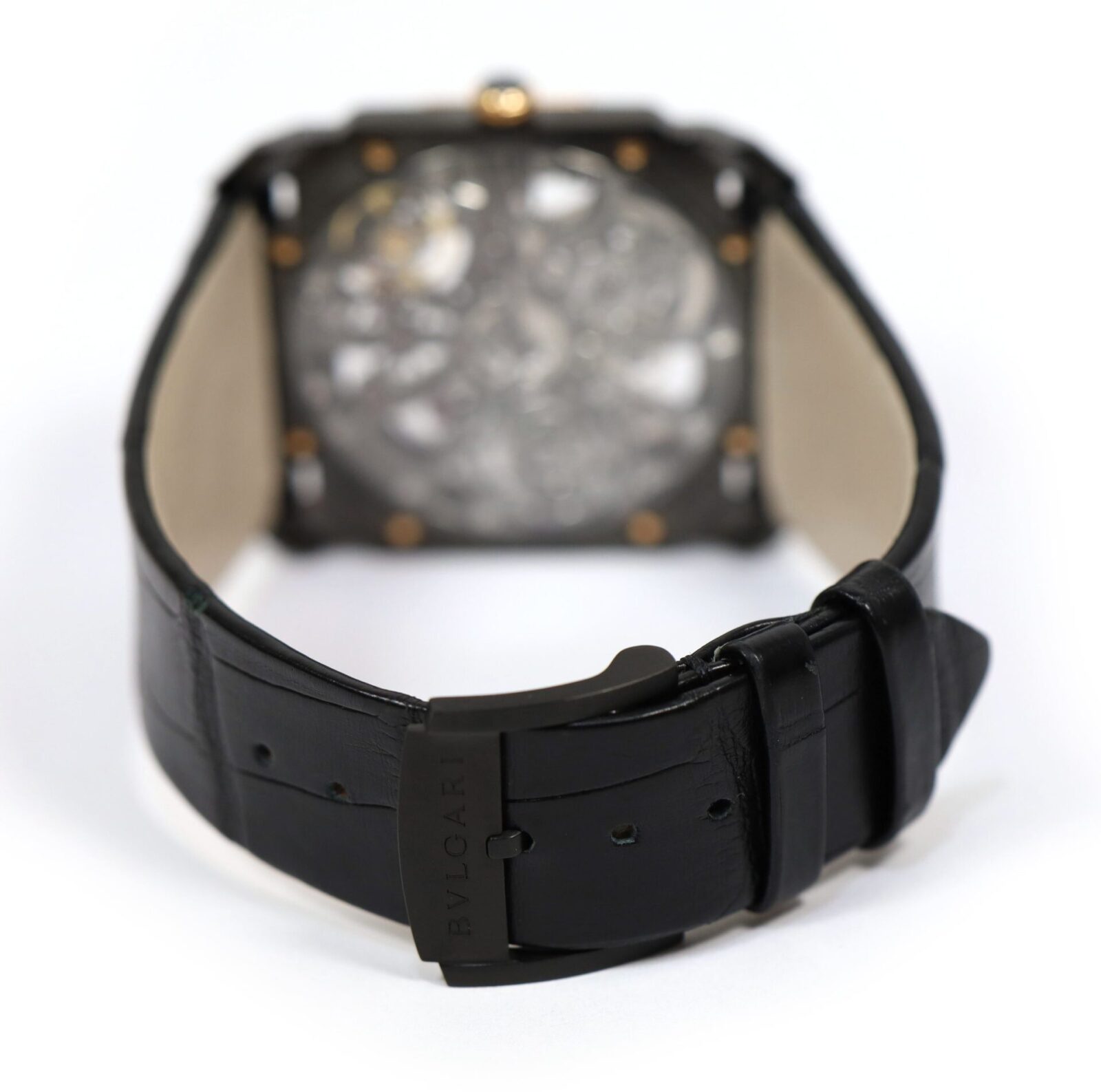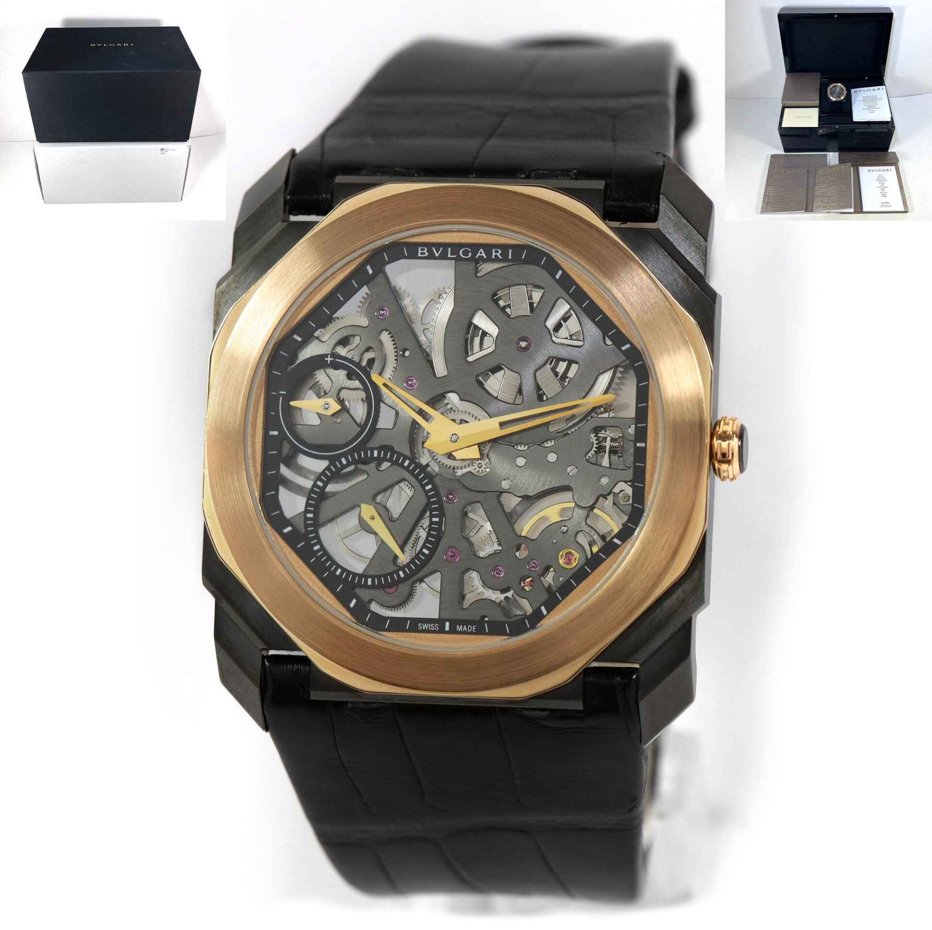 Read Morethis bulgari watch is in excellent condition and comes with its box, papers, and warranty booklet dated february 28th, 2017. This watch features a skeleton dial with an 18k rose gold bezel on a black leather strap as shown in the photos attached. This watch is in stock and available to ship immediately!