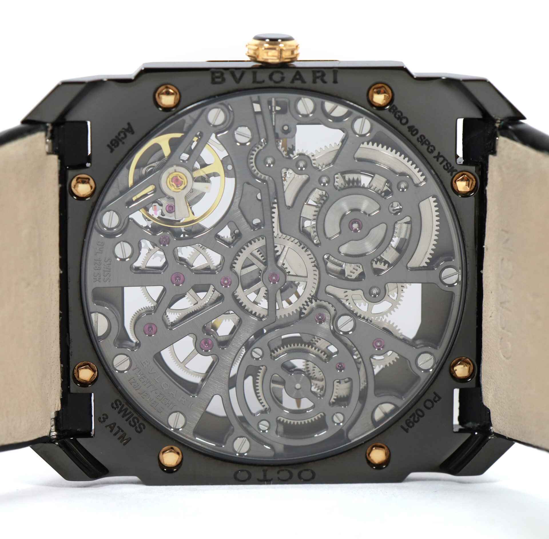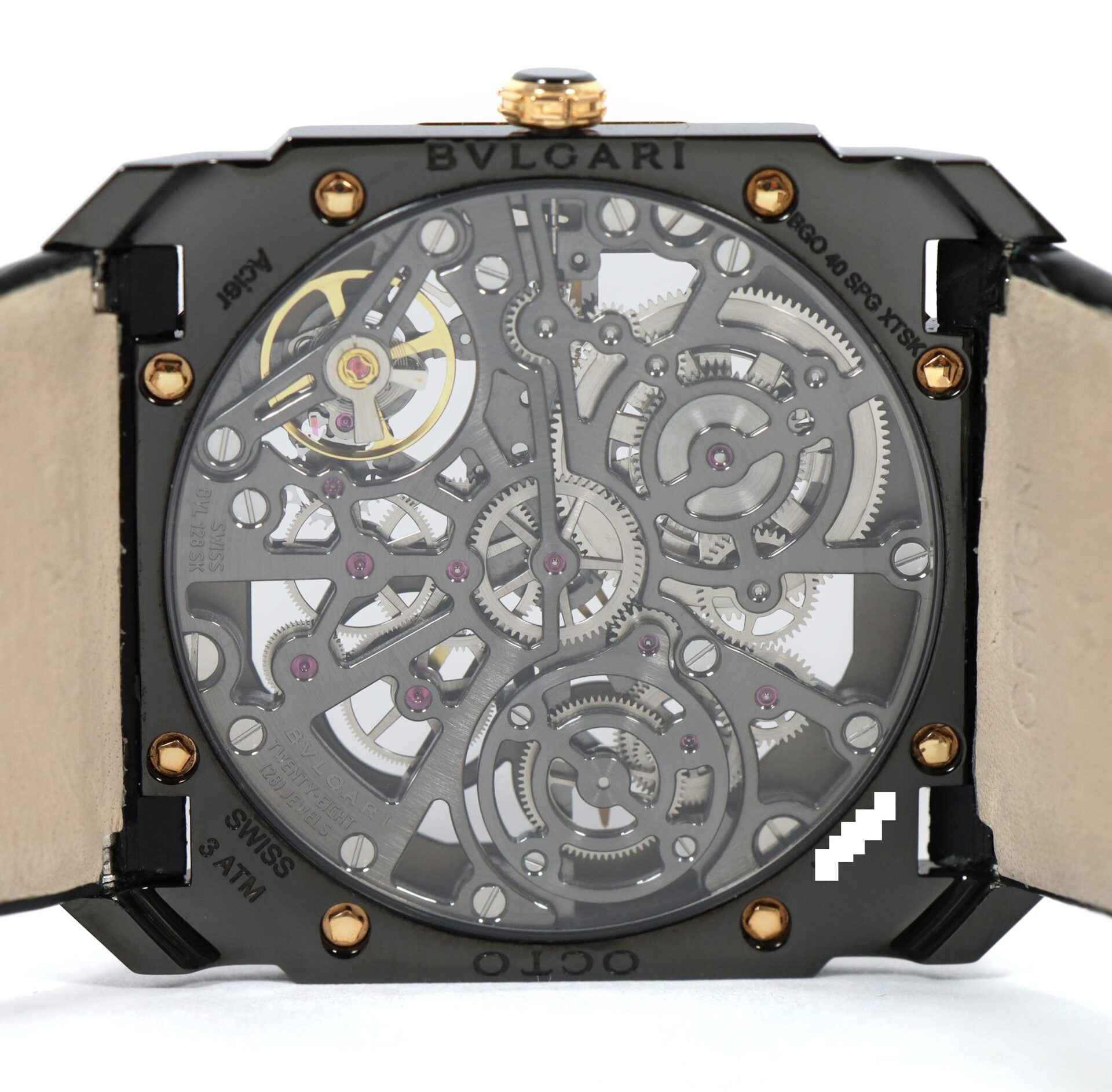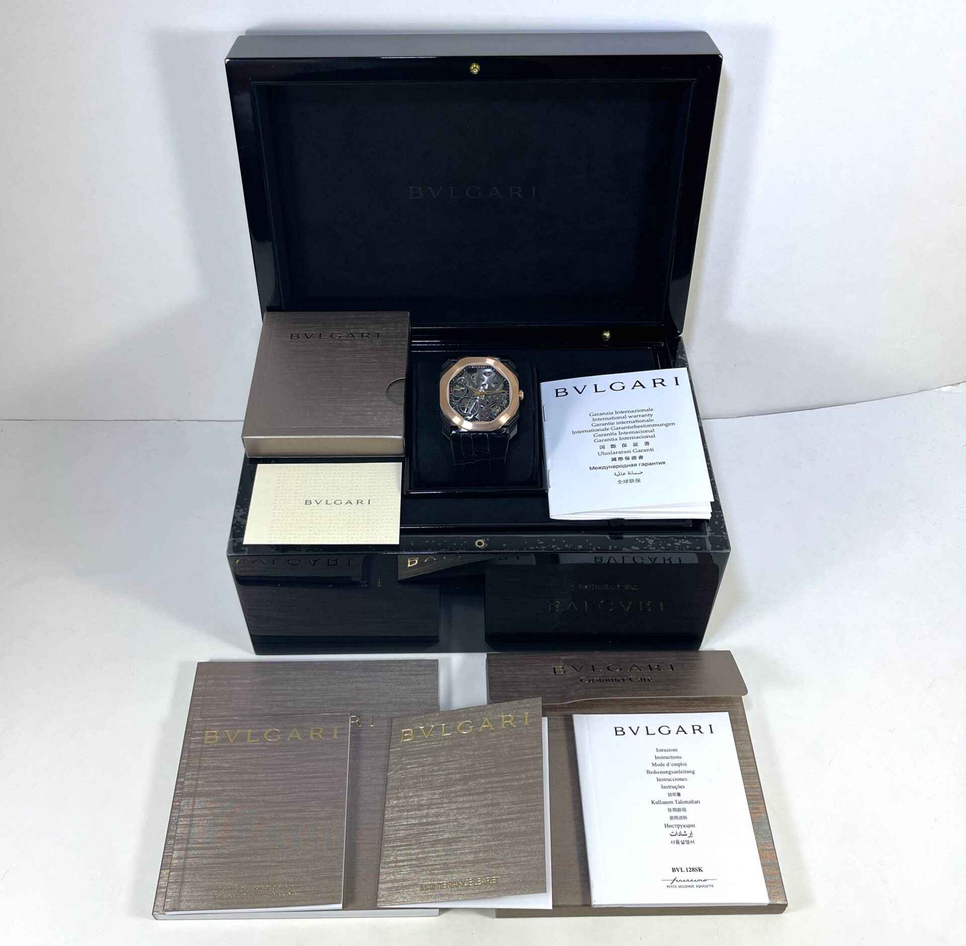 This Bulgari watch is in excellent condition and comes with its box, papers, and warranty booklet dated February 28th, 2017. This watch features a skeleton dial with an 18k Rose gold bezel on a black leather strap as show...