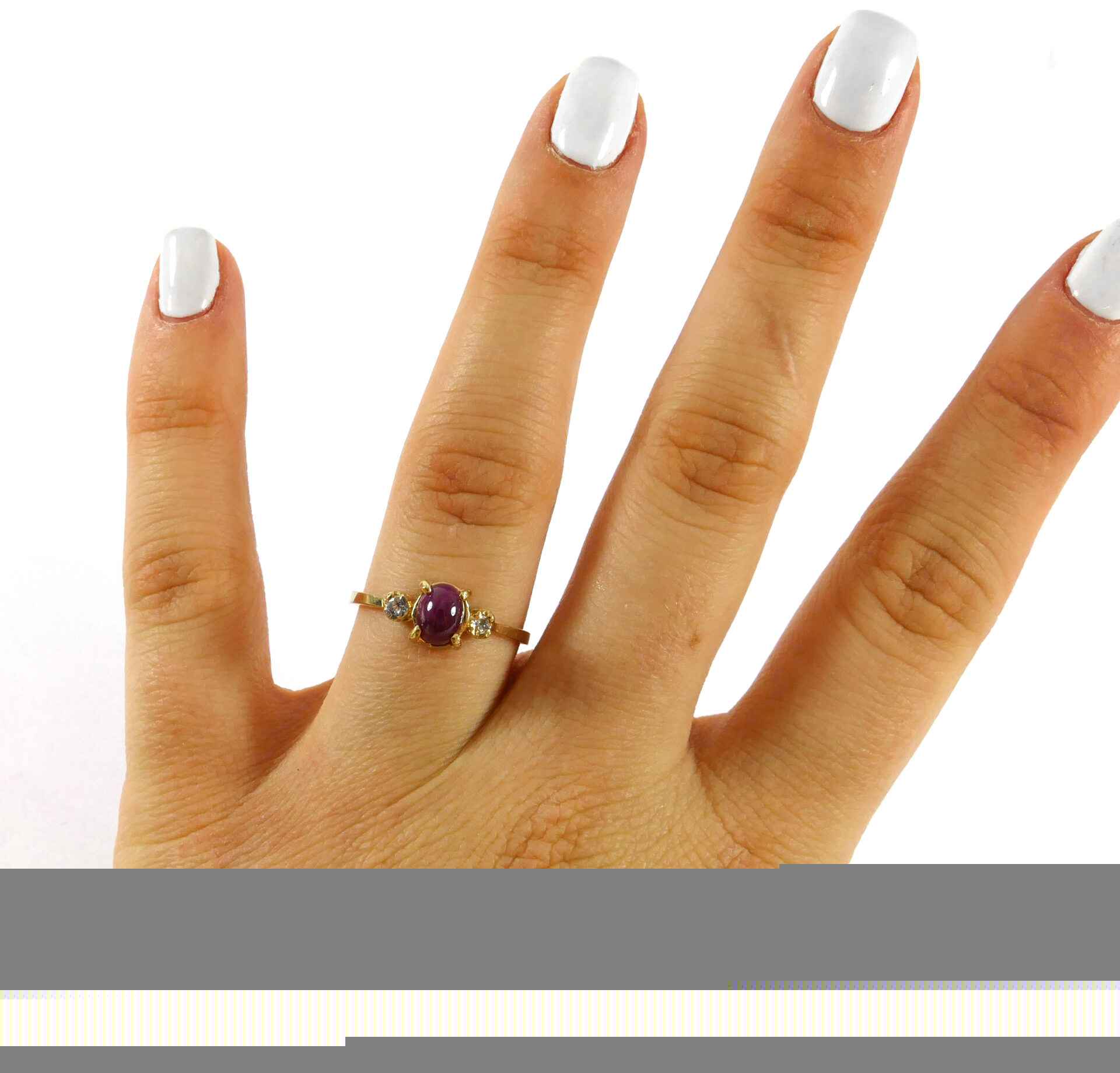 Product Description: This pretty ring has two accent diamonds surrounding a beautifully cabochon cut Ruby. The piece is crafted in 14k yellow gold. Every product is photog...
