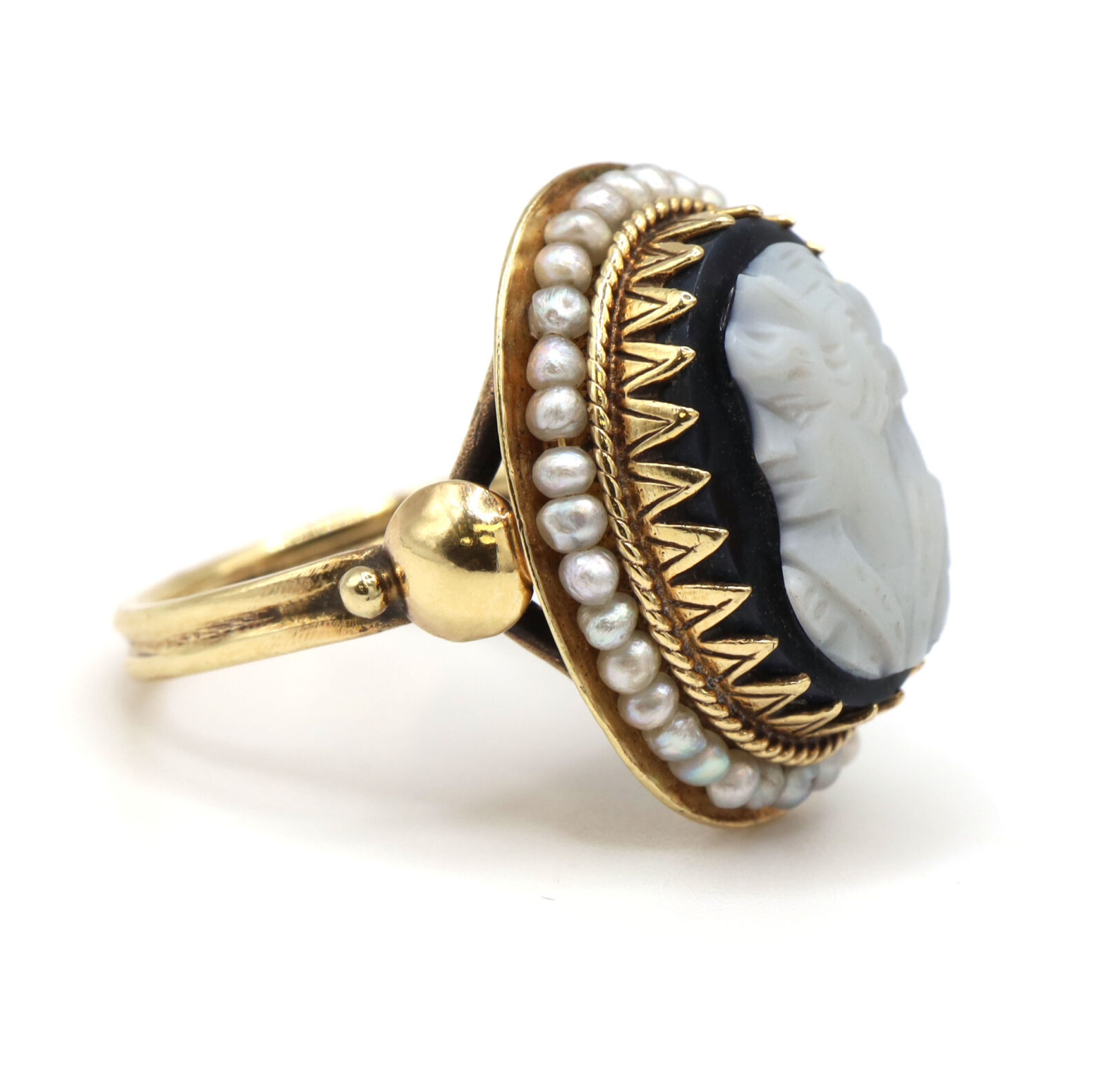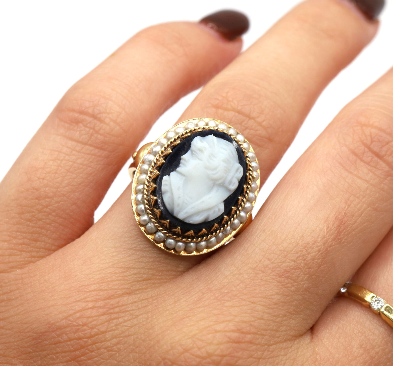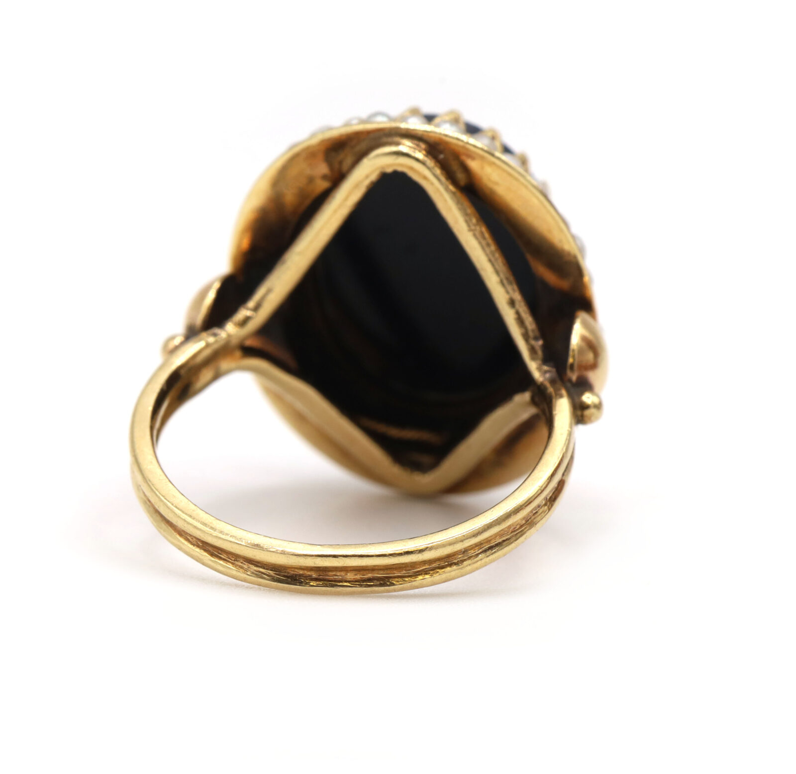 Ring Size: 7.5 Material: 14k Yellow Gold Width of Front: 22mm Width of Back: 2.5mm Weight: 6.85 grams Condition: Vintage Stone: Onyx & Pearl